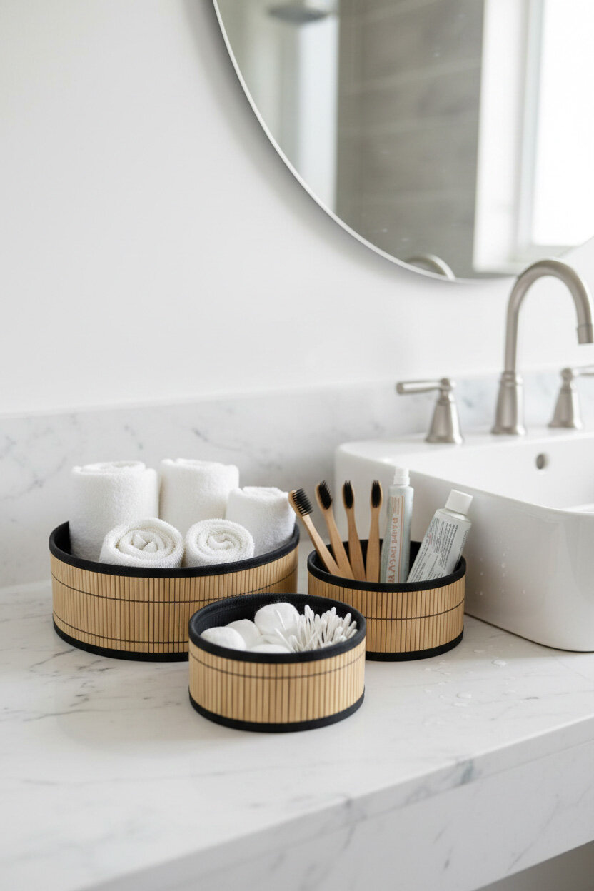 30 cm çapındaki geniş sepeti havlu veya dergiler için, orta boyu kişisel bakım ürünleri için, küçük boyu ise makyaj malzemeleri veya anahtarlık gibi eşyalarınız için kullanabilirsiniz. Banyo, yatak odası veya salon dekorasyonunuzu tamamlayacak estetik ve toparlayıcı bir çözümdür.