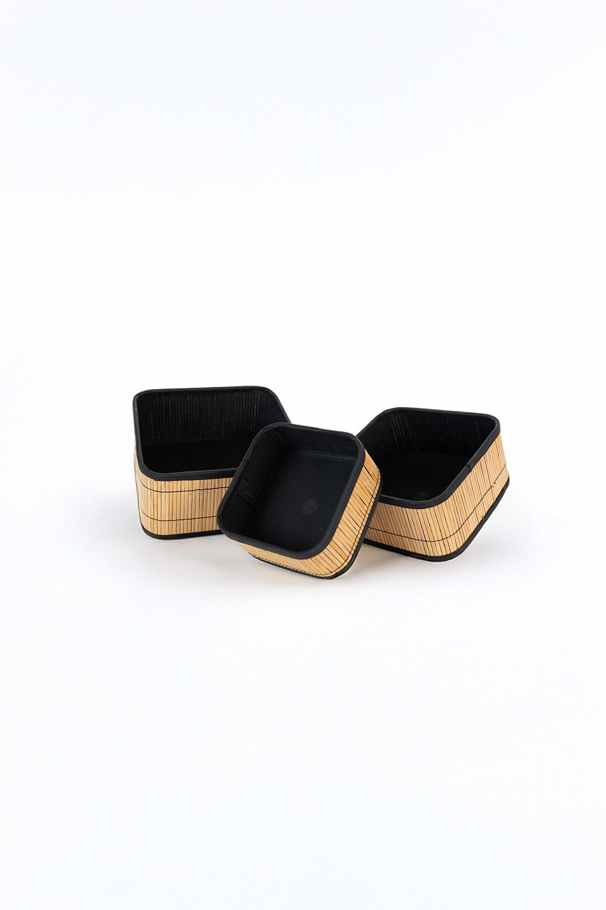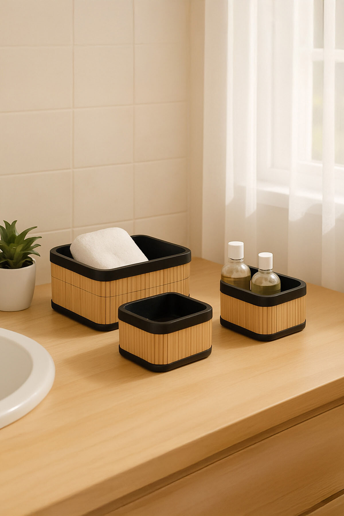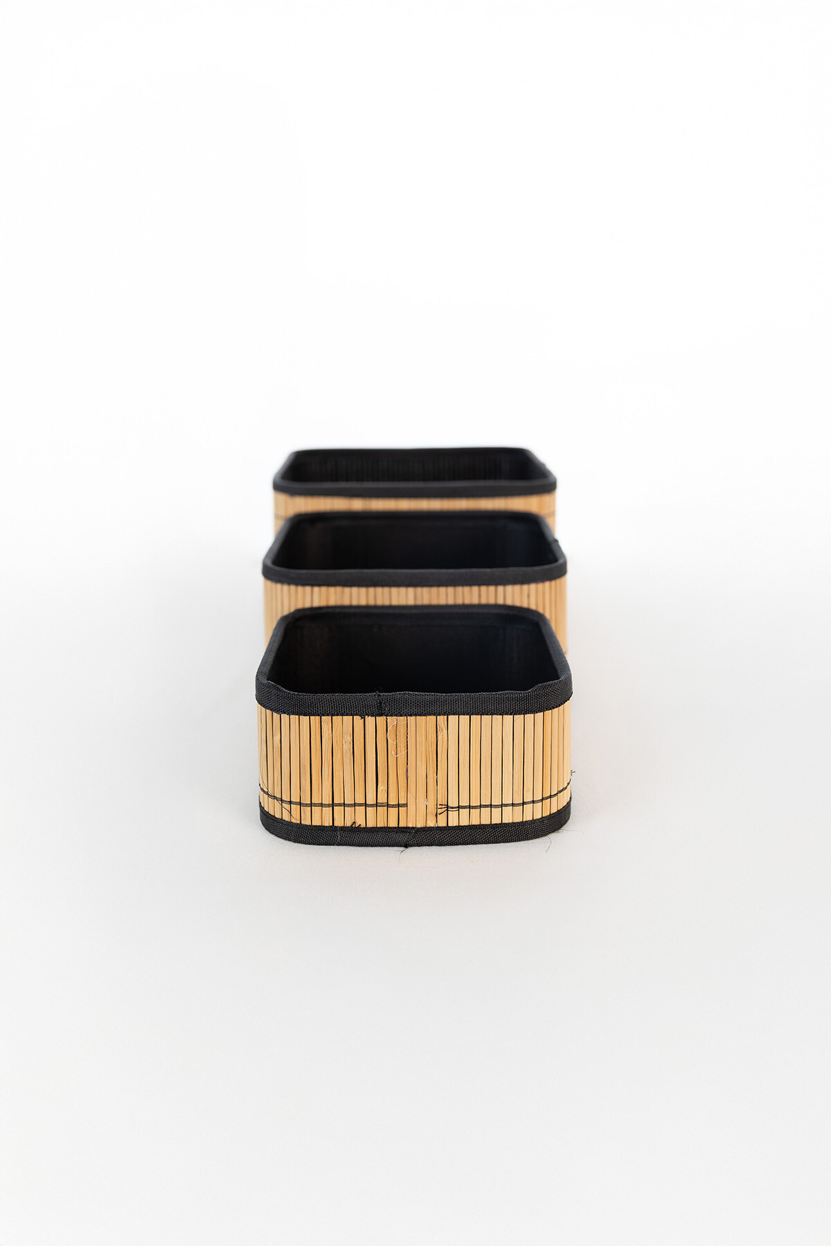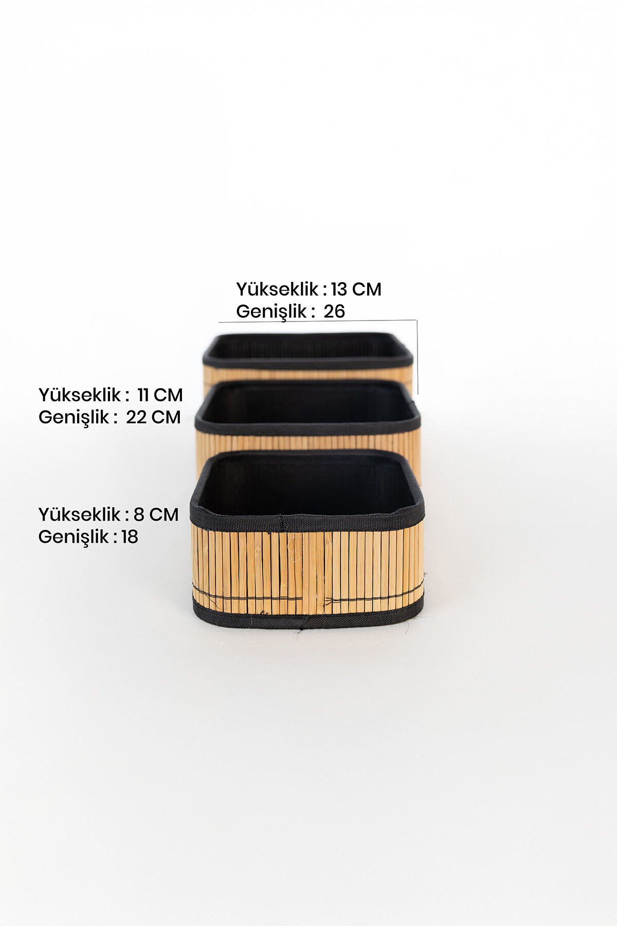 Minimalist tasarımı ve siyah detayları ile modern dekorasyona uyum sağlayan bambu sepetler; havlu, kozmetik, mutfak malzemeleri veya kişisel eşyalar için ideal bir saklama çözümüdür. Çevre dostu yapısı ile uzun yıllar güvenle kullanabilirsiniz.