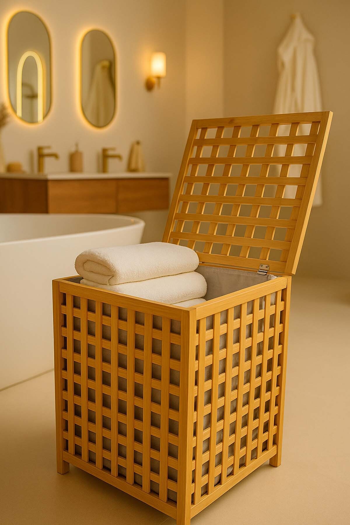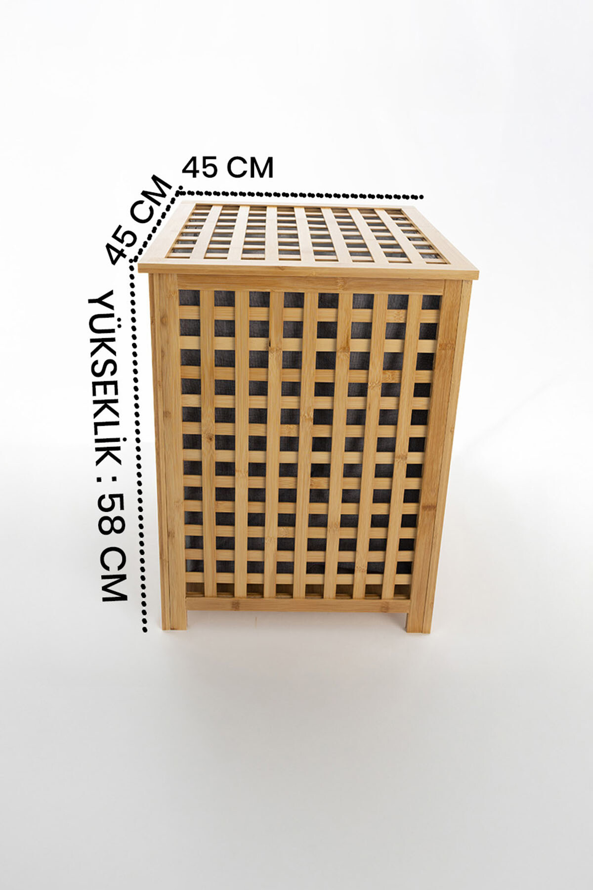 Modern ve şık tasarımıyla dikkat çeken Bambu Çamaşır Sepeti, 58 cm yüksekliği ve 45x45 cm kare ölçüleri ile geniş depolama alanı sunar. Doğal bambu çerçevesi sayesinde hem dayanıklı hem de çevre dostudur.