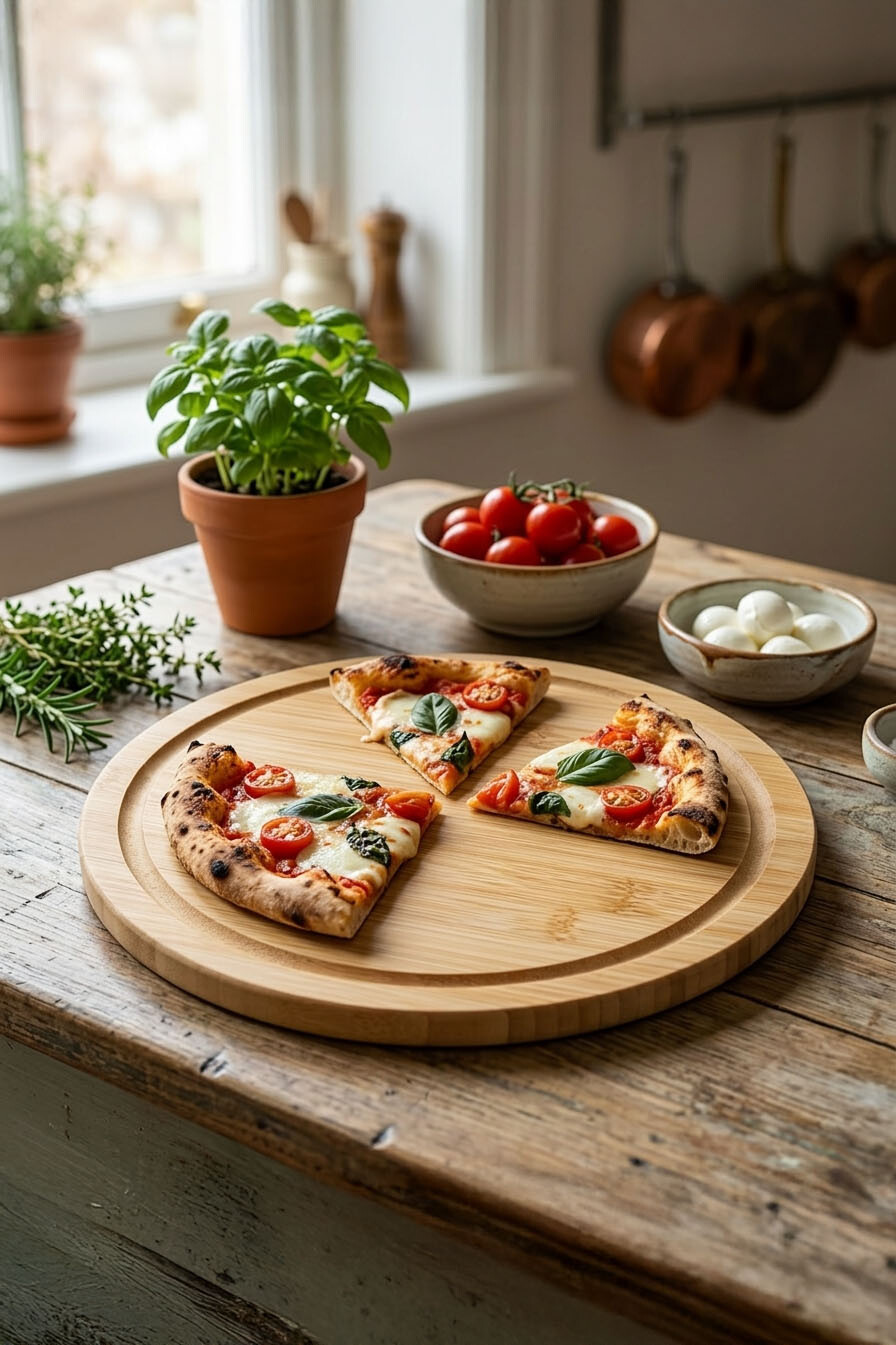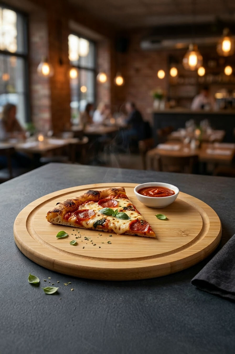 Pizza sunumlarınızı daha şık ve pratik hale getiren 26x26 cm bambu pizza tahtası, doğal bambu yapısı sayesinde dayanıklı ve uzun ömürlüdür. Yuvarlak tasarımı pizza servisleri için idealdir. Ev, restoran ve kafelerde kullanıma uygundur.