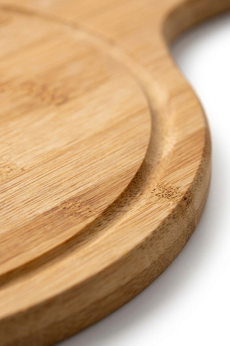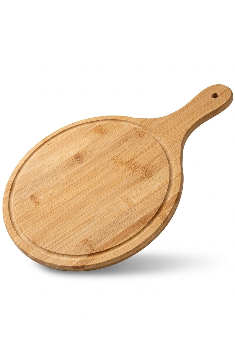 Doğal bambu malzemeden üretilen saplı pizza tahtası, pizzalarınızı kesmek ve servis etmek için ideal bir mutfak ürünüdür. Orta boy ölçüsü ve ergonomik sapı sayesinde kolay kullanım ve şık sunum sağlar.