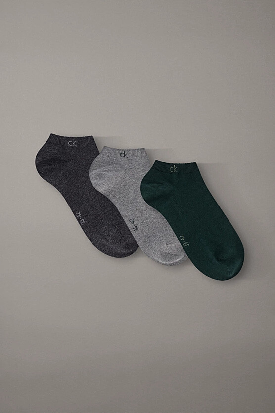 Günlük konforunuzu maksimize etmek için tasarlanan bu 3'lü çorap seti, yumuşak ve esnek dokusuyla ayağınızı nazikçe sarar. Setin içerisinde yer alan koyu gri, açık gri melanj ve koyu yeşil renk seçenekleri, her türlü kıyafetinizle kolayca uyum sağlayacak çok yönlü bir renk paleti sunar. Bilek hizasında biten modern kesimi, ayakkabı içinde rahatsızlık vermeyen pürüzsüz bir kullanım deneyimi vaat eder. Her bir çiftin lastik kısmında yer alan minimalist "ck" logosu, tasarıma zarif ve sade bir marka imzası ekler. İster spor yaparken ister günlük şehir hayatında, bu çoraplar stilinizi konforla buluşturur.