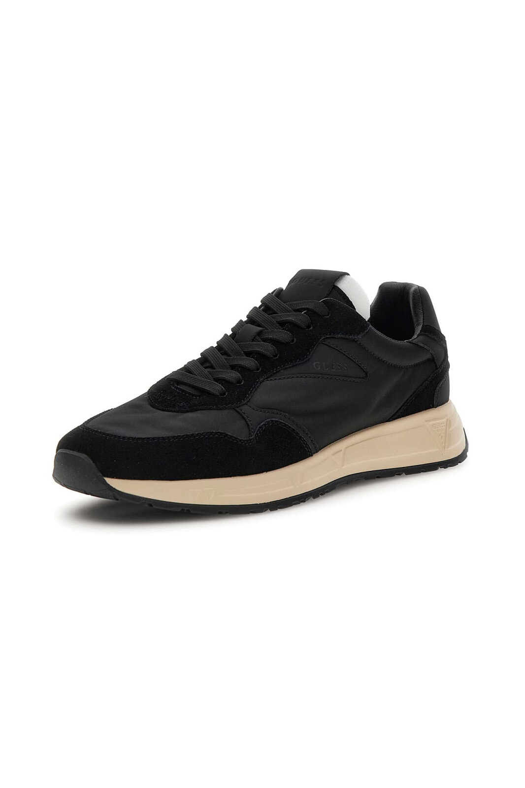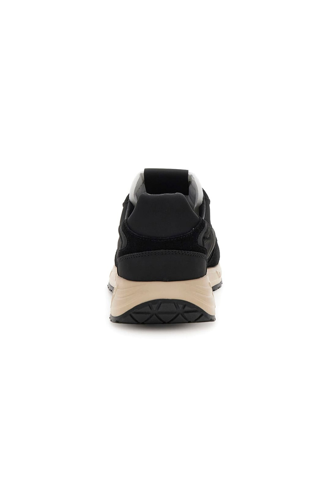 Detay: Yan panelde minimal logo yazısı, dilde logo figürü, kontrast süet ve deri paneller, bej orta taban ve siyah dış taban