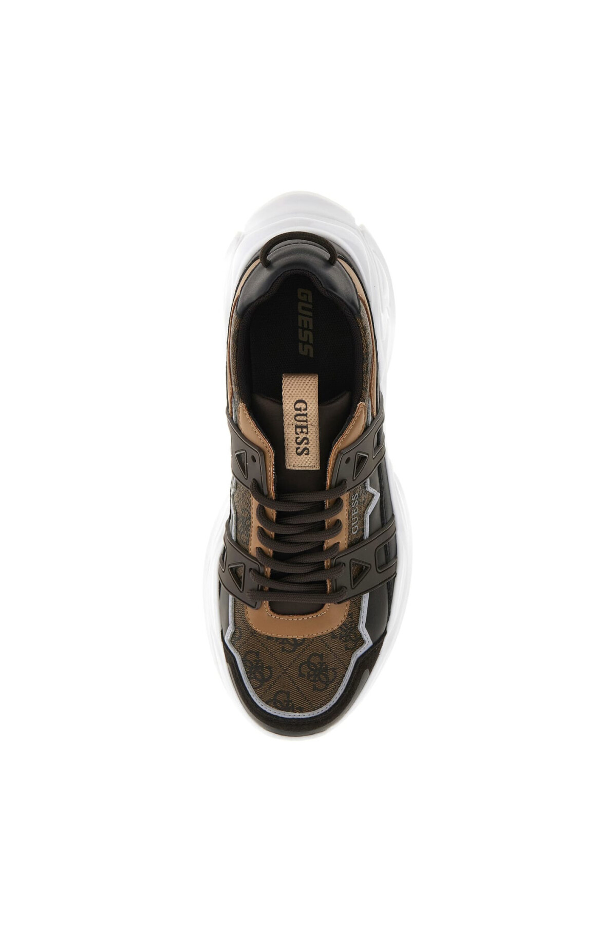 Detay: Katmanlı panel tasarımı, yanlarda geometrik destek detayları, dilde Guess logo şeridi, yüksek beyaz dış taban