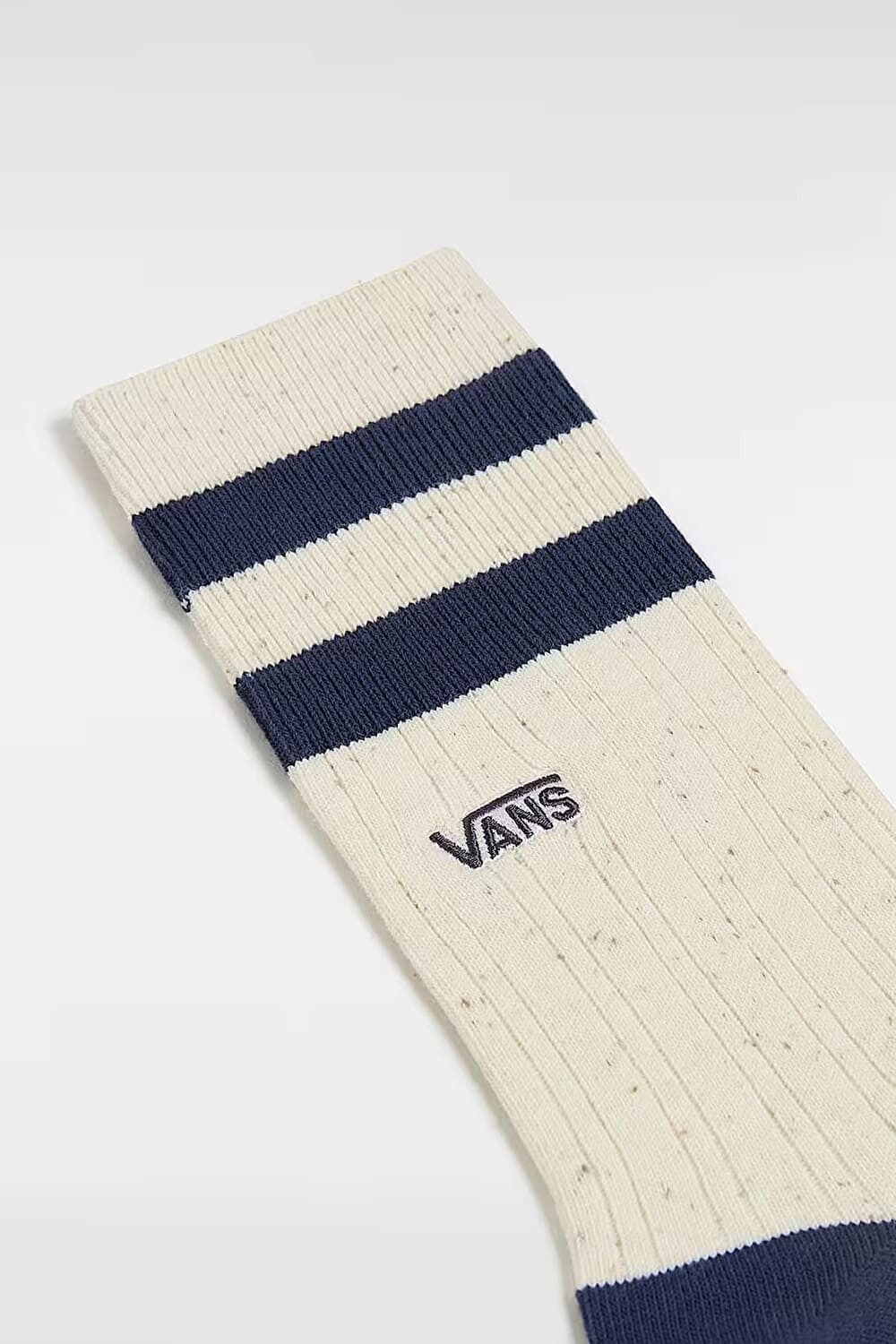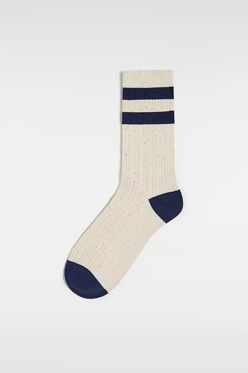 Retro sportif estetiğini yansıtan bu "Classic Crew" çorap, krem rengi zemin üzerindeki doğal benekli (speckled) dokusuyla vintage bir hava sunuyor. Manşet kısmındaki çift lacivert şerit ve hemen altındaki siyah logosu, markanın kolejli (varsity) stiline şık bir atıfta bulunur. Kontrast renkli lacivert topuk ve burun detayları tasarıma derinlik katarken, boydan boya uzanan esnek fitilli (ribana) örgü yapısı çorabın bacağınızı sıkmadan sarmasını ve gün boyu sabit kalmasını sağlar.