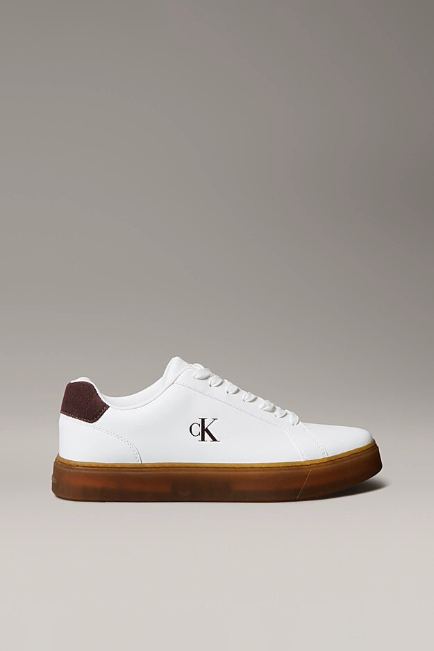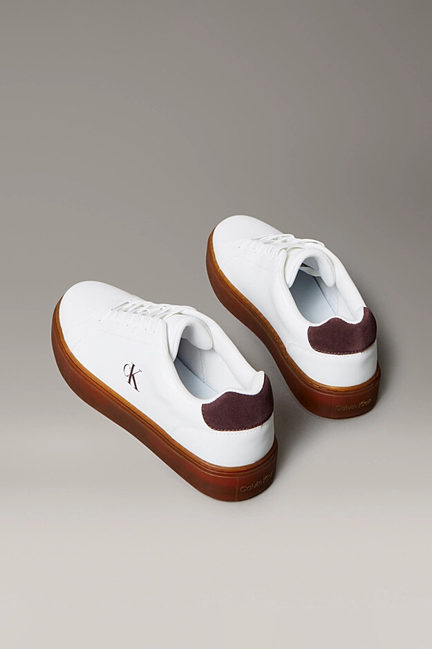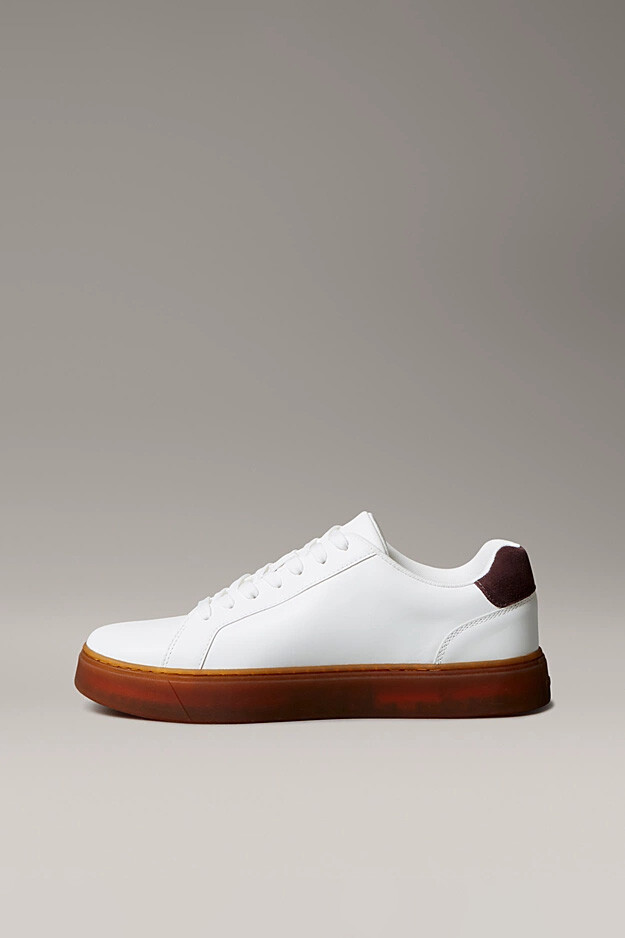 Zamansız kort ayakkabısı silüetini modern detaylarla buluşturan bu spor ayakkabı, beyazın ferahlığını bordo ve bal rengi detaylarla harmanlıyor. %100 deri dış yüzeyi, hem dayanıklılık sunar hem de pürüzsüz dokusuyla premium bir stil yaratır. Tasarımın en dikkat çekici özelliği olan yarı saydam bal rengi (Gum) taban yapısı, klasik beyaz gövdeye retro ve sıcak bir hava katar. Topuk kısmındaki bordo süet görünümlü detay ve yan taraftaki siyah "cK" logosu, ayakkabının minimalist şıklığını tamamlar. Günlük şehir hayatında hem konforu hem de sofistike bir duruşu arayan erkekler için mükemmel bir tercihtir.