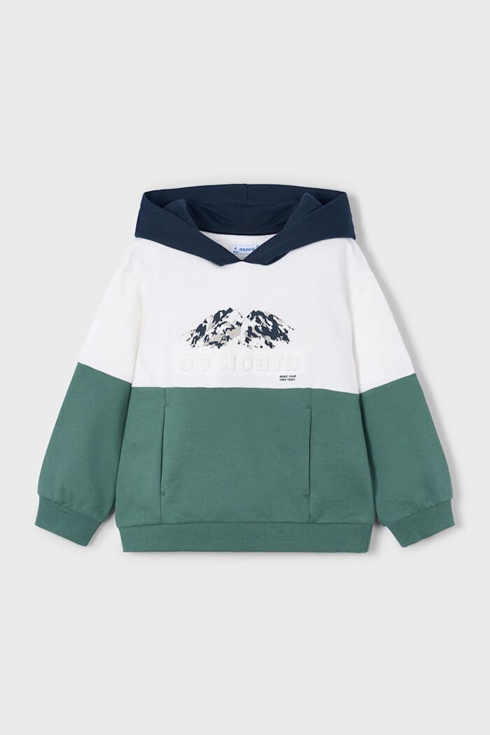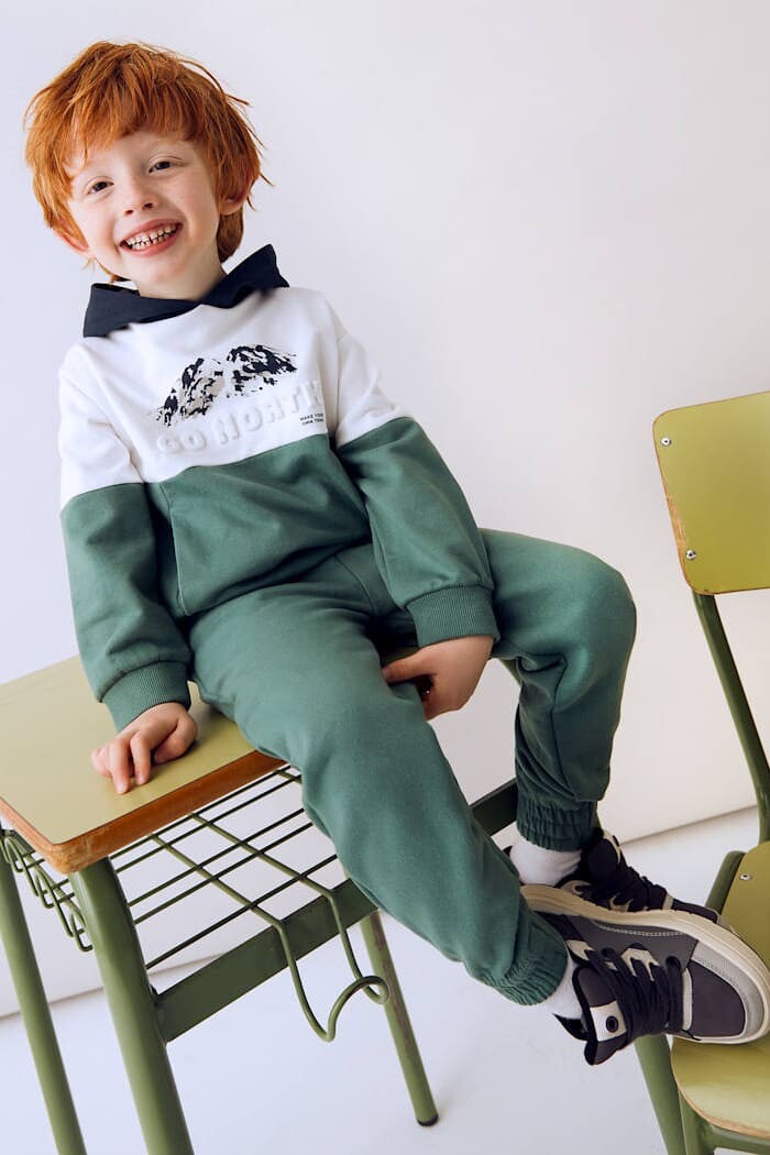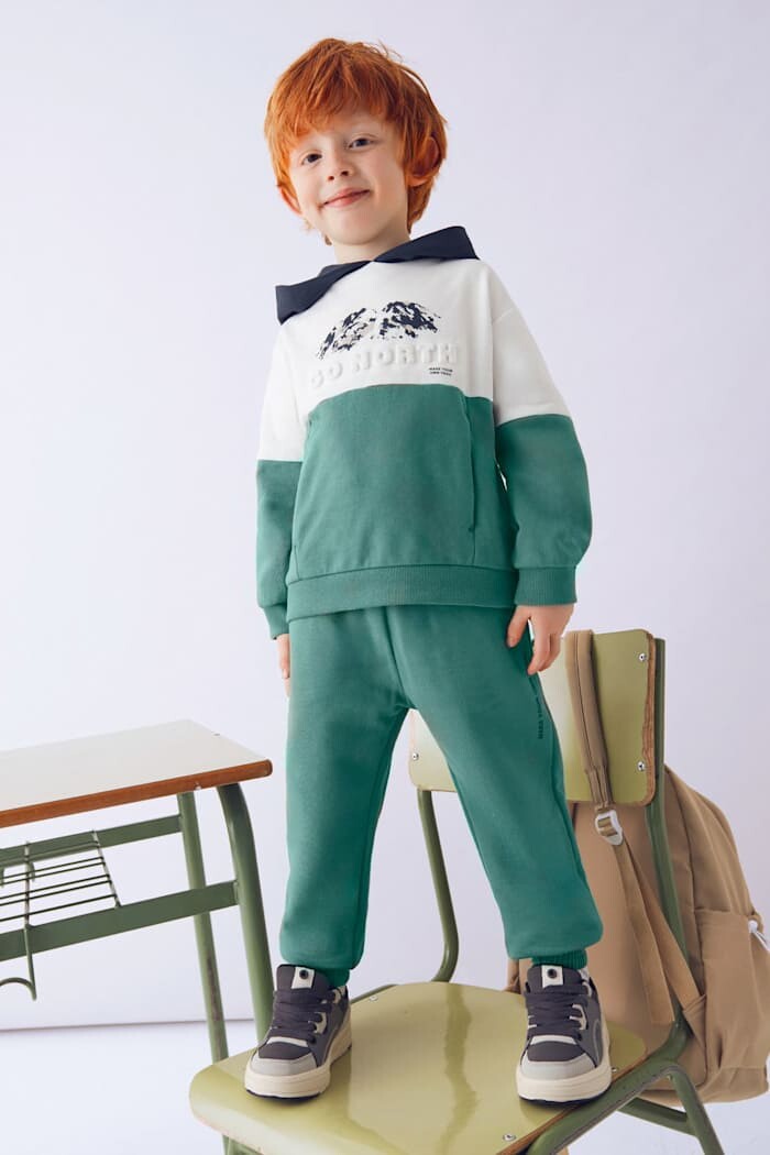Aktif ve stil sahibi çocuklar için tasarlanmış bu 3 parçalı eşofman takımı, çok yönlü kullanım imkanı sunar. Set; önü dağ temalı baskılı, renk bloklu ve kapüşonlu bir sweatshirt, biri lacivert diğeri ise yeşil olmak üzere iki adet rahat kesim jogger eşofman alttan oluşur. Yumuşak pamuk karışımlı kumaşı, çocukların gün boyu rahatça hareket etmesine olanak tanır. Farklı renklerdeki iki ayrı alt seçeneği sayesinde sayısız kombin yapma imkanı sunan bu takım, okulda, parkta ve tüm günlük aktivitelerde konfor ve şıklığı bir arada sunar.