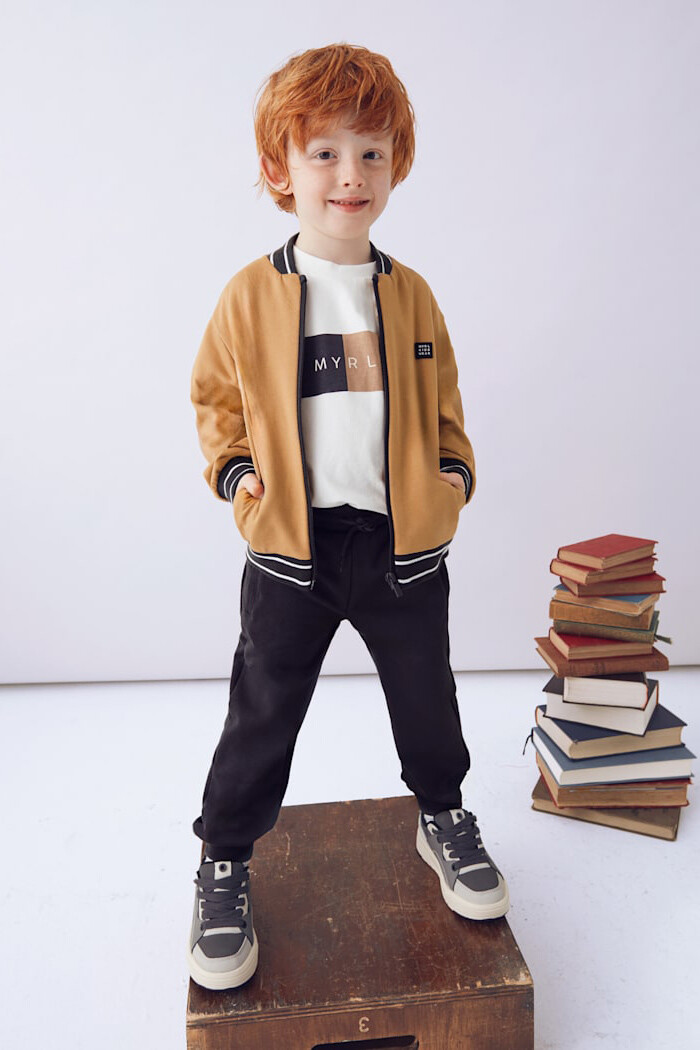 Kolej stilini modern ve konforlu bir tasarımla birleştiren bu üç parçalı takım, çocukların gardırobuna çok yönlülük katıyor. Set; göğsü renk bloklu ve yazılı uzun kollu bir tişört, çizgili ribana detaylı fermuarlı bir bomber ceket ve lacivert rengi bir jogger eşofman alttan oluşur. Yumuşak ve esnek pamuk karışımlı kumaşları, gün boyu süren konfor ve hareket özgürlüğü sağlar. Parçaları bir arada kullanarak anında havalı bir kombin yaratabilir veya ayrı ayrı giyerek farklı stiller oluşturabilirsiniz.