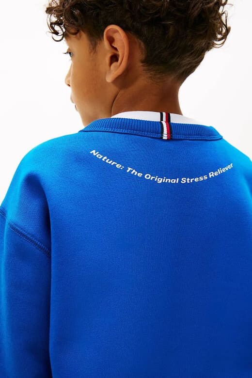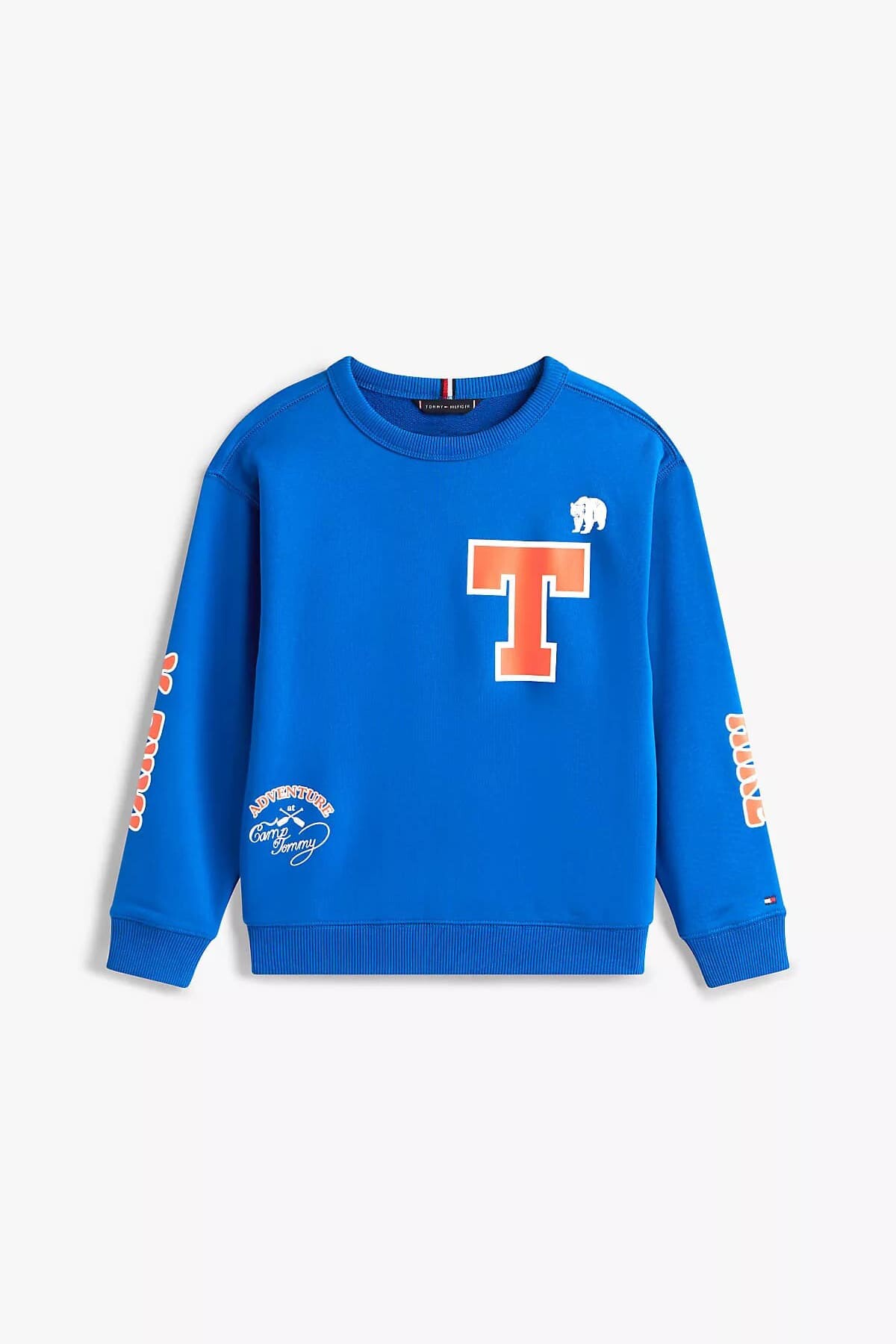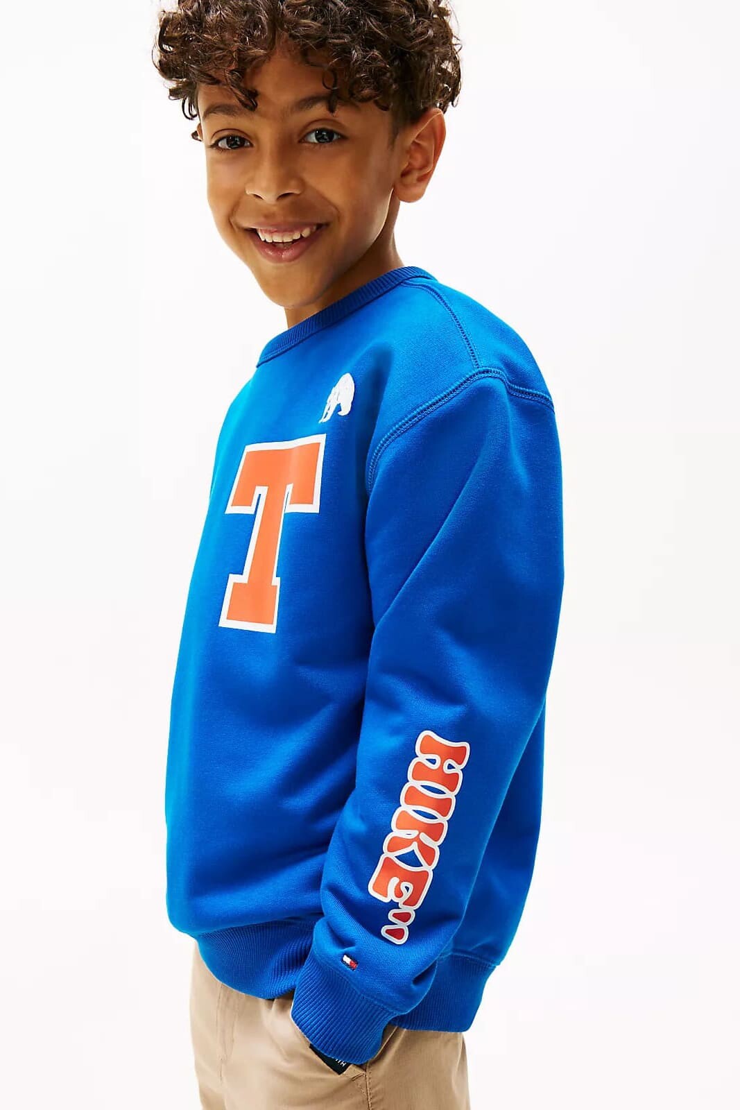 Retro ve sportif bir estetiğe sahip bu sweatshirt, pamuk karışımlı polar kumaşıyla çocuklara gün boyu konfor sunuyor. Canlı mavi rengi, kolej stilinden ilham alan göğüsteki büyük harf aplikesi, çeşitli armalar ve kollar boyunca uzanan baskılarla zenginleştirilmiştir. Hafif düşük omuzlu regular fit kalıbı, rahat bir hareket alanı sağlarken, fitilli yaka, manşetler ve etek ucu tasarımı tamamlar. Hem okulda hem de oyun zamanlarında jean pantolonlar ve eşofman altlarıyla kolayca kombinlenebilecek bu enerjik parça, çocukların favorisi olacak.