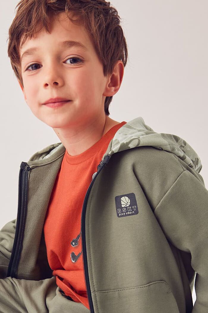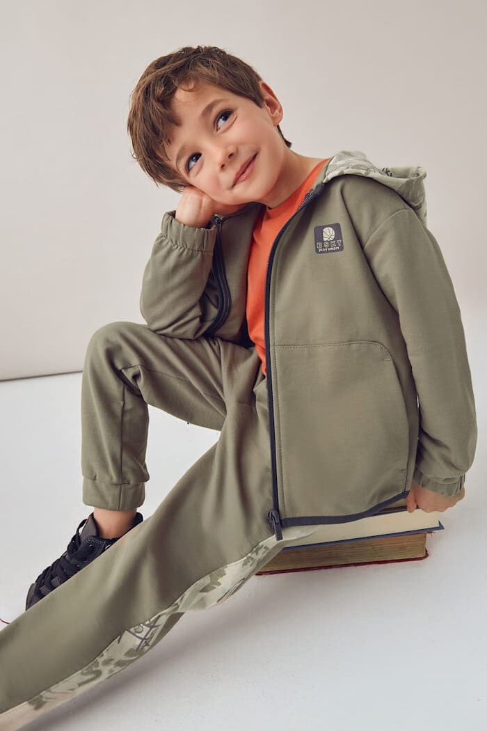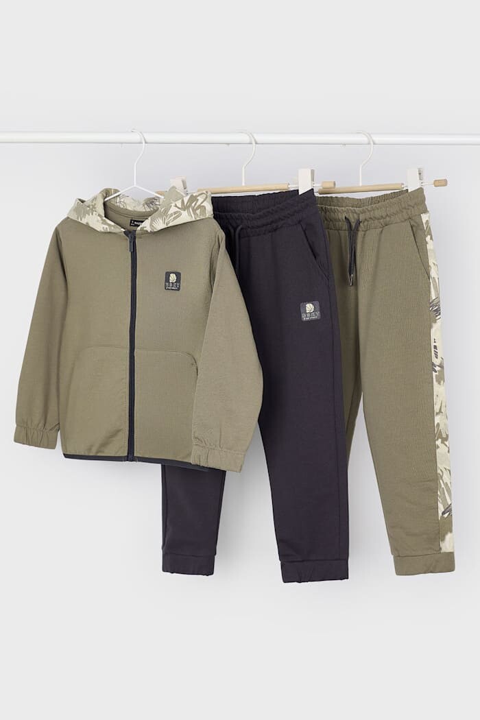 Aktif ve stil sahibi çocuklar için tasarlanmış bu 3 parçalı eşofman takımı, çok yönlü kullanım imkanı sunar. Set; kapüşon içi tropik desenli, fermuarlı haki bir sweatshirt, biri antrasit diğeri ise yanları tropik desen şeritli haki olmak üzere iki adet rahat kesim jogger eşofman alttan oluşur. Yumuşak pamuk karışımlı kumaşı, çocukların gün boyu rahatça hareket etmesine olanak tanır. Farklı renklerdeki iki ayrı alt seçeneği sayesinde sayısız kombin yapma imkanı sunan bu takım, okulda, parkta ve tüm günlük aktivitelerde konfor ve şıklığı bir arada sunar.