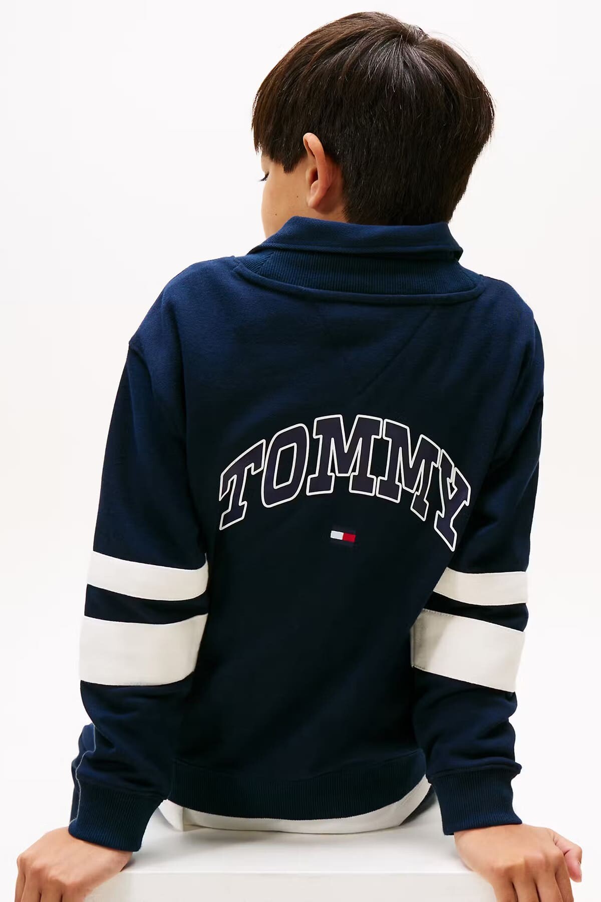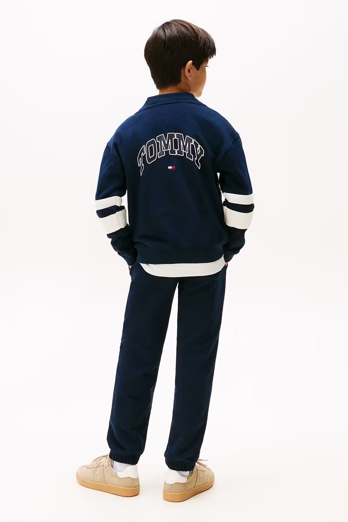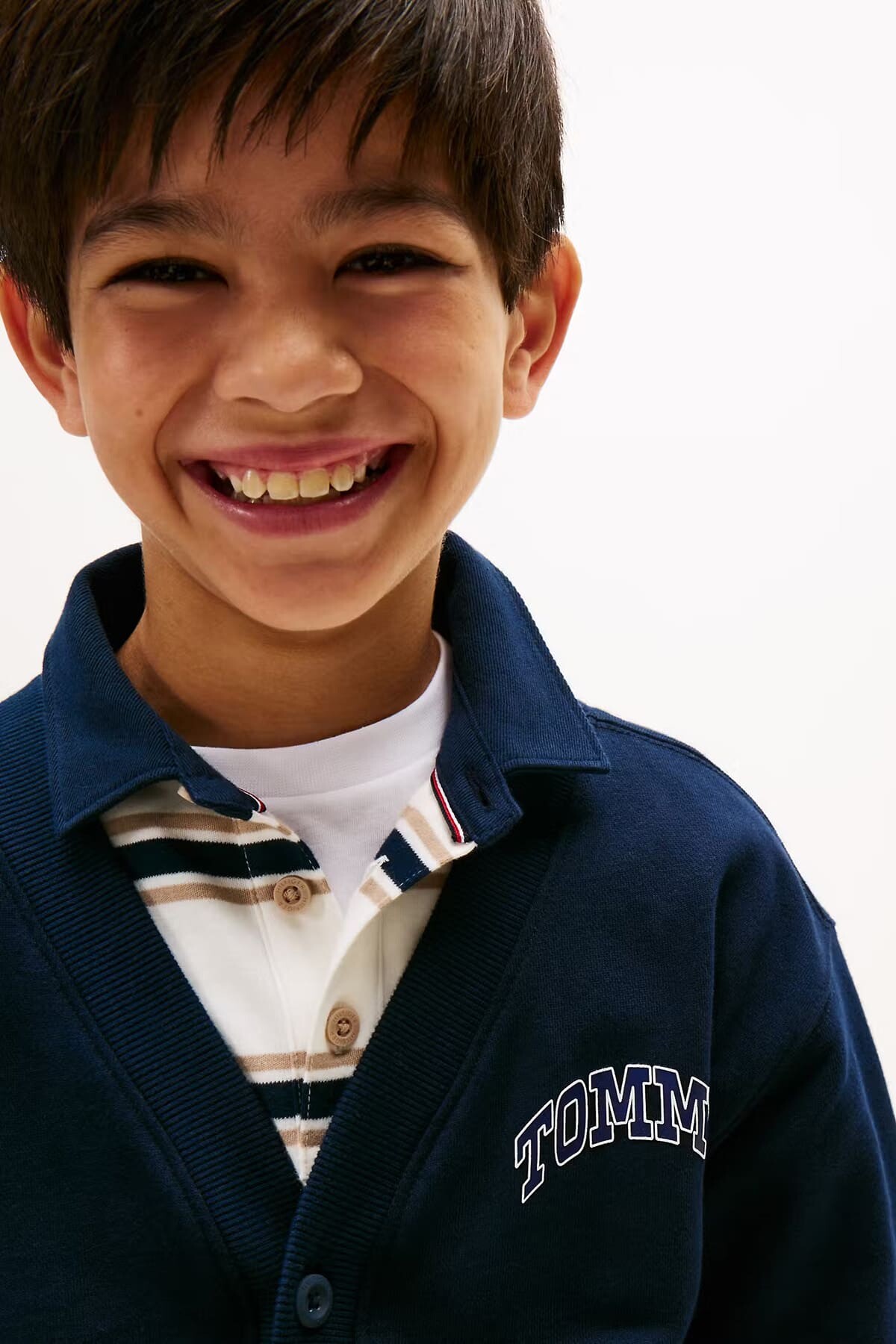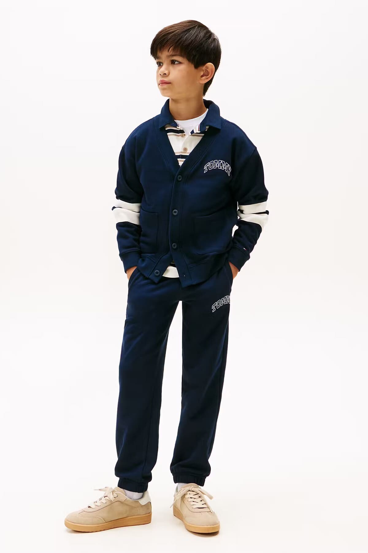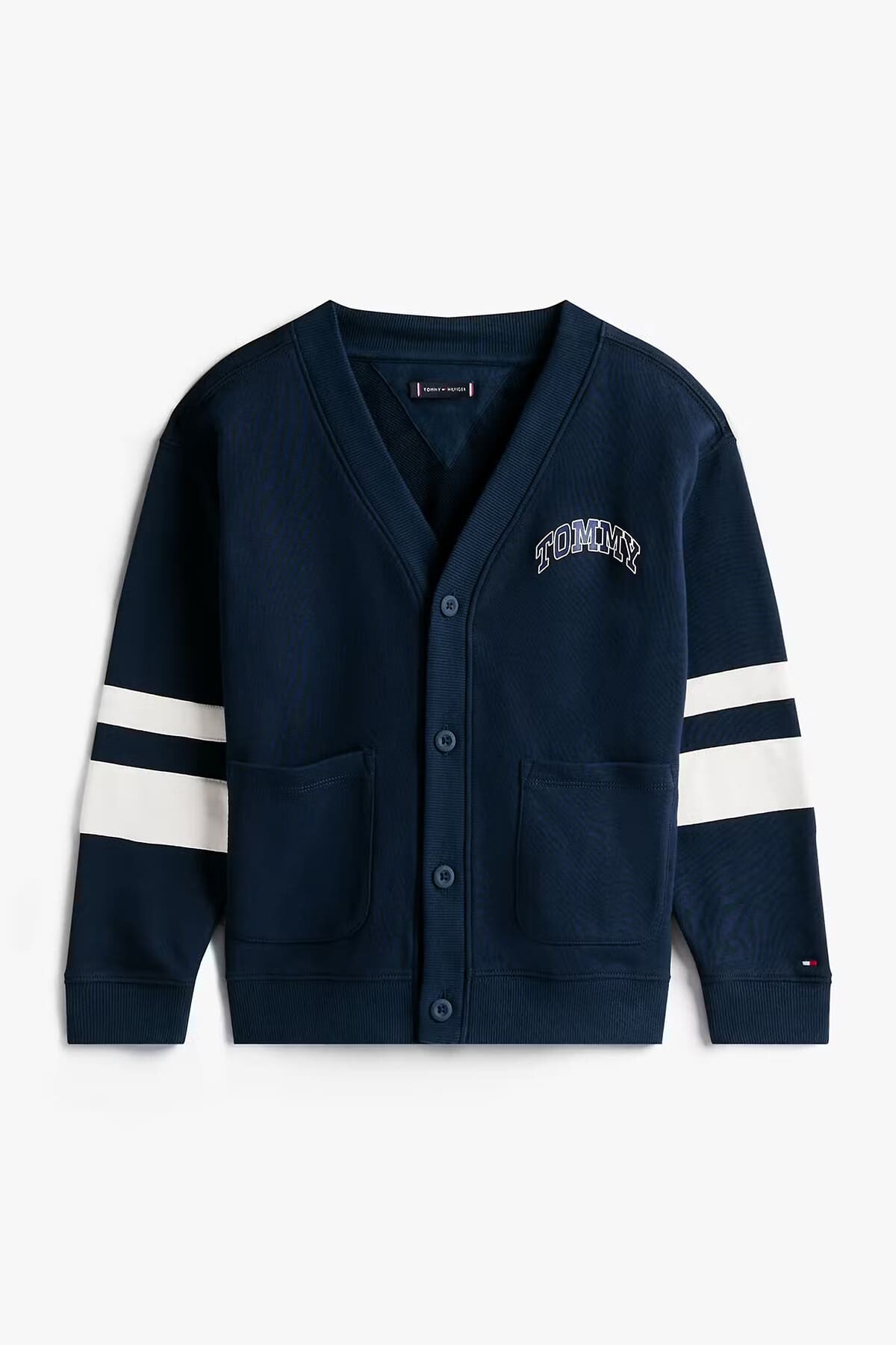 Klasik kolej stilini yansıtan bu hırka, çocukların günlük kombinlerine sportif bir şıklık katıyor. Yumuşak pamuk karışımlı sweatshirt kumaşı, gün boyu konfor ve sıcaklık sunar. Kollarındaki kalın kontrast şeritler ve göğüsteki kabartma yazı baskısı, tasarıma dinamik ve havalı bir hava katıyor. V yaka kesimi, düğmeli önü ve cepleriyle hem pratik hem de stil sahibi bir parçadır.