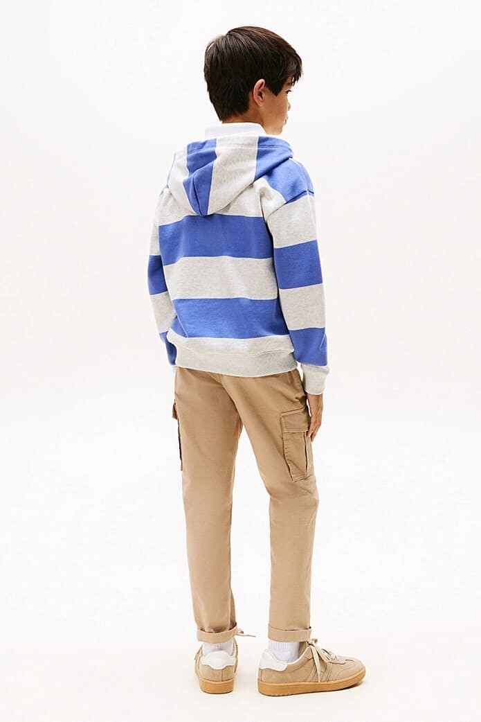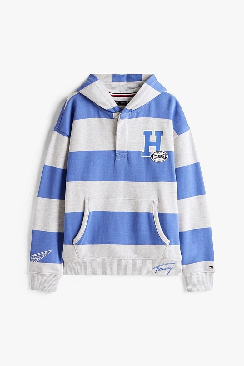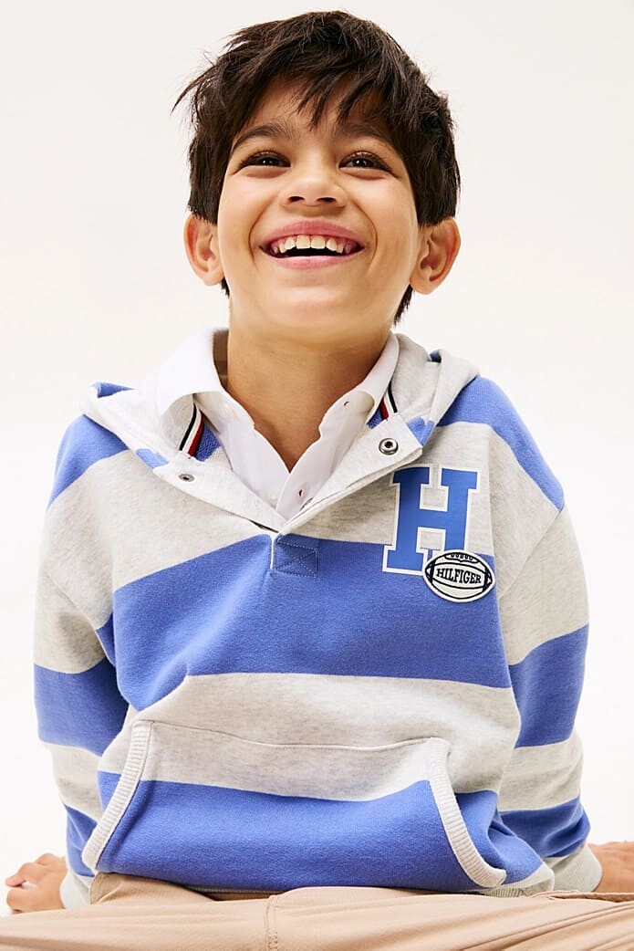 Kapüşonlu sweatshirt'ün rahatlığı ile polo yakanın klasik stilini birleştiren bu hibrit tasarım, çocukların gardırobuna enerjik bir dokunuş katıyor. Yumuşak ve esnek pamuklu kumaşı, gün boyu üst düzey konfor ve hareket özgürlüğü sağlar. Kalın çizgili deseni ve kolej stilinden ilham alan çeşitli logo armaları, tasarıma dinamik ve havalı bir karakter kazandırır. Düğmeli polo yakası ve kullanışlı kanguru cebi gibi detaylarla tamamlanan bu sweatshirt, hem şık hem de sportif bir görünüm için idealdir.
