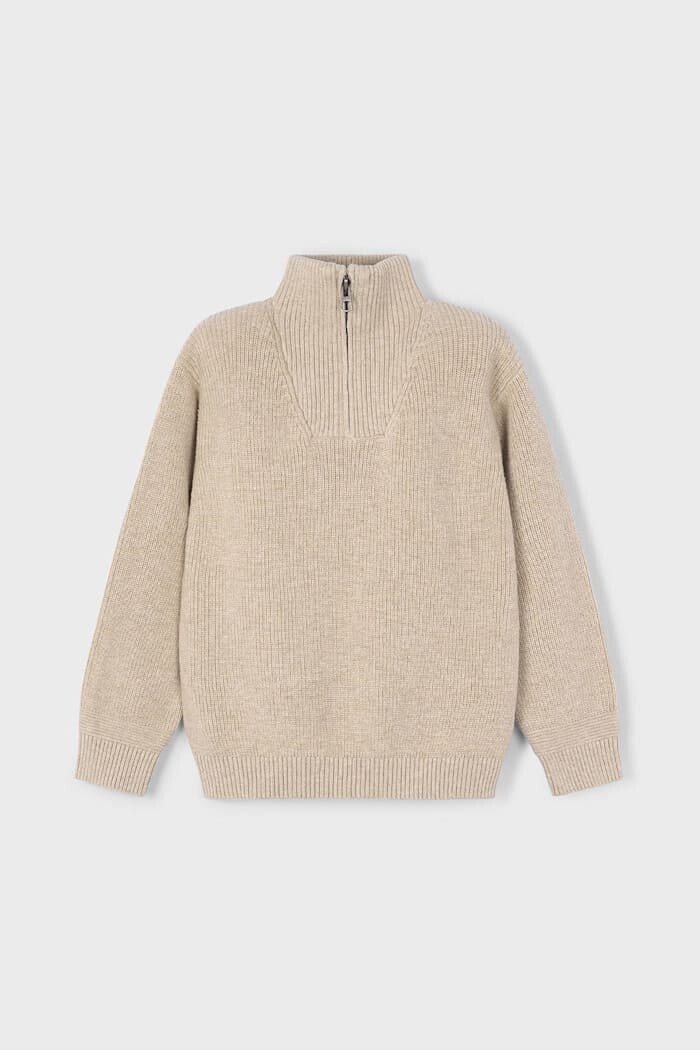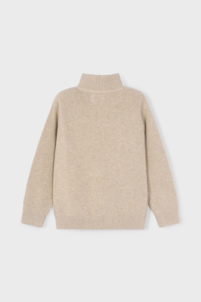 Soğuk havaların en şık ve konforlu kurtarıcısı olan bu triko kazak, %100 pamuk dokusuyla çocuğunuzun cildine hassas bir dokunuş sunar. Fitilli örgü yapısı, tasarıma klasik bir doku katarken, yarım fermuarlı dik yakası hem stil sahibi bir görünüm yaratır hem de rüzgarlı günlerde ekstra koruma sağlar. Zamansız bej rengi sayesinde jean pantolonlardan chino pantolonlara kadar her parçayla mükemmel uyum yakalayan bu kazak, okul günlerinden hafta sonu gezmelerine kadar her an için ideal bir katmandır.