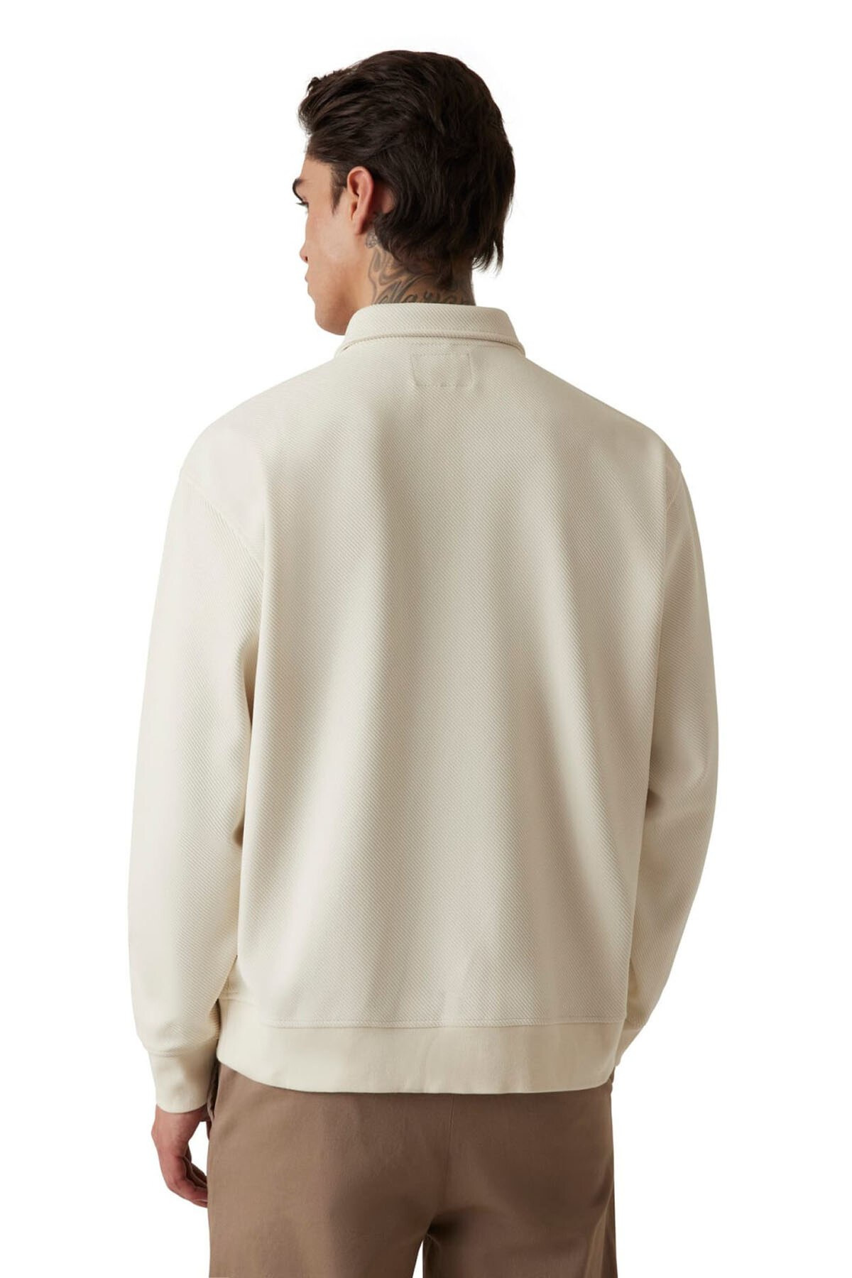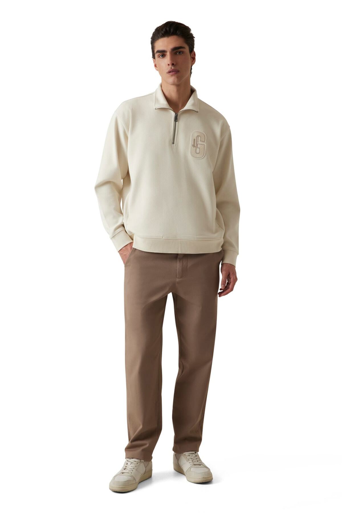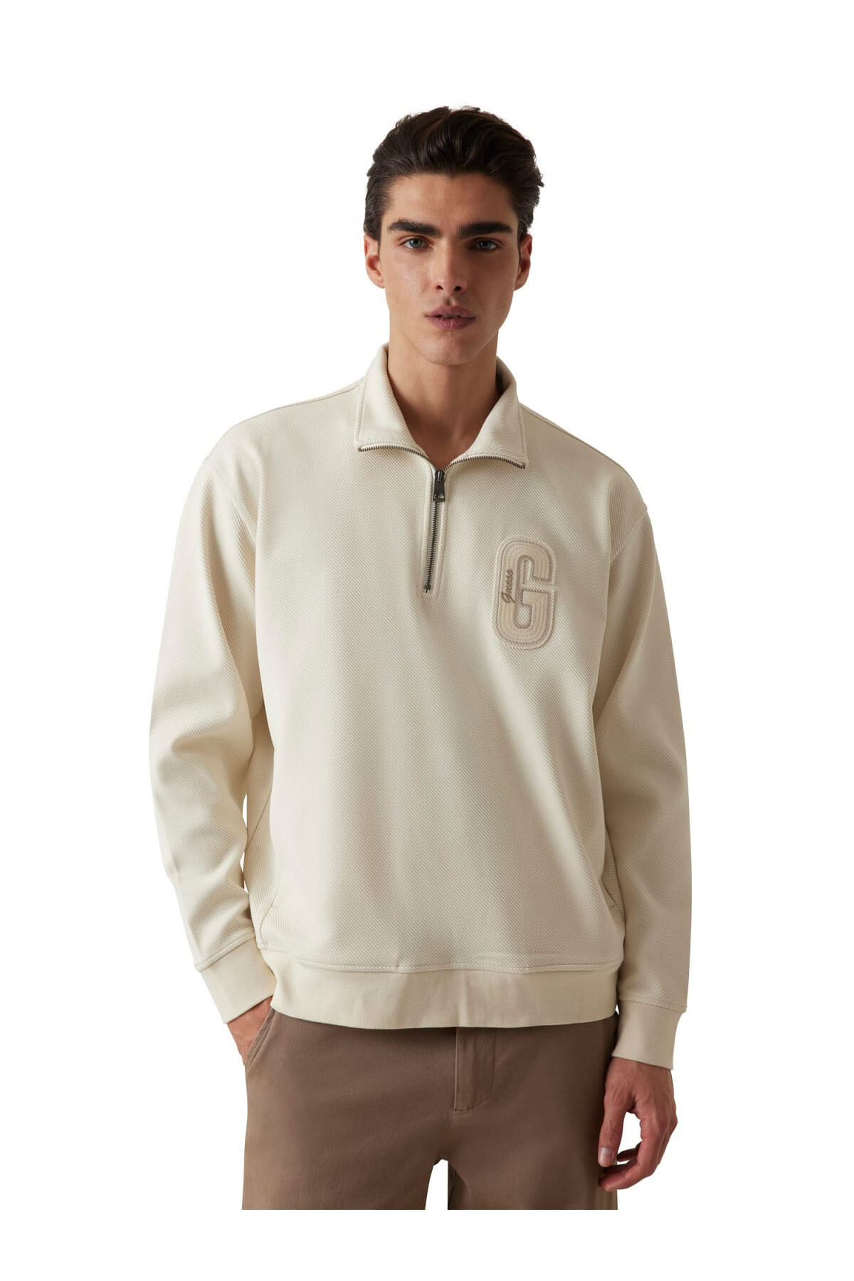 Hem sportif hem de şık bir stil sunan bu sweatshirt, günlük gardırobun anahtar parçalarından biridir. Dokulu kumaşı ve rahat kalıbıyla konforlu bir deneyim sunar. Yüksek yakasındaki yarım fermuar detayı, modele modern bir hava katarken, göğüs kısmındaki büyük ve tonal kabartma harf aplikesi tasarıma güçlü bir karakter ekler. Ribanalı manşetleri ve etek ucu, vücuda tam oturmasını sağlar.