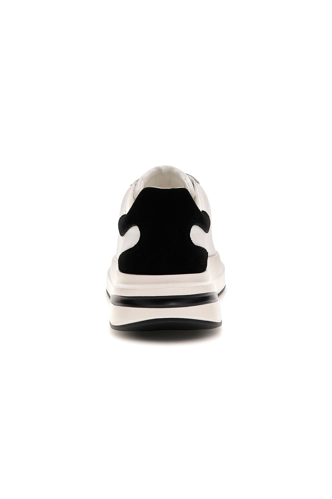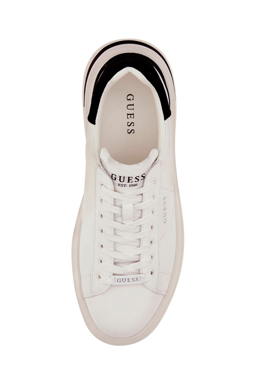 Detay: Topukta kontrast siyah süet panel, bağcık üzerinde metalik logo aksesuarı, yüksek beyaz dış taban, dilde "Guess Est. 1981" ibaresi