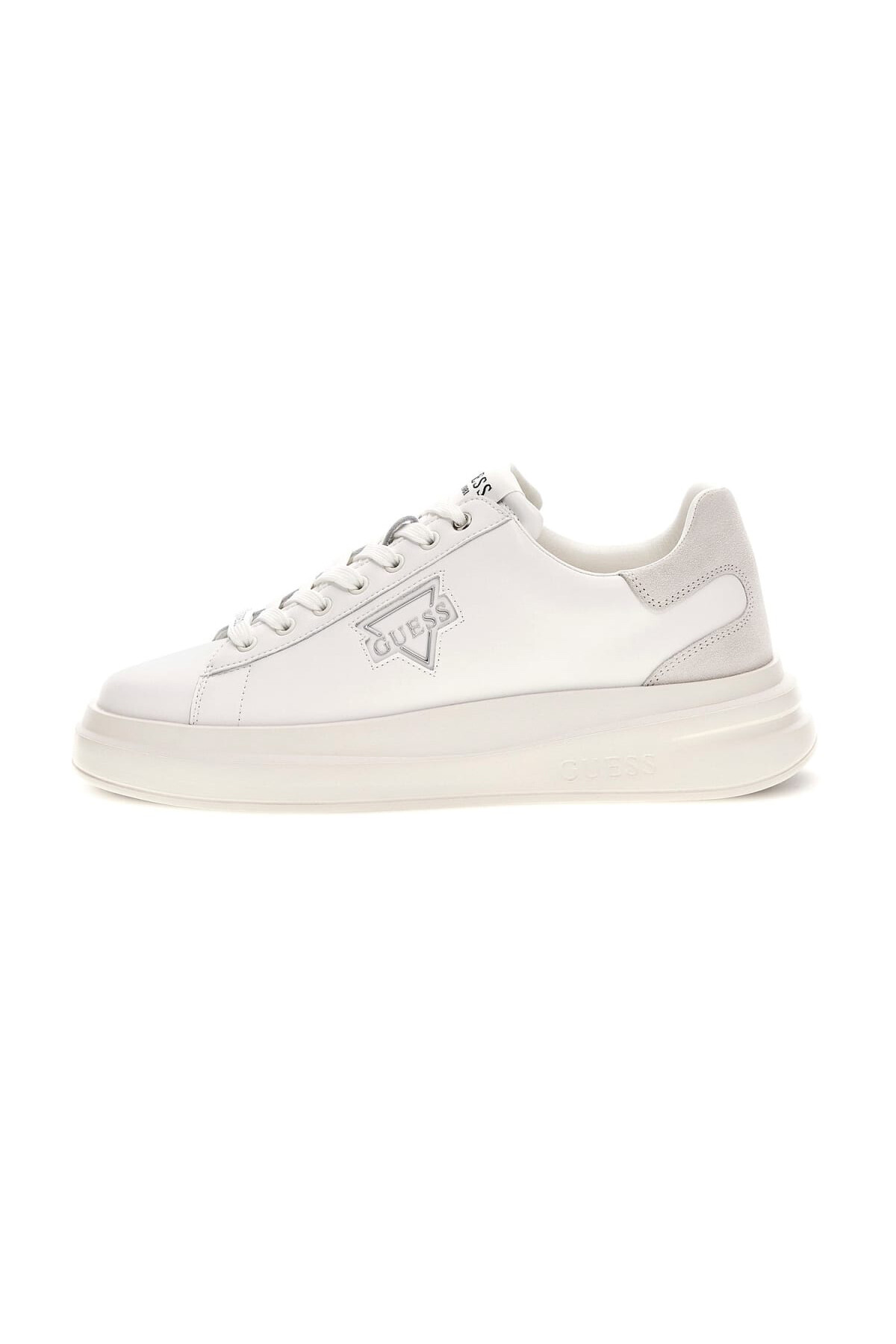 Sade ve modern bir estetiğe sahip olan bu sneaker, sokak modasının en sevilen trendlerinden kalın taban formunu rafine bir tasarımla buluşturuyor. Dana ve inek derisi ağırlıklı kaliteli materyali, beyazın temiz görünümünü krem rengi tabanla birleştirerek katmanlı bir şıklık sunar. Topuktaki süet dokulu gri panel tasarıma hareket katarken, yan paneldeki dikişli büyük üçgen amblem ve metalik yazı detayları modele karakteristik bir dokunuş ekler.