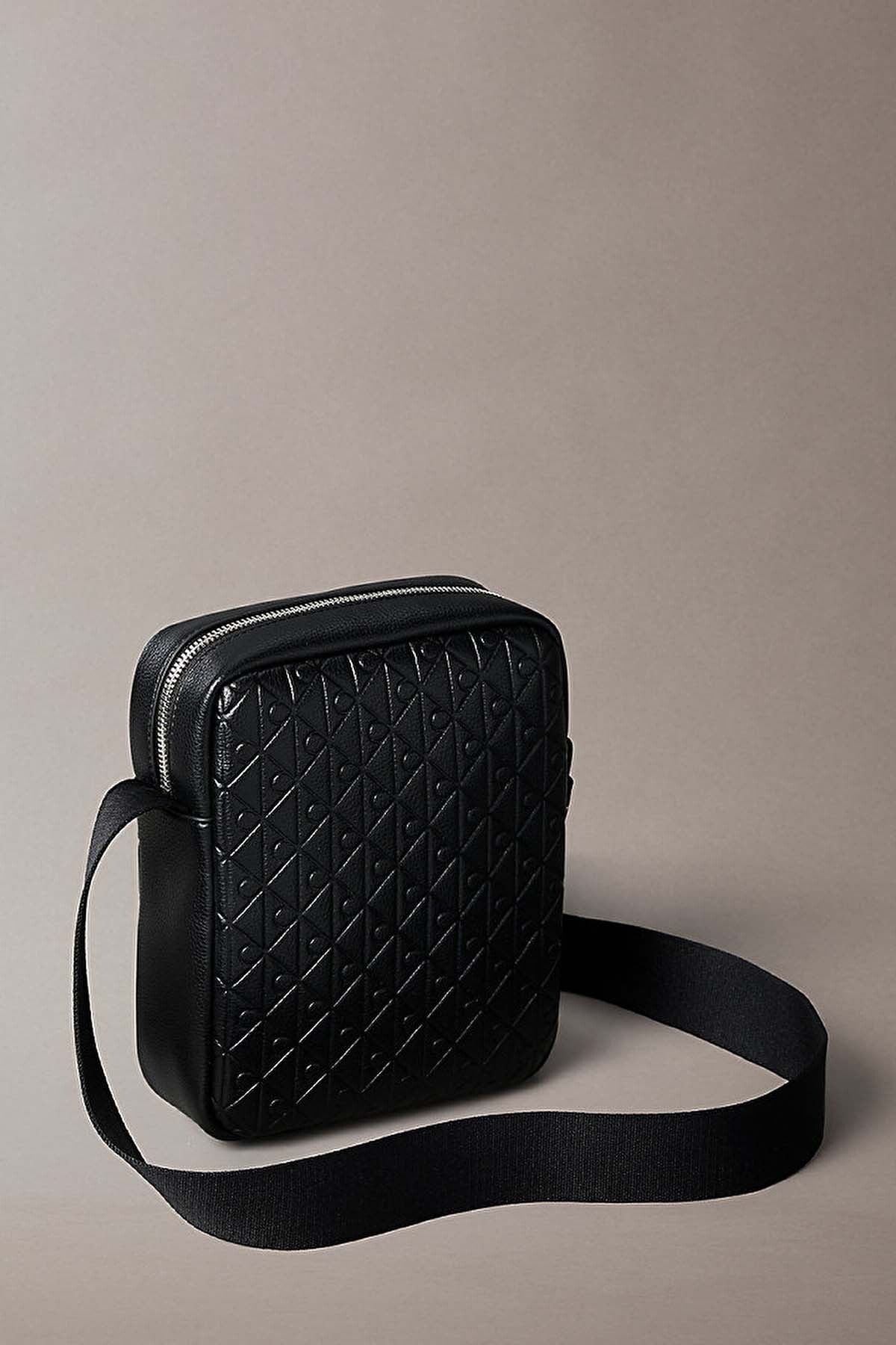 Modern şehir yaşamının ihtiyaçlarına cevap vermek üzere tasarlanan bu reporter çanta, yapılandırılmış formu ve fonksiyonel detaylarıyla öne çıkıyor. %100 poliüretan malzemeden üretilen dayanıklı dış yüzeyi, tamamına yayılan kabartmalı (emboss) ikonik amblem logo desenleri ile zengin ve karakteristik bir doku sunar. Siyahın zamansız şıklığı, ön panelde yer alan minimal gümüş renkli logo baskısıyla tamamlanır.