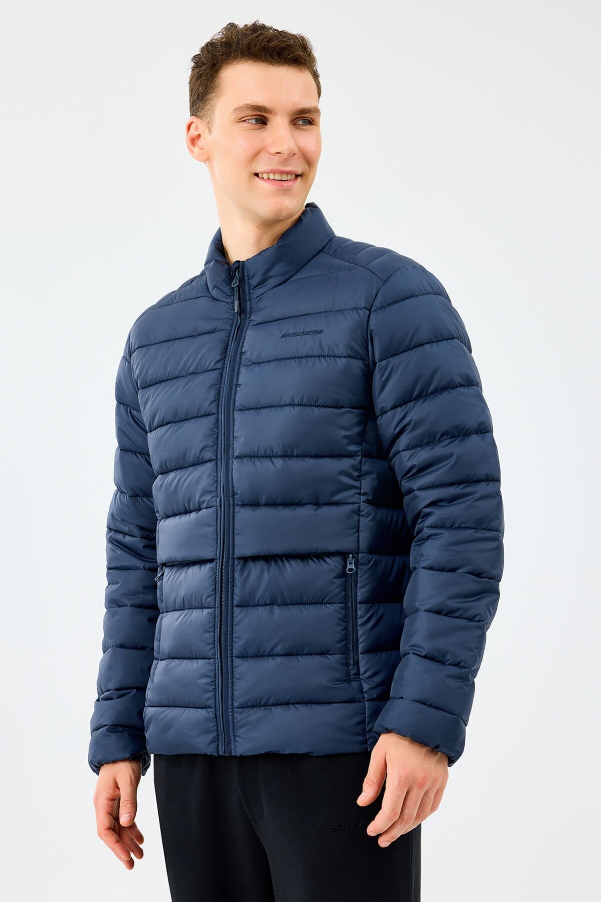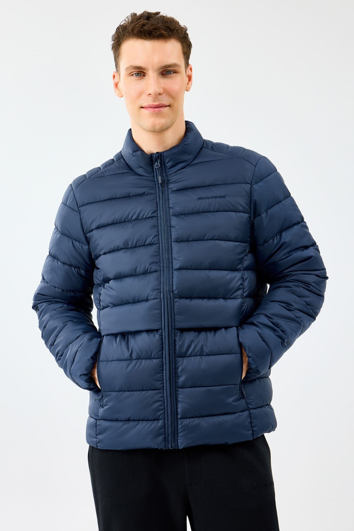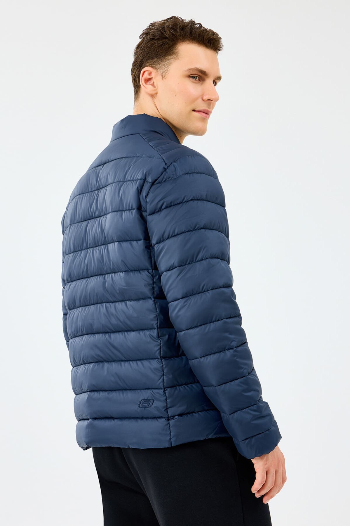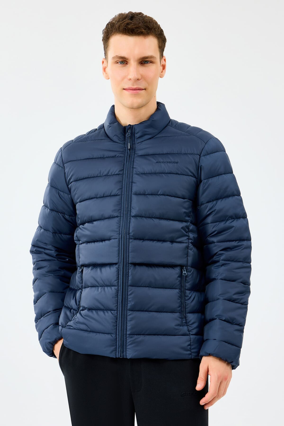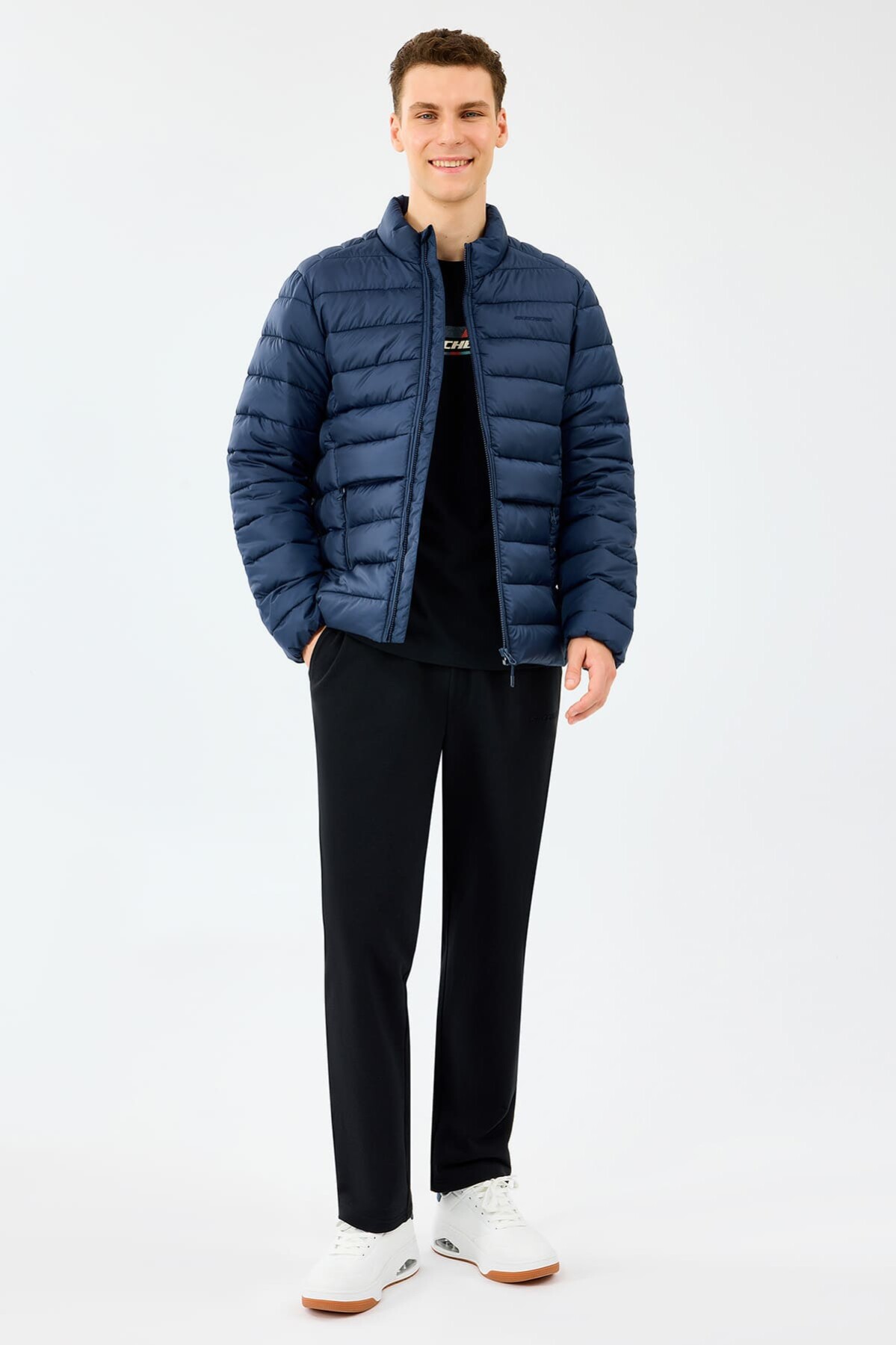 Sportif şıklığı dış giyime taşıyan bu lacivert şişme mont, soğuk ve yağışlı havalarda konforunuzdan ödün vermeden stilinizi korumanızı sağlar. Özel dolgulu yapısı ısı yalıtımı sağlayarak sizi sıcak tutar. Ağırlık yapmayan hafif tasarımı ve standart kalıbı sayesinde gün boyu özgürce hareket edebilirsiniz. Boynu saran dik yakası rüzgarı keserken, fermuarlı yan cepler kişisel eşyalarınız için güvenli bir alan sunar. Göğüs kısmındaki minimalist yazı logosu ile tamamlanan bu mont, kış gardırobunuzun en fonksiyonel parçalarından biri olacaktır.