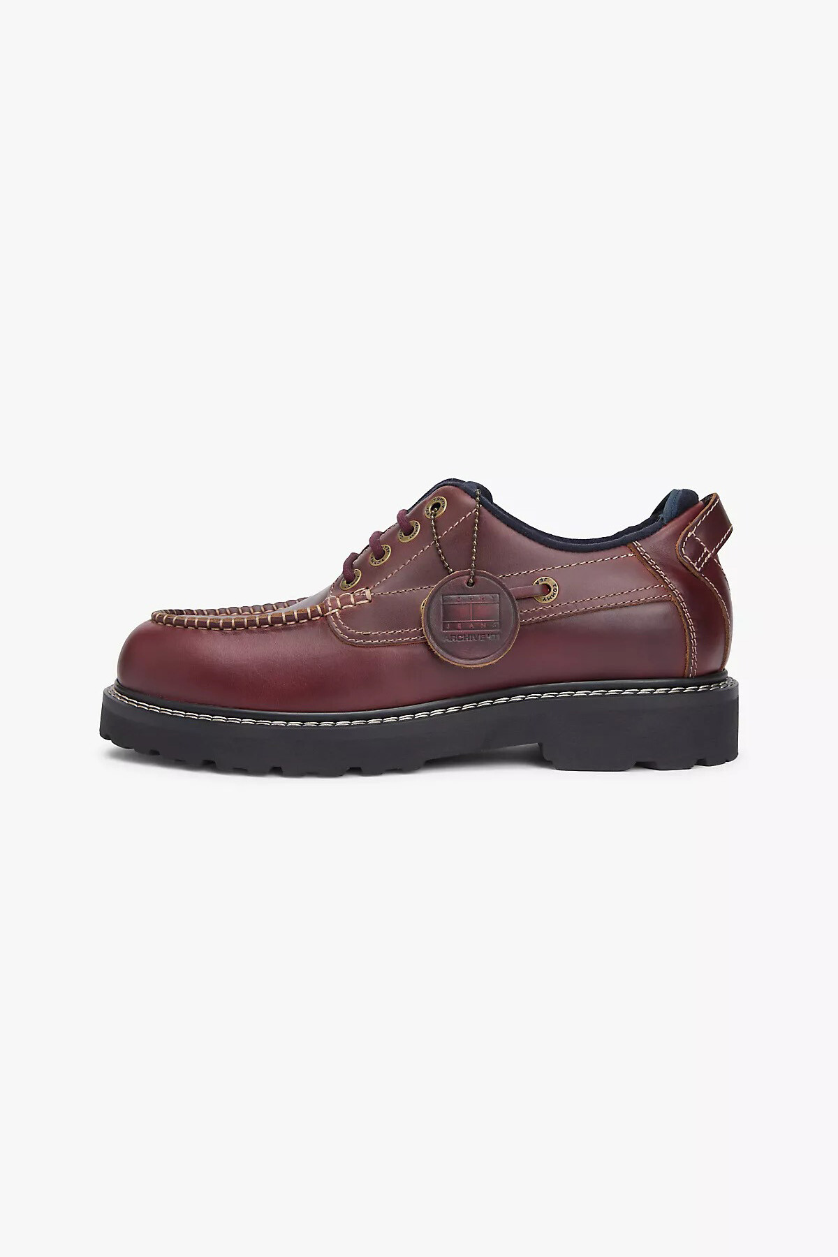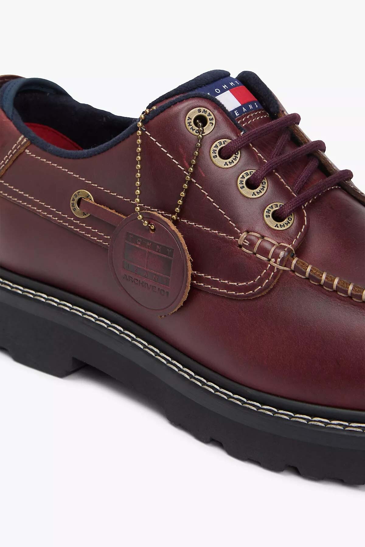 Detay: Kontrast dikişler, metal kuşgözleri, Archive deri etiket