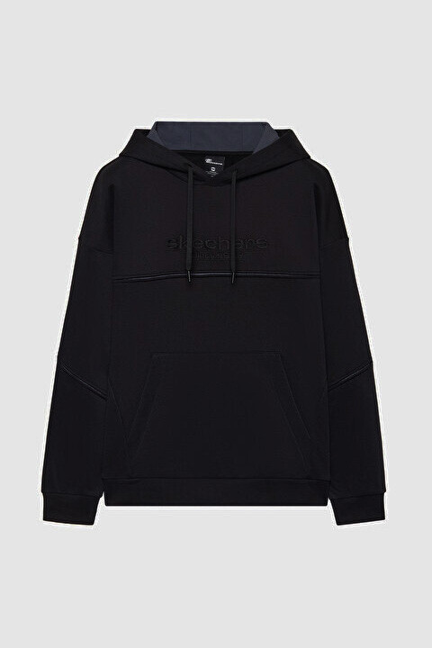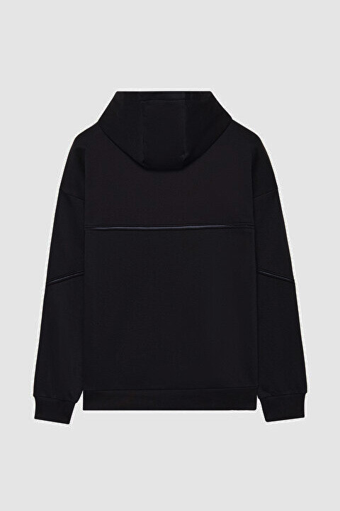 Pamuklu zengin karışımıyla cildinize doğal bir nefes aldıran bu siyah sweatshirt, gün boyu süren konforun modern tanımıdır. Göğüs kısmındaki tonal kabartma logo detayı ve gövdeyi geçen şerit dikiş, minimalist tasarıma sportif bir karakter katar. Ayarlanabilir ipli kapüşonu rüzgarlı havalarda koruma sağlarken, geniş kanguru cebi ellerinizi ısıtmak veya telefonunuzu taşımak için idealdir. Ribanalı etek ucu ve manşetleri formunu korumasına yardımcı olur. Hem spor aktivitelerinde hem de hafta sonu gezmelerinde rahatlıkla tercih edebileceğiniz, dolabınızın kurtarıcı parçasıdır.