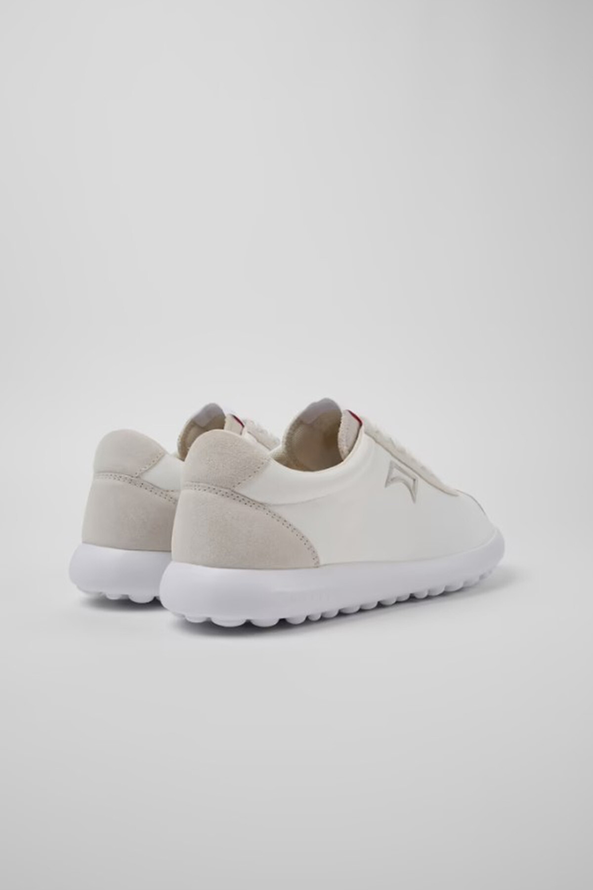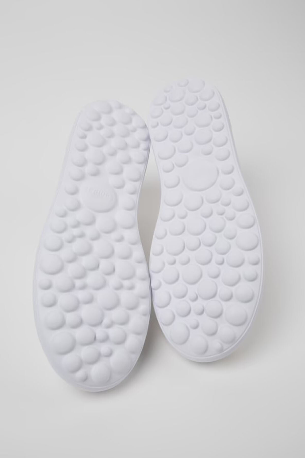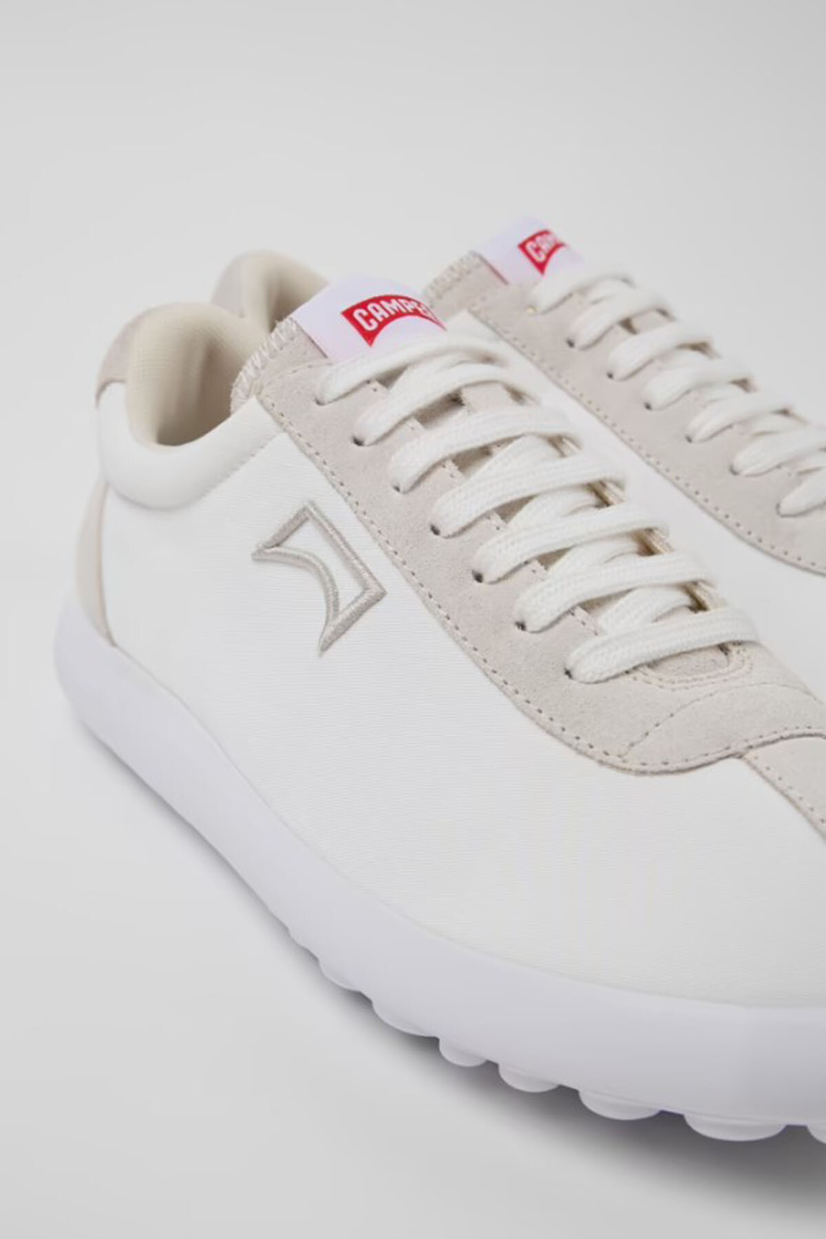 PU tabanlı ve EVA dış tabanlı beyaz geri dönüştürülmüş PET ve nubuk erkek spor ayakkabısı.