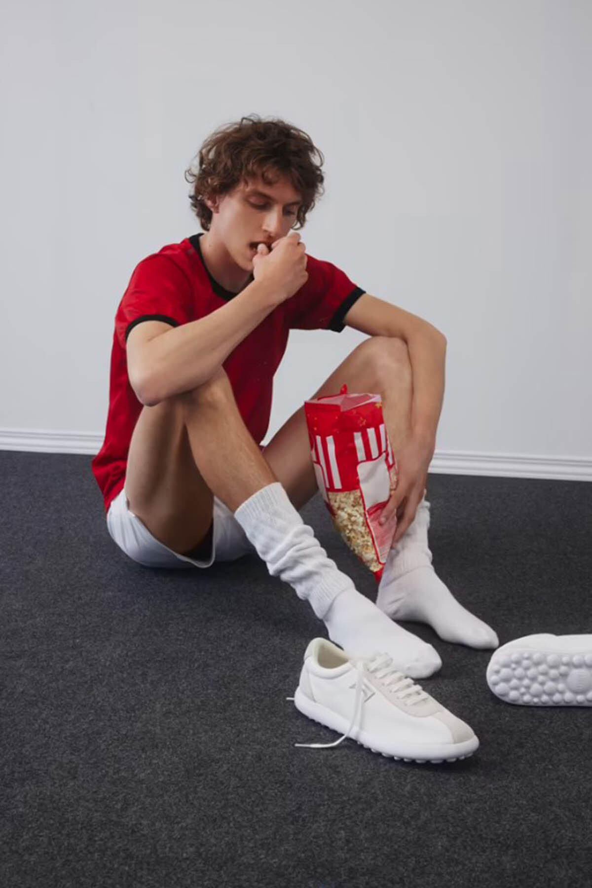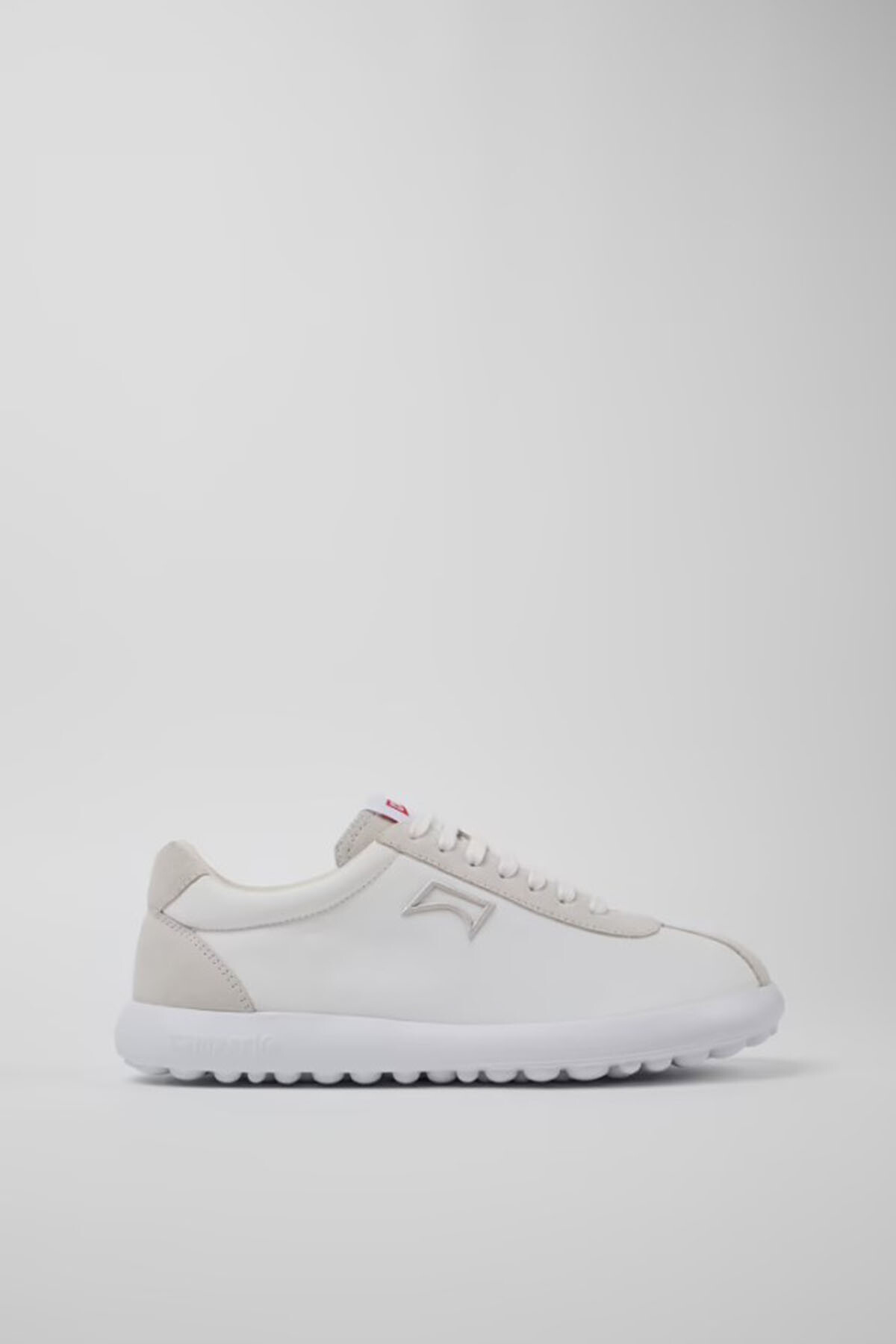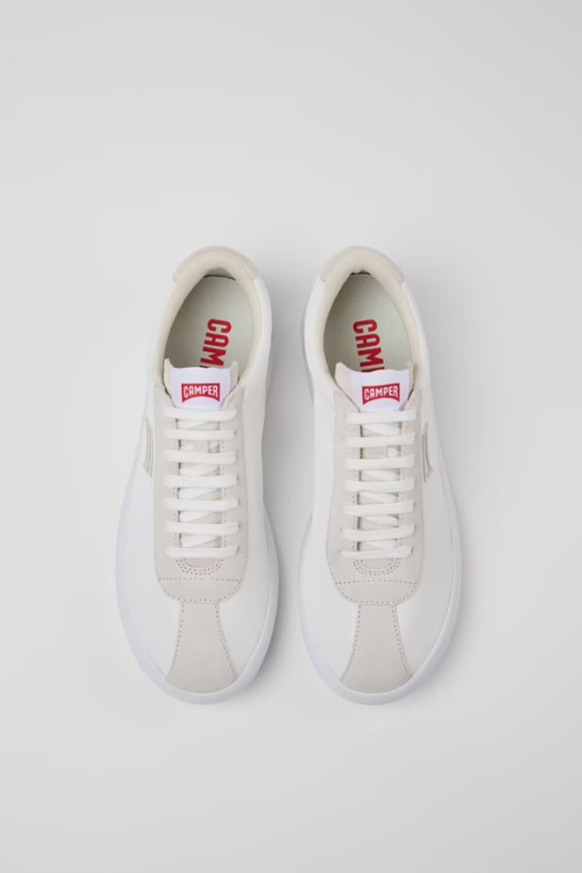 PU tabanlı ve EVA dış tabanlı beyaz geri dönüştürülmüş PET ve nubuk erkek spor ayakkabısı.