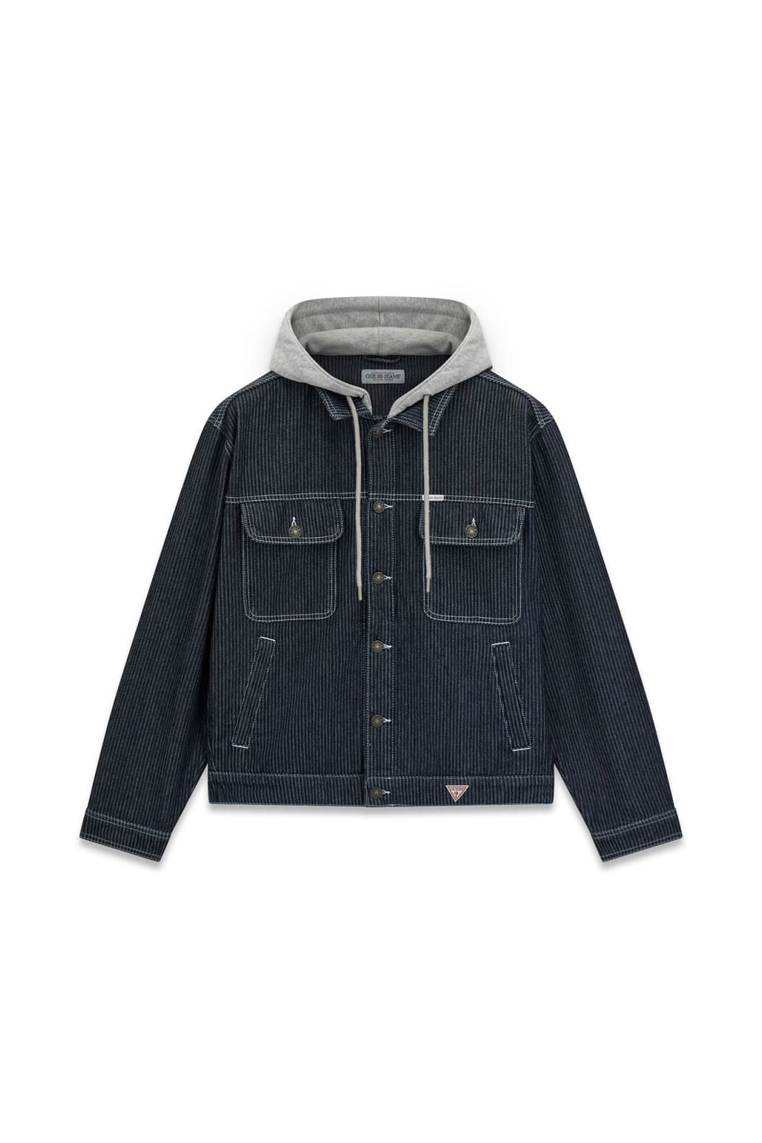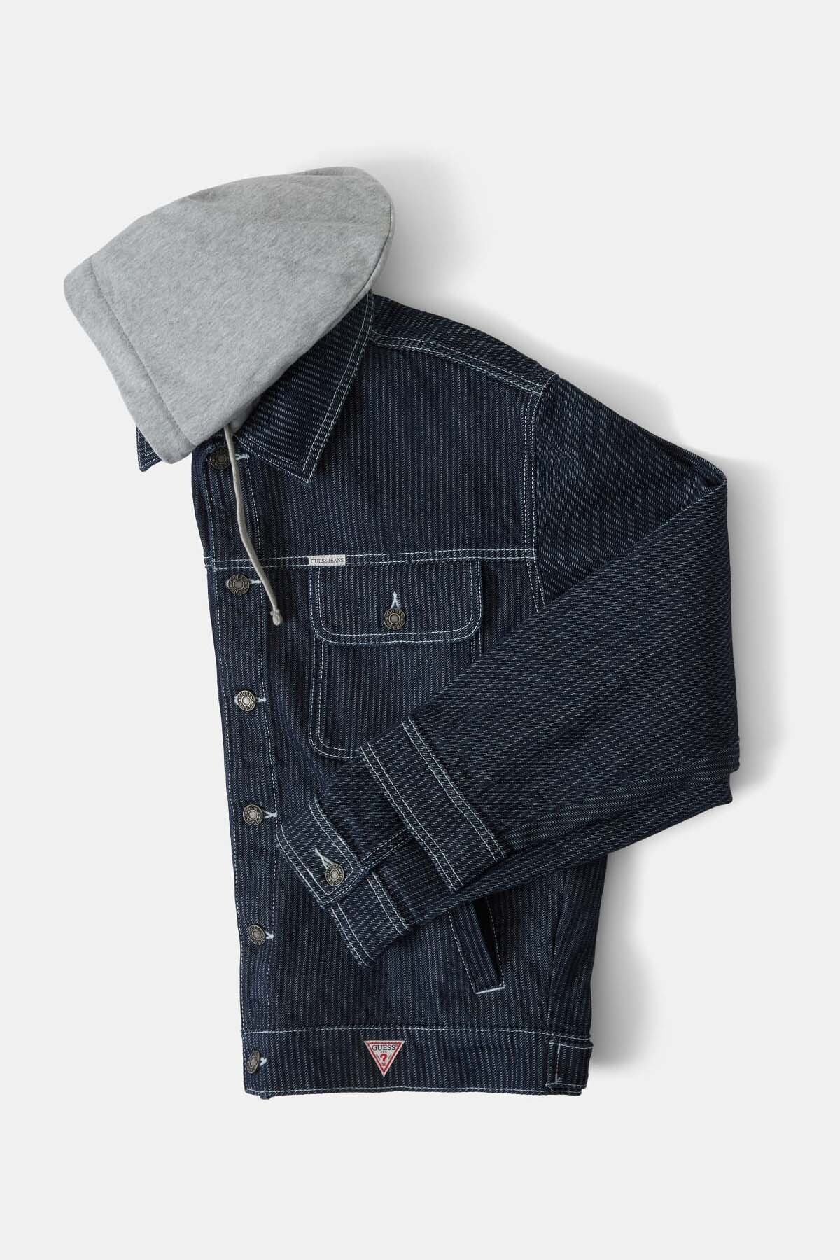 Lacivert tonunu, kumaşın dokusuna işlenmiş ince dikey çizgilerle zenginleştiren Rege denim ceket, klasik Trucker stilini sportif bir inovasyonla buluşturuyor. %100 pamuklu tok denim kumaştan üretilen bu tasarım; yakasına entegre edilmiş gri renkli jarse kapüşon ve büzgü ipleri sayesinde, ceketin içine sweatshirt giymişsiniz gibi havalı ve katmanlı bir görünüm sunuyor. Ön kısımdaki metal düğmeli kapama, kapaklı göğüs cepleri ve yanlardaki gizli el cepleri ceketin fonksiyonelliğini artırırken; etek ucundaki kırmızı üçgen logo detayı tasarıma ince bir renk dokunuşu katıyor.