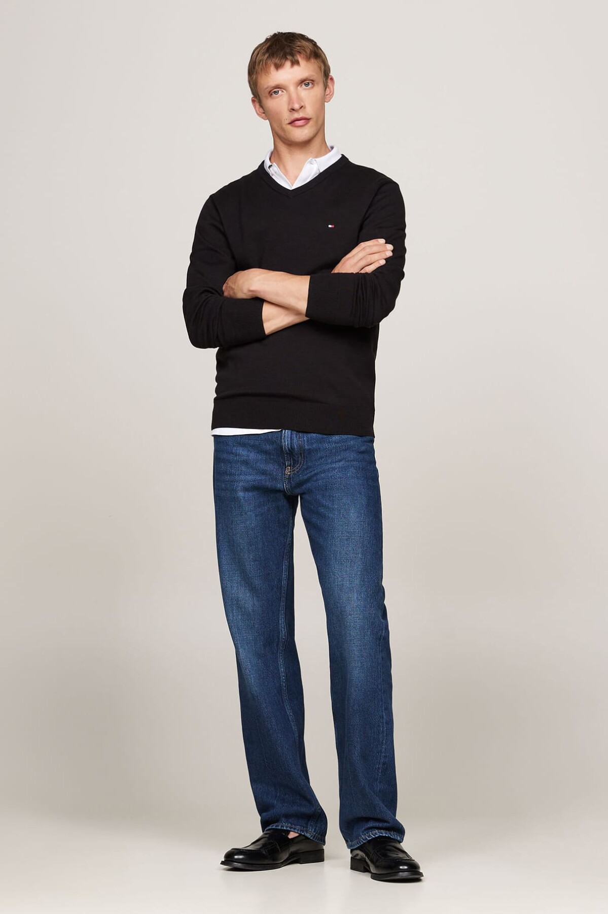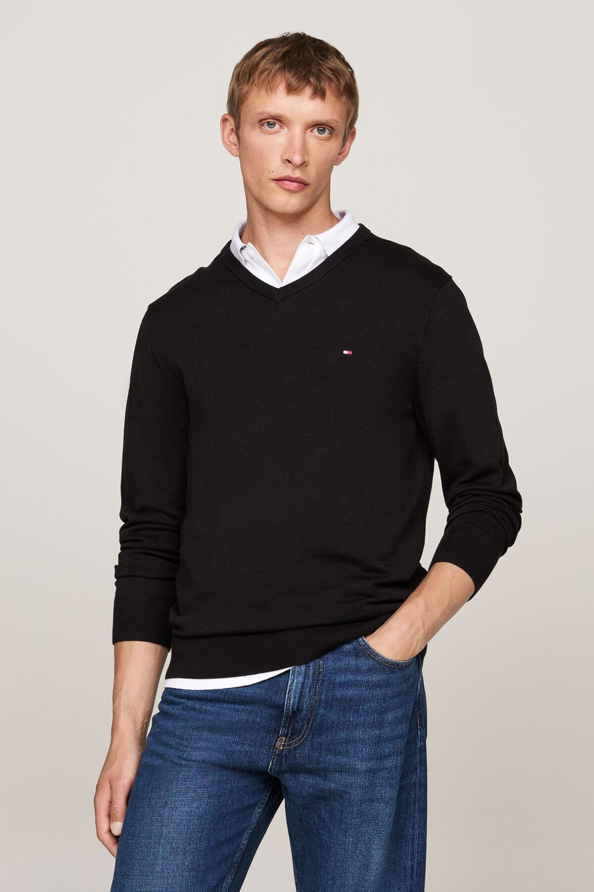 Zamana meydan okuyan V yaka kesimiyle bu triko kazak, her erkeğin gardırobunda olması gereken temel parçalardan biridir. Nefes alan, yumuşacık %100 pamuklu triko dokusuyla gün boyu konfor sunar. V yaka tasarımı, hem tişörtler hem de gömlekler üzerine katmanlı bir stil yaratmak için idealdir. Regular fit (tam kalıp) kesimi ve göğüsteki minimalist nakış logosuyla sade bir şıklık vadeder.