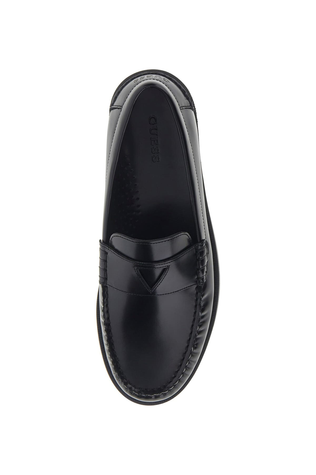 Detay: Bant üzerinde üçgen logo, tırtıklı burun dikişi