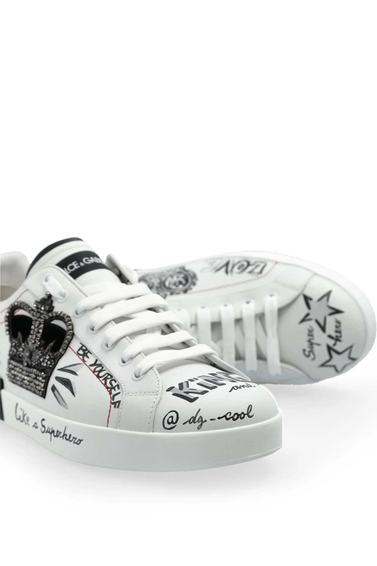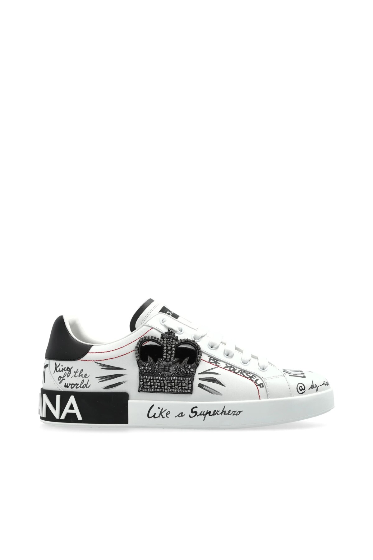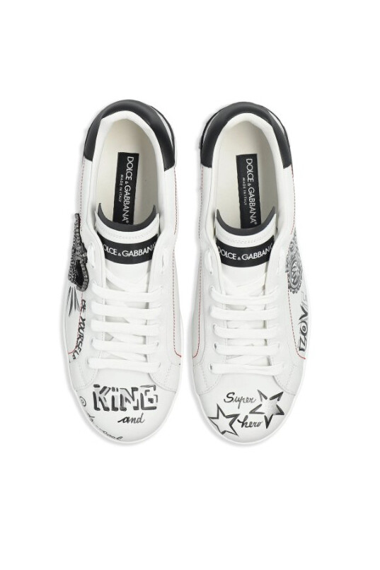 İtalyan lüksünü ve asi sokak stilini bir araya getiren bu sneakers, sanatsal detaylarıyla adımlarınıza karakter katıyor. Üstün kaliteli beyaz dana derisi üzerinde yer alan büyük, siyah ve parlak taş işlemeli taç aplikesi, ayakkabının odak noktasını oluşturur. Tasarım, ayakkabının çeşitli yerlerine dağılmış el yazısı stilindeki baskılar, kırmızı dikiş detayları ile zenginleştirilmiştir. Kauçuk tabanını çevreleyen siyah panel üzerindeki büyük harfli logo yazısı, bu göz alıcı ve lüks ayakkabının cesur stilini tamamlar.