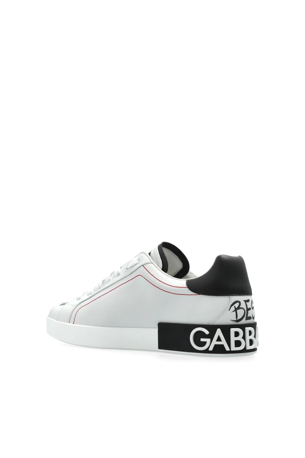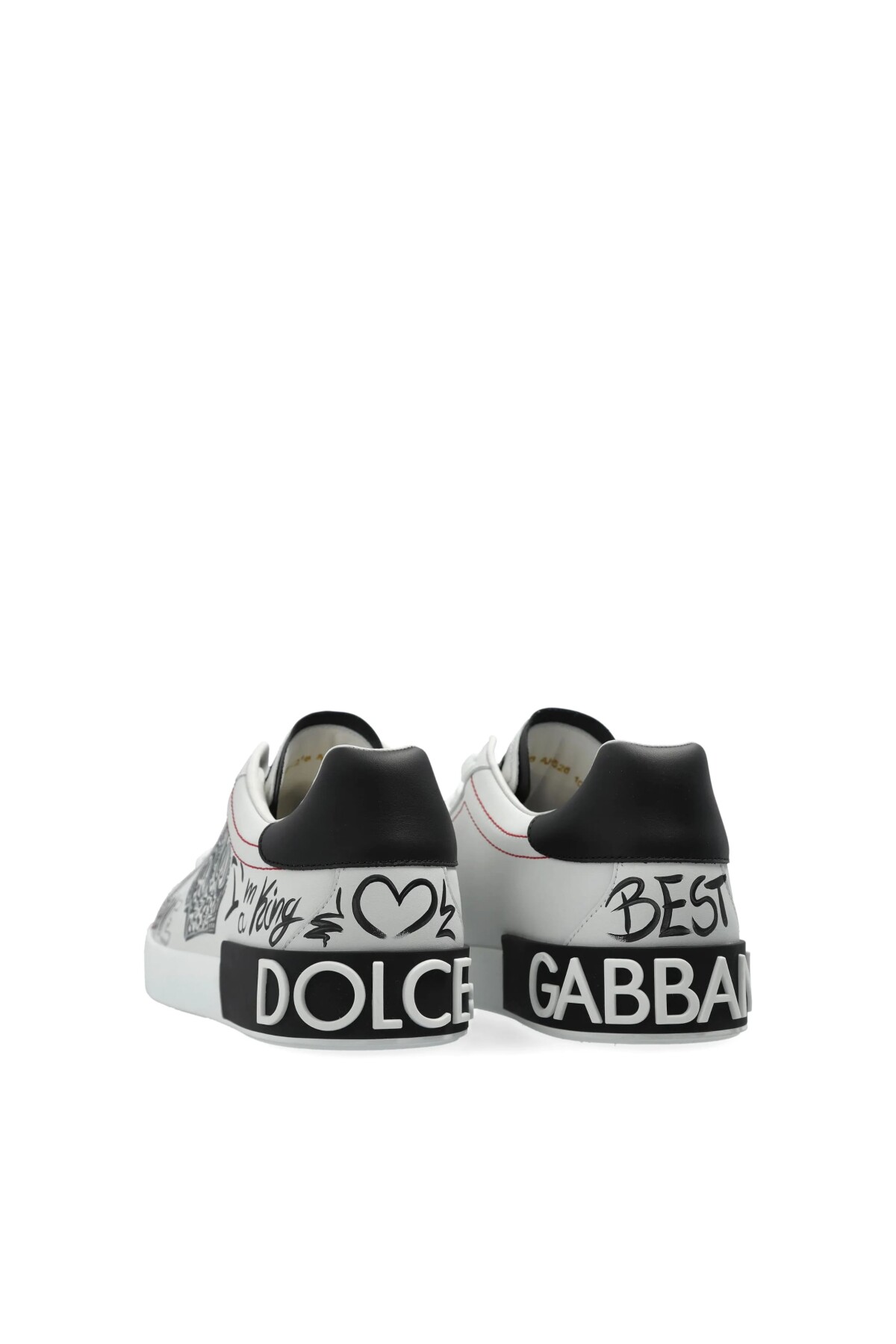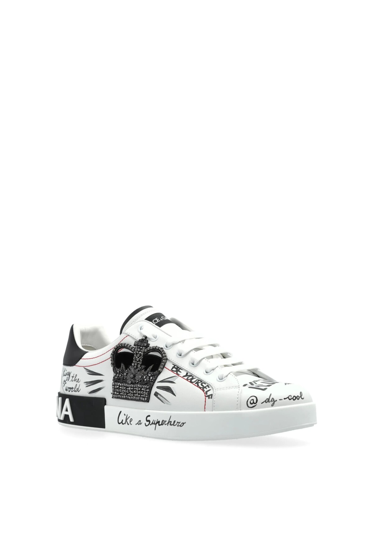 İtalyan lüksünü ve asi sokak stilini bir araya getiren bu sneakers, sanatsal detaylarıyla adımlarınıza karakter katıyor. Üstün kaliteli beyaz dana derisi üzerinde yer alan büyük, siyah ve parlak taş işlemeli taç aplikesi, ayakkabının odak noktasını oluşturur. Tasarım, ayakkabının çeşitli yerlerine dağılmış el yazısı stilindeki baskılar, kırmızı dikiş detayları ile zenginleştirilmiştir. Kauçuk tabanını çevreleyen siyah panel üzerindeki büyük harfli logo yazısı, bu göz alıcı ve lüks ayakkabının cesur stilini tamamlar.