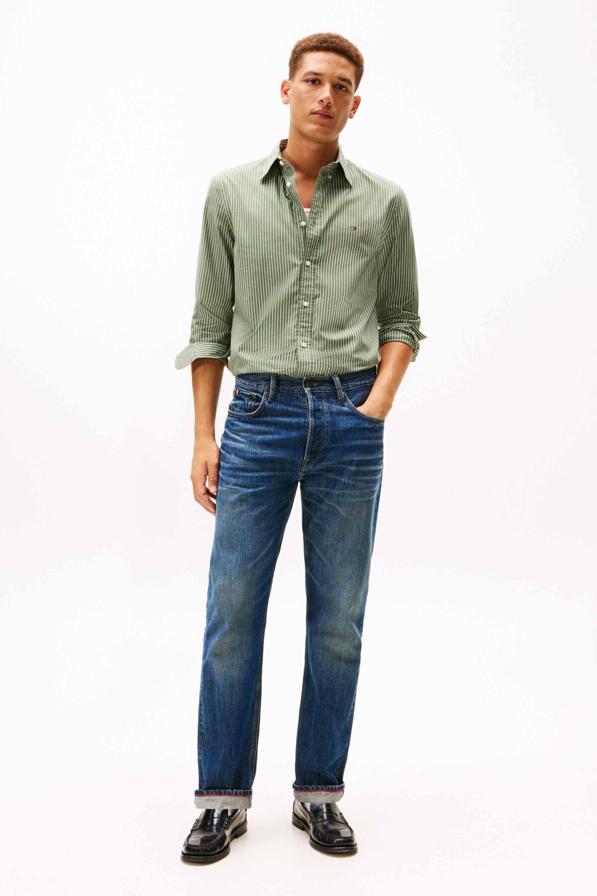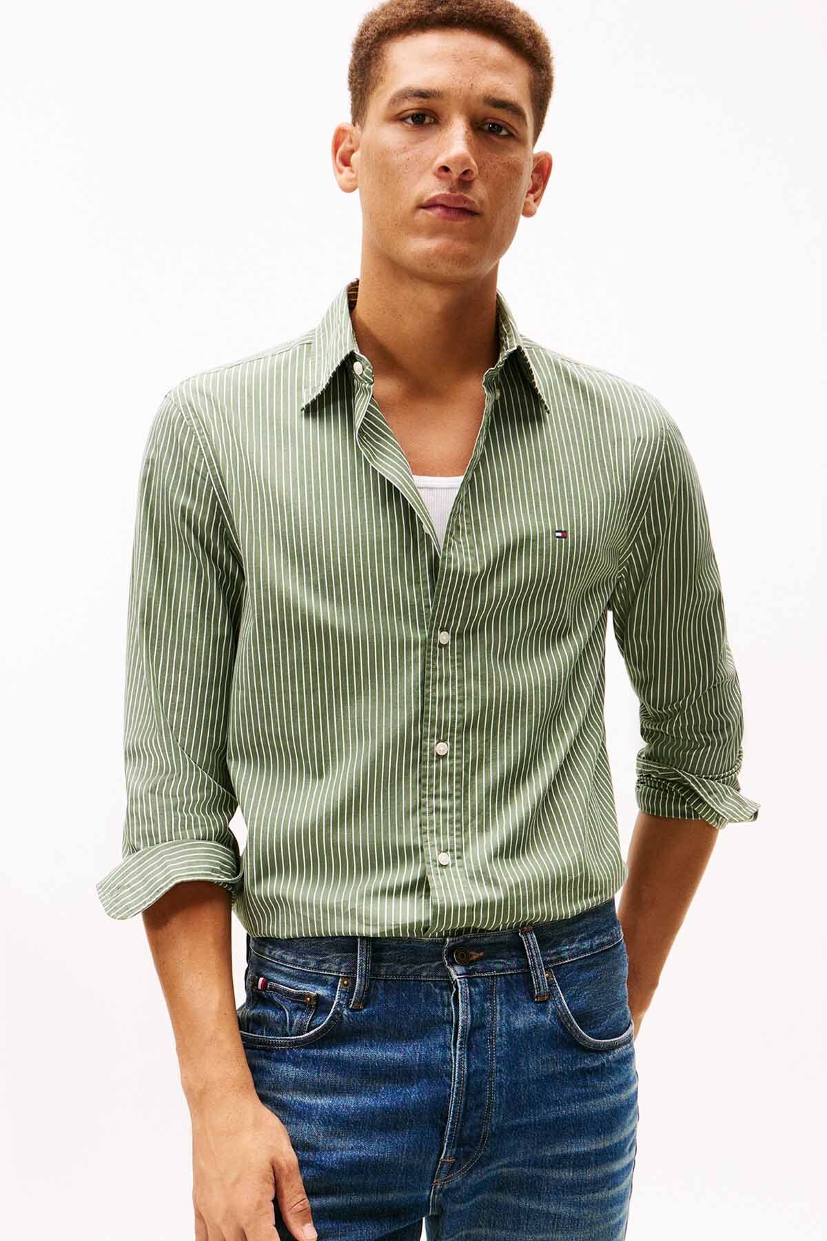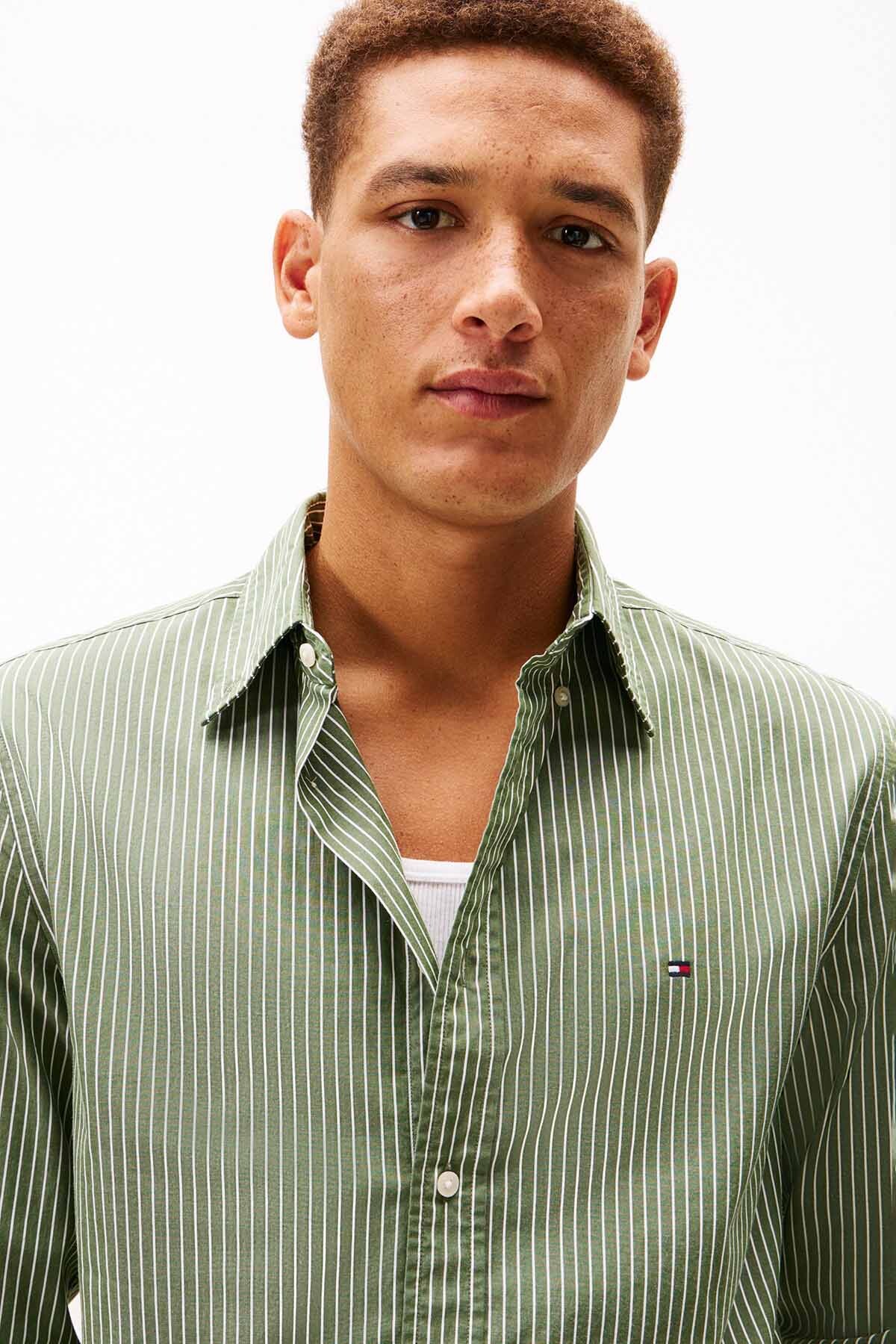 %100 pamuklu poplin dokusunun doğal ferahlığını yenilikçi Flex teknolojisiyle birleştiren bu gömlek, esnek yapısıyla hareket özgürlüğünü kısıtlamadan gün boyu dinamik ve konforlu bir kullanım sunar. Dikey ince çizgi deseni, klasik yeşil tonuyla birleşerek hem ofis ciddiyetine hem de hafta sonu enerjisine uyum sağlayan sofistike bir duruş sergiler. Yaka uçlarındaki düğme detayı, yakanın her zaman formunu korumasını sağlarken; kavisli etek ucu tasarımı pantolon içinde veya dışında kullanım kolaylığı yaratır. Vücudu sıkmadan saran tam kalıbı, şıklığından ödün vermeden rahat etmek isteyenler için ideal bir denge oluşturur.