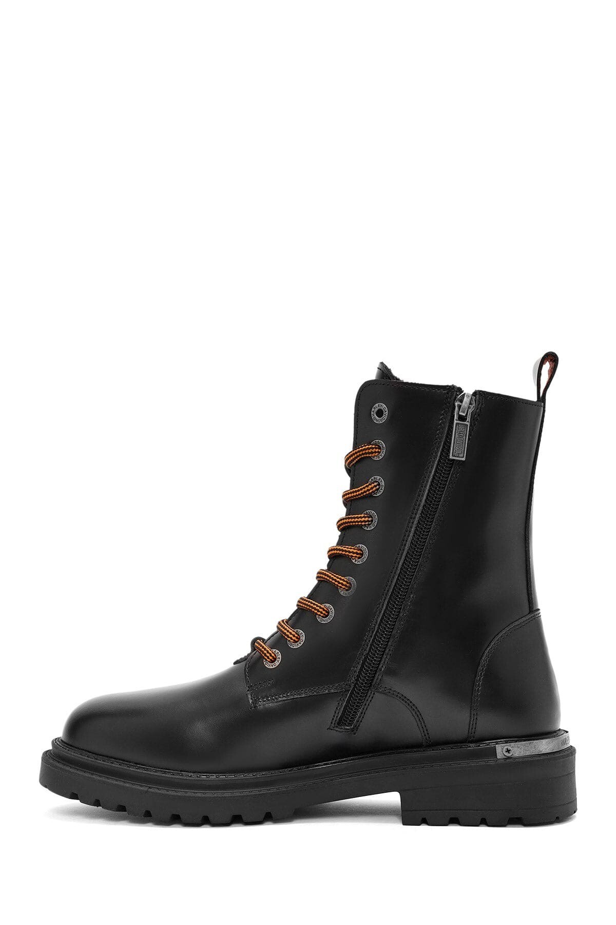Asi ruhu ve sağlam duruşu simgeleyen bu siyah deri bot, kış aylarının vazgeçilmezi olmaya aday. Birinci sınıf deri malzemesi, zorlu hava koşullarına meydan okurken, kalın dişli taban yapısı zemine sıkı tutunarak güvenli adımlar atmanızı sağlar. Bağcıklı tasarımın klasik şıklığını, yan tarafta bulunan fermuarın giyim kolaylığıyla buluşturan model, turuncu detaylı bağcıklarıyla tasarıma dinamik ve enerjik bir hava katıyor. Hem şehir hayatında hem de açık hava aktivitelerinde tarzınızdan ödün vermeden konforu yakalayın.