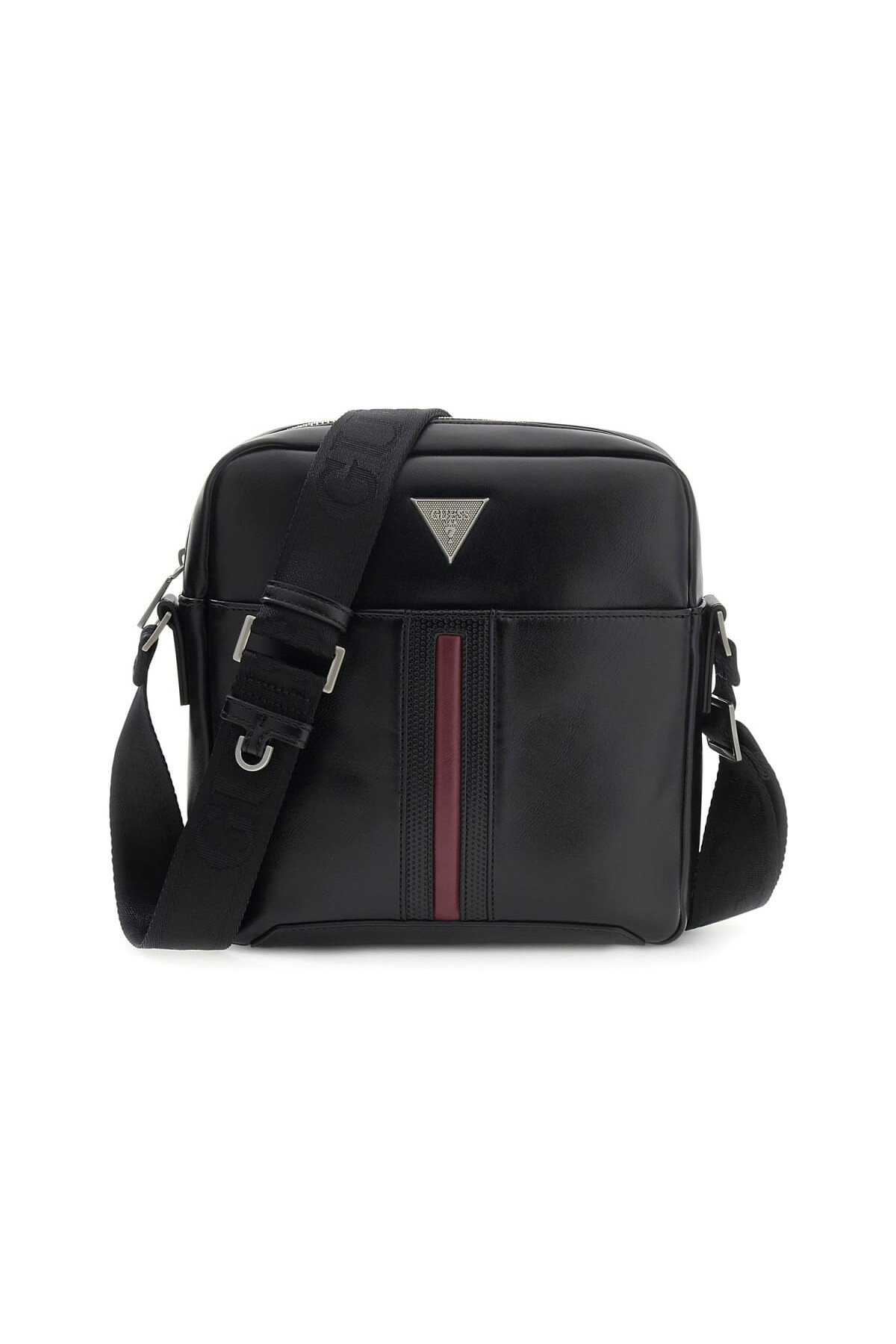 Detay: Gümüş renkli üçgen metal amblem ve bordo şerit vurgusu
