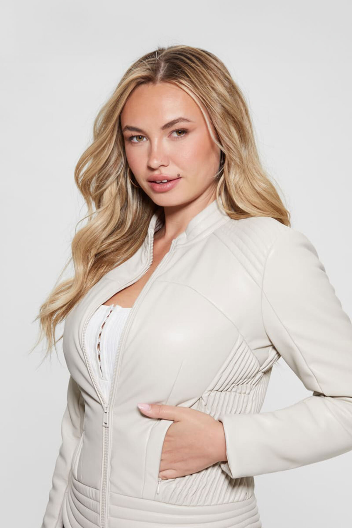 Kadın Suni Deri Ceket-Krem