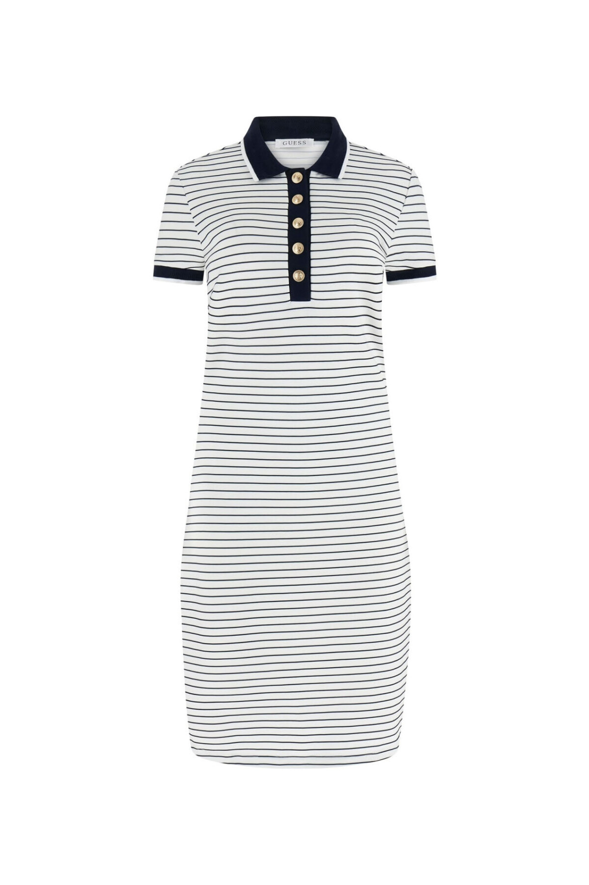 Guess koleksiyonunun marin stilinden ilham alan Alphonsin elbise, klasik polo yaka formunu modern ve feminen bir silüetle birleştiriyor. %55 viskoz, %25 polyamid, %15 polyester ve %5 elastan karışımlı zengin kumaş dokusu, viskozun yumuşaklığını elastanın hareket özgürlüğü sunan esnek yapısıyla buluşturur. Beyaz zemin üzerine lacivert yatay çizgili deseniyle zamansız bir şıklık sunan model, günlük gardırobunuzun en konforlu ve stil sahibi parçalarından biri olmaya adaydır.