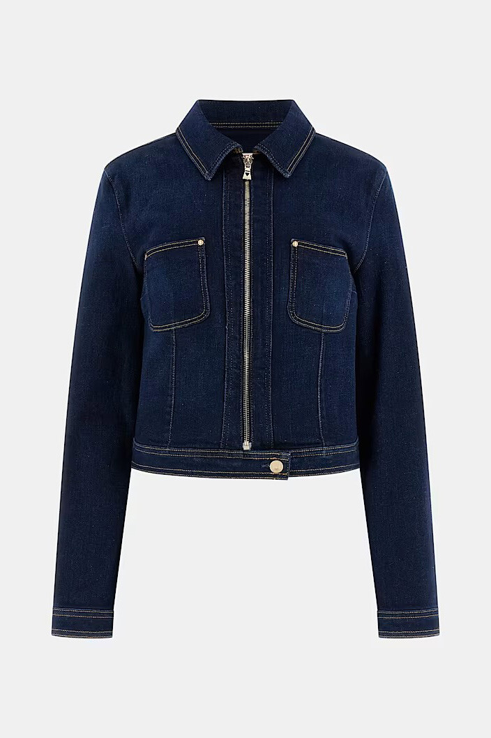 Bluebelle Joy yıkamasının derin ve sofistike lacivert tonunu, klasik denim ceket formundan ayrışan modern detaylarla buluşturan Amelie ceket, şıklığı ve ciddiyeti bir arada sunuyor. %92 pamuk, %6 polyester ve %2 elastan karışımından oluşan kumaşı; pamuğun doğal dokusunu korurken, tok duruşuyla vücut hatlarını kusursuzca çerçeveliyor. Tasarımın en belirgin özelliği olan ön kısımdaki metal fermuar kapaması ve göğüs ile bel bölümündeki fermuarlı cep detayları, cekete motorcu ceketlerini andıran dinamik ve şehirli bir hava katıyor. 47 cm'lik Cropped boyu ve kontrast tütün rengi dikişleri, özellikle yüksek belli parçalarla mükemmel bir uyum yakalıyor.