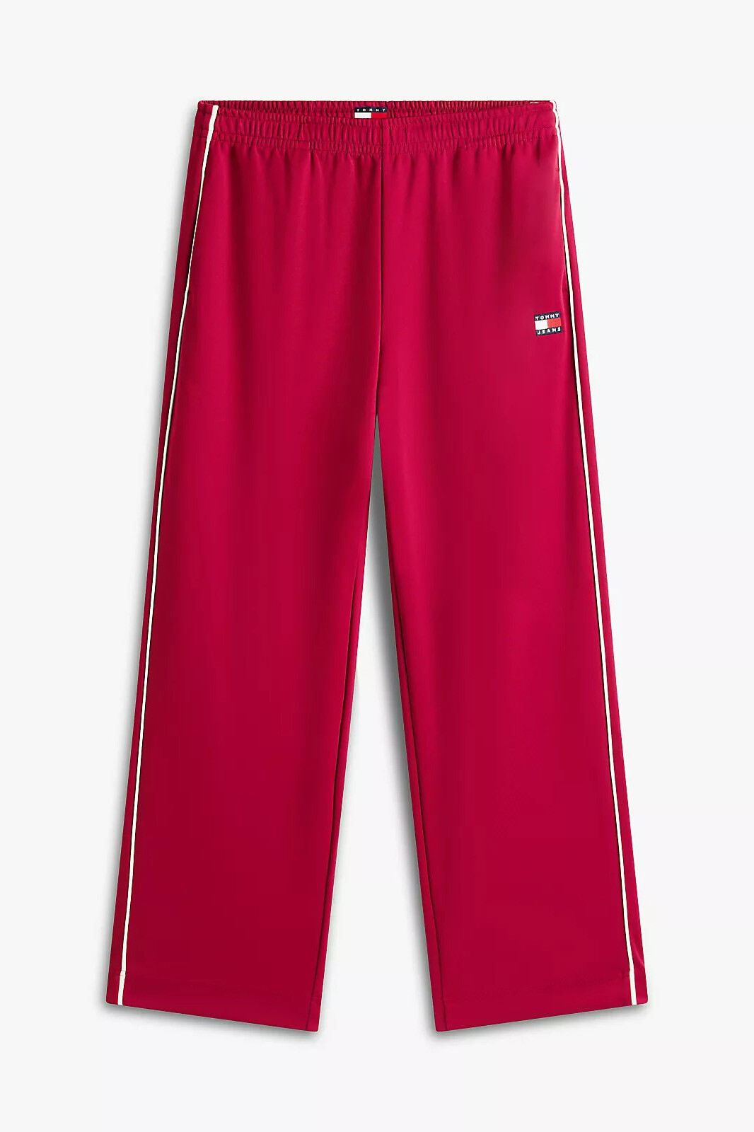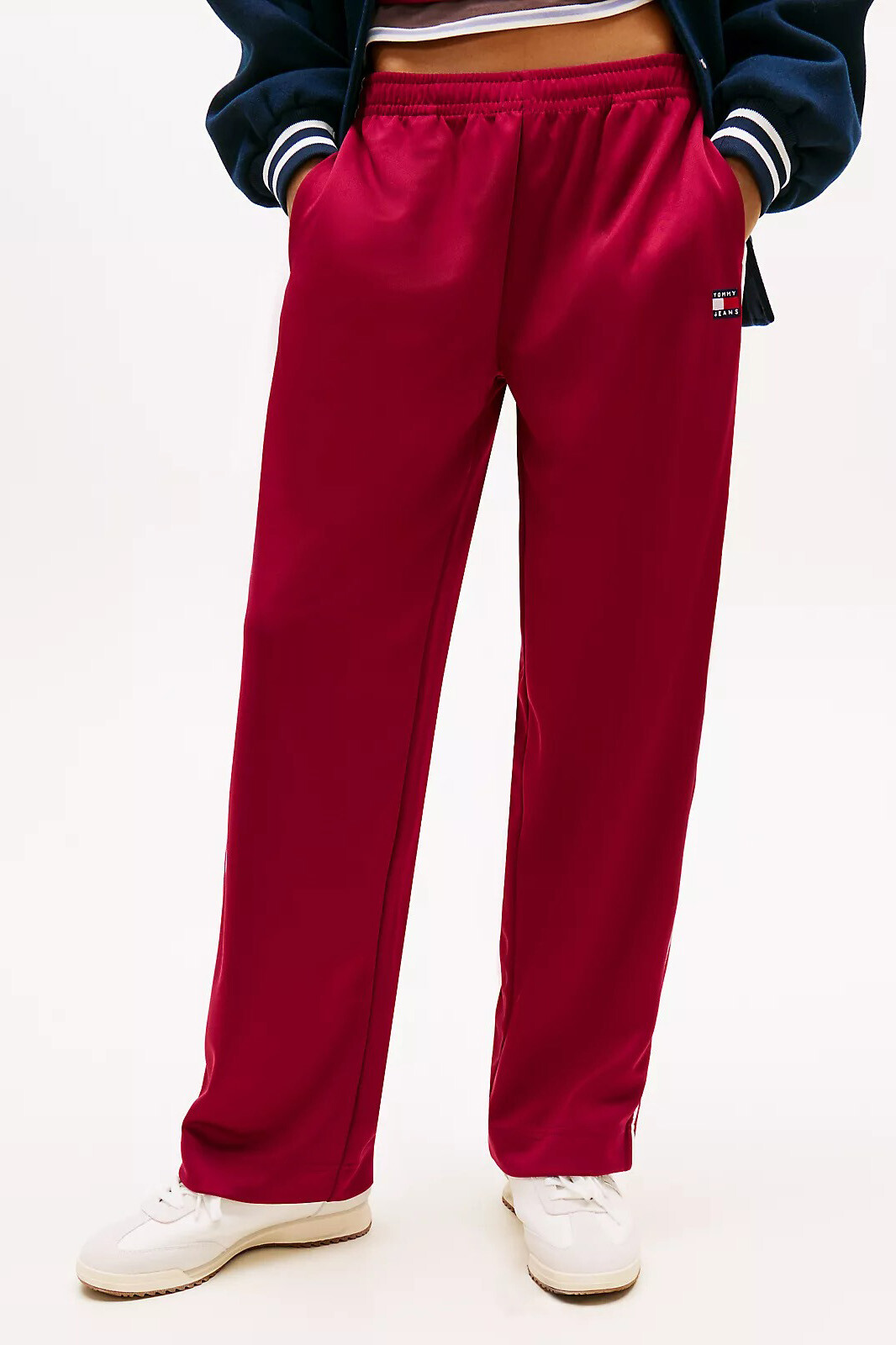 %89 polyester ve %11 elastan karışımlı pürüzsüz kumaş yapısı, dayanıklılığı esnek bir konforla buluşturarak gün boyu hareket özgürlüğü sağlar. Canlı ahududu pembesi tonunun enerjisi, yanlarda boydan boya uzanan kontrast beyaz şeritlerle birleşerek retro spor giyim modasını modern sokak stiline taşır. Vücudu sıkmayan tam kalıbı ve aşağıya doğru dökümlü inen boru paça tasarımı, hem rahat hem de şık bir silüet oluşturur. Bel kısmındaki büzgülü lastik detayı pratik bir kullanım sunarken, sol üst kısımda yer alan ikonik logo yaması tasarıma markanın imzasını atar.