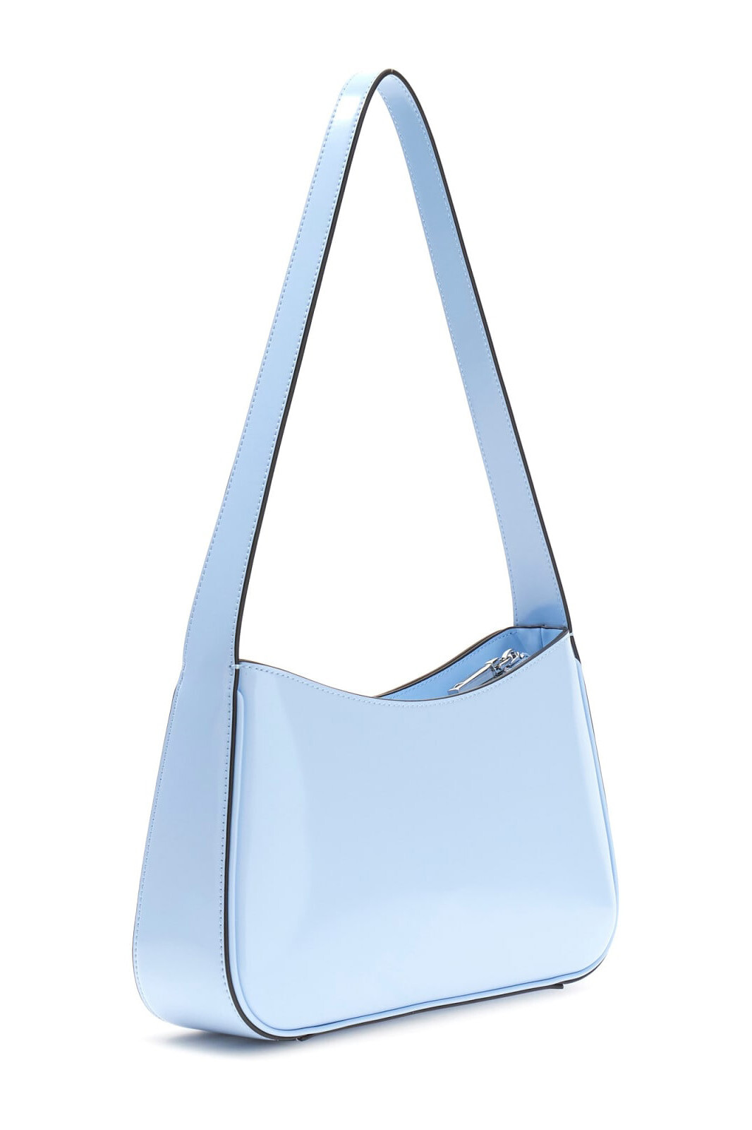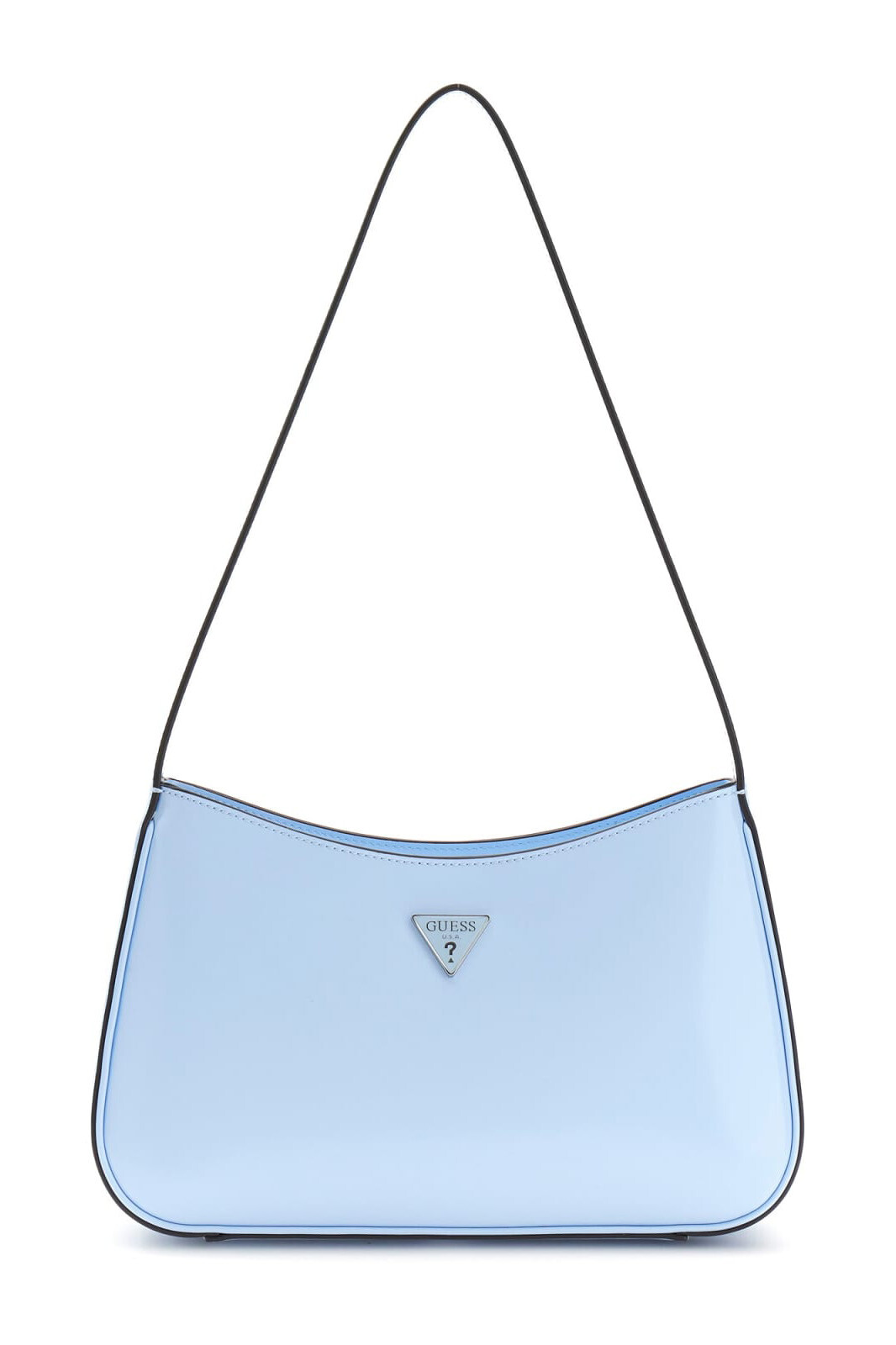 Şehir yaşamının dinamizmine eşlik eden zarif Hobo formuyla öne çıkan bu aksesuar, rugan görünümlü parlak dış yüzeyi ve gökyüzü mavisinin huzur veren tonuyla karakteristik bir duruş sergiler. Üstten fermuarlı güvenli kapama sistemi ve omuzda konforlu taşıma sunan tek askı detayıyla işlevselliği ön planda tutan çanta; ön paneldeki ikonik üçgen logo amblemi ve metalik aksamlarıyla seçkin bir stilin anahtar parçasıdır. Gerek günlük kombinlerde gerekse sofistike akşam davetlerinde çabasız bir şıklık vadeden bu parça, gardırobunuzun en ferah imzası olmaya adaydır.