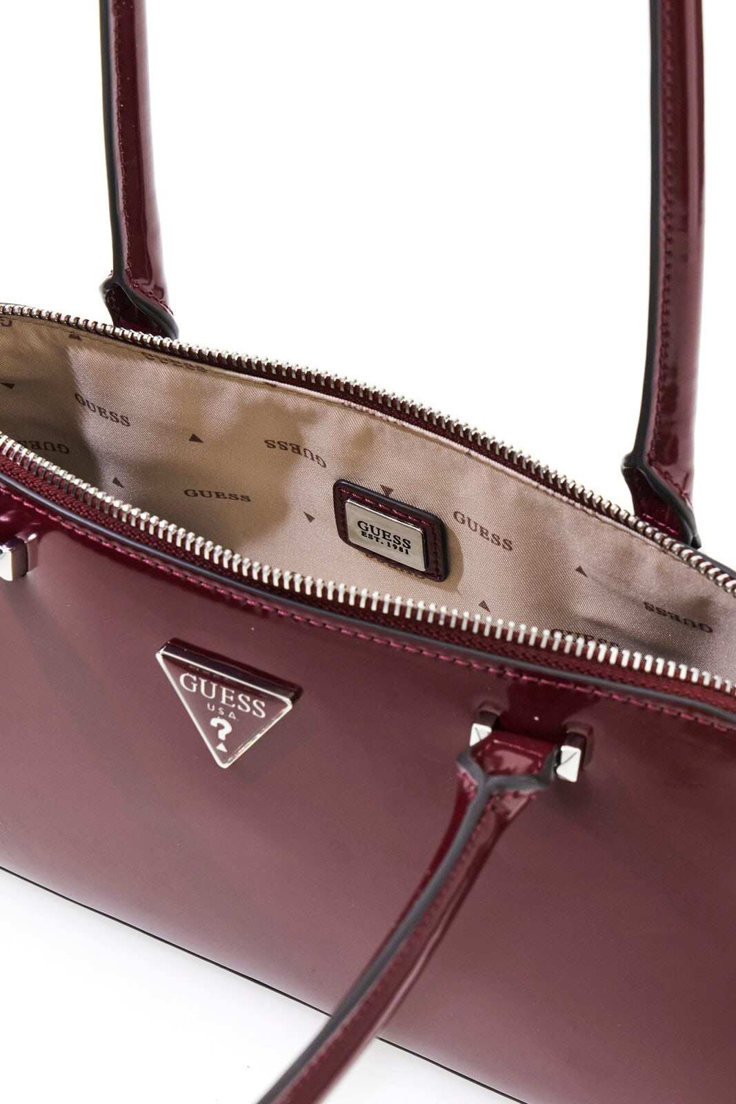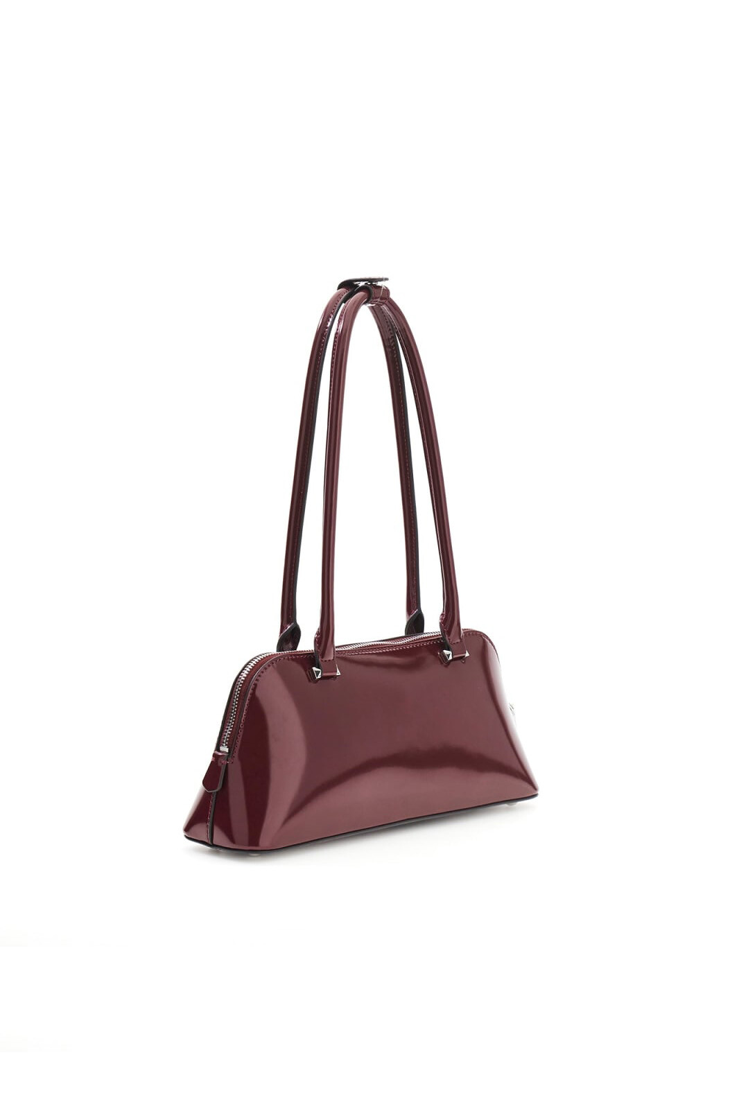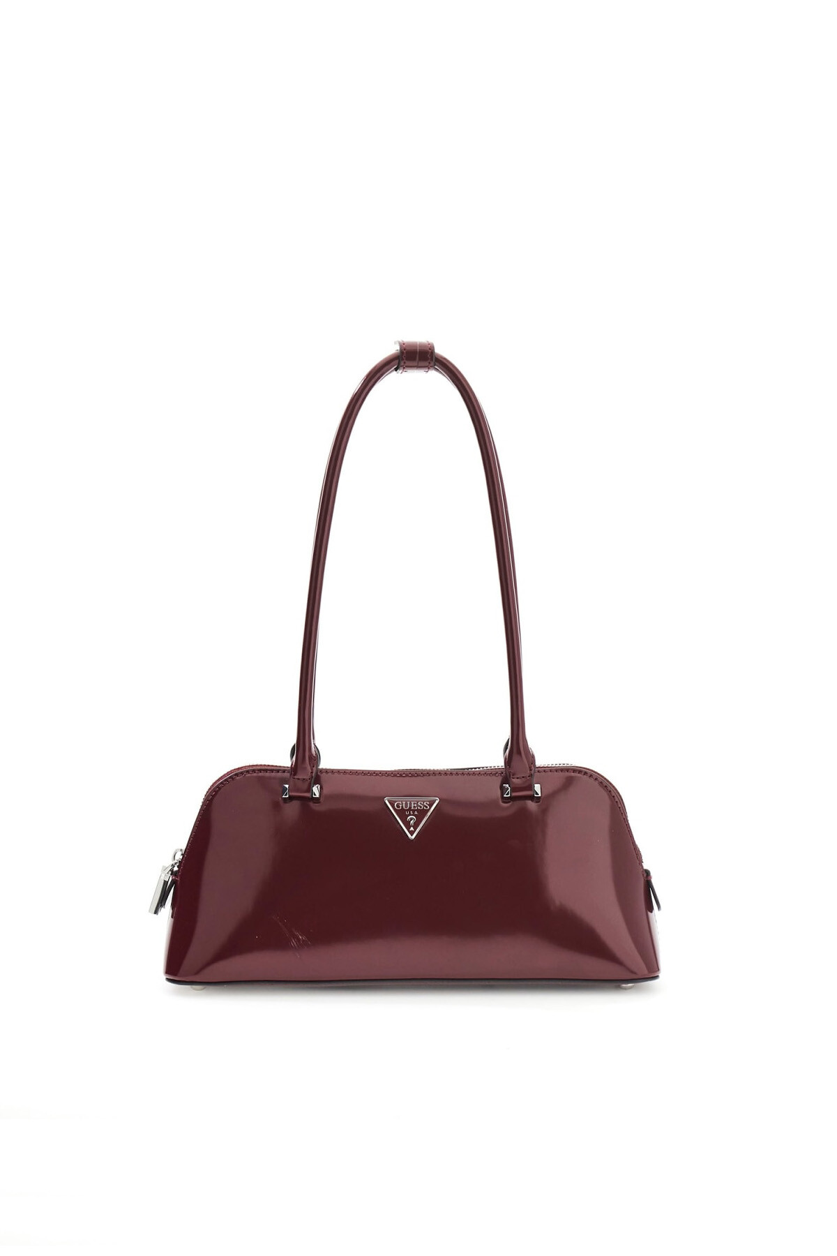 Bordo renginin derin ve asil tonunu, ışığı yansıtan parlak rugan görünümlü yüzeyiyle buluşturan Arnela çanta, 90'ların ikonik baguette stilini modern bir zarafetle sunuyor. %100 poliüretan malzemeden üretilen, 30 cm genişliğindeki bu yatay ve yapılandırılmış model; ön yüzdeki gümüş tonlu üçgen metal logo detayı ile ışıltılı bir duruş sergiliyor. Yaklaşık 24 cm uzunluğundaki sabit ikili sap tasarımı, çantayı omzunuzda ideal yükseklikte ve konforla taşımanıza olanak tanıyor. Üstten fermuarlı ana bölmesi, içerisindeki logolu astarı ve fermuarlı iç cebi ile telefon, cüzdan ve makyaj malzemeleri gibi temel ihtiyaçlarınız için şık ve güvenli bir alan sağlıyor.