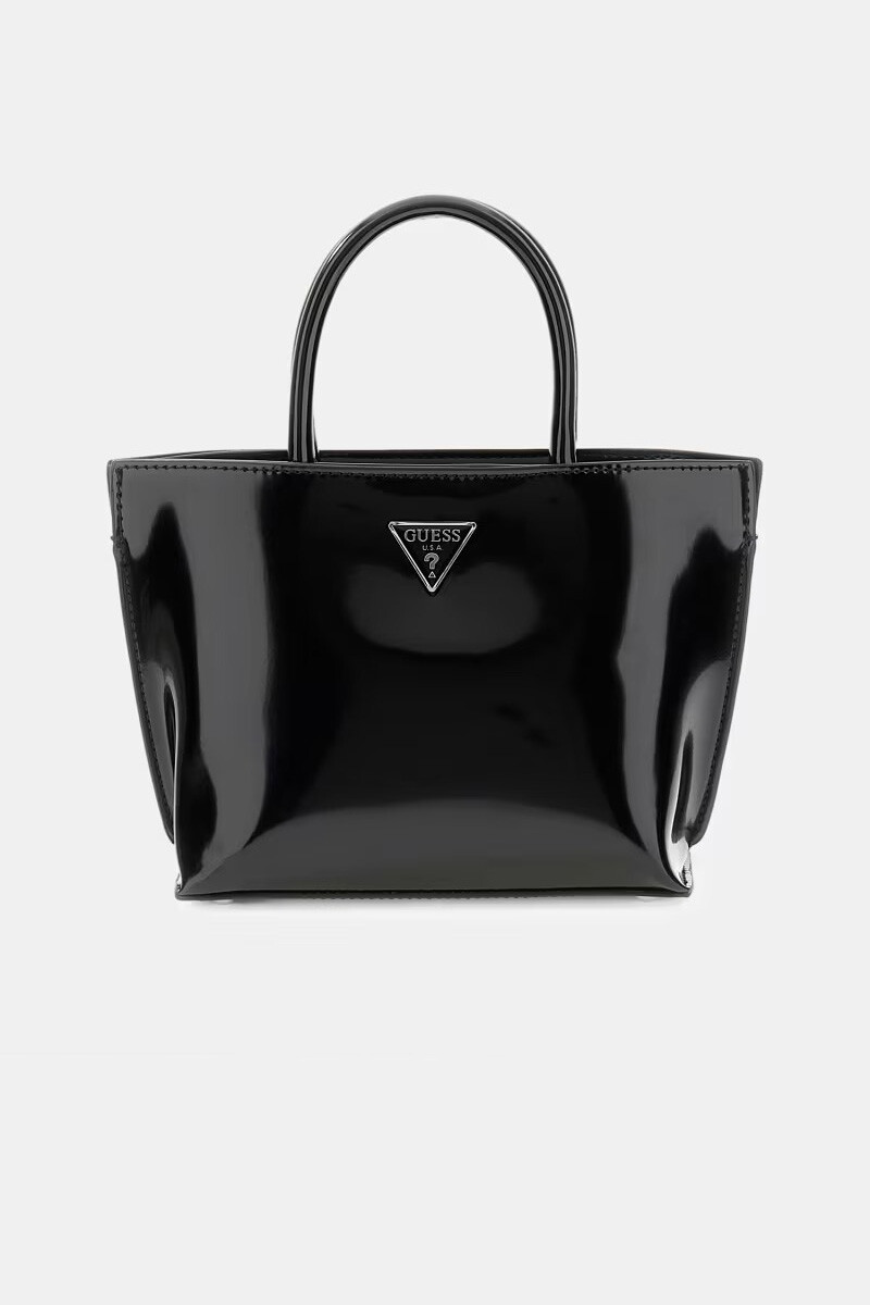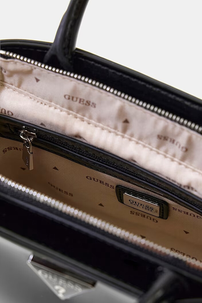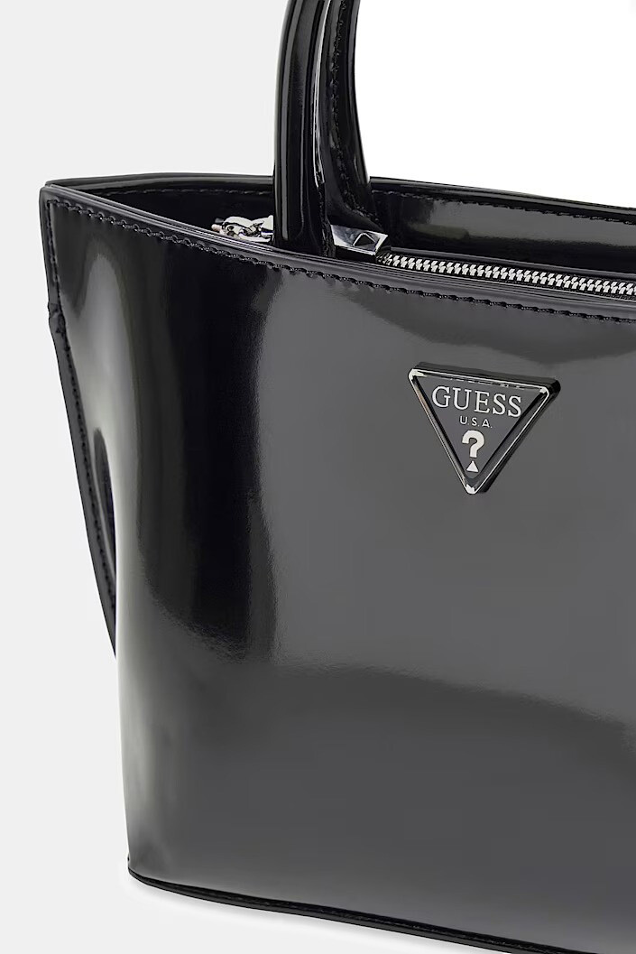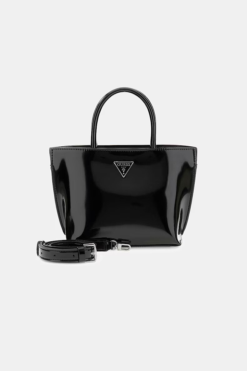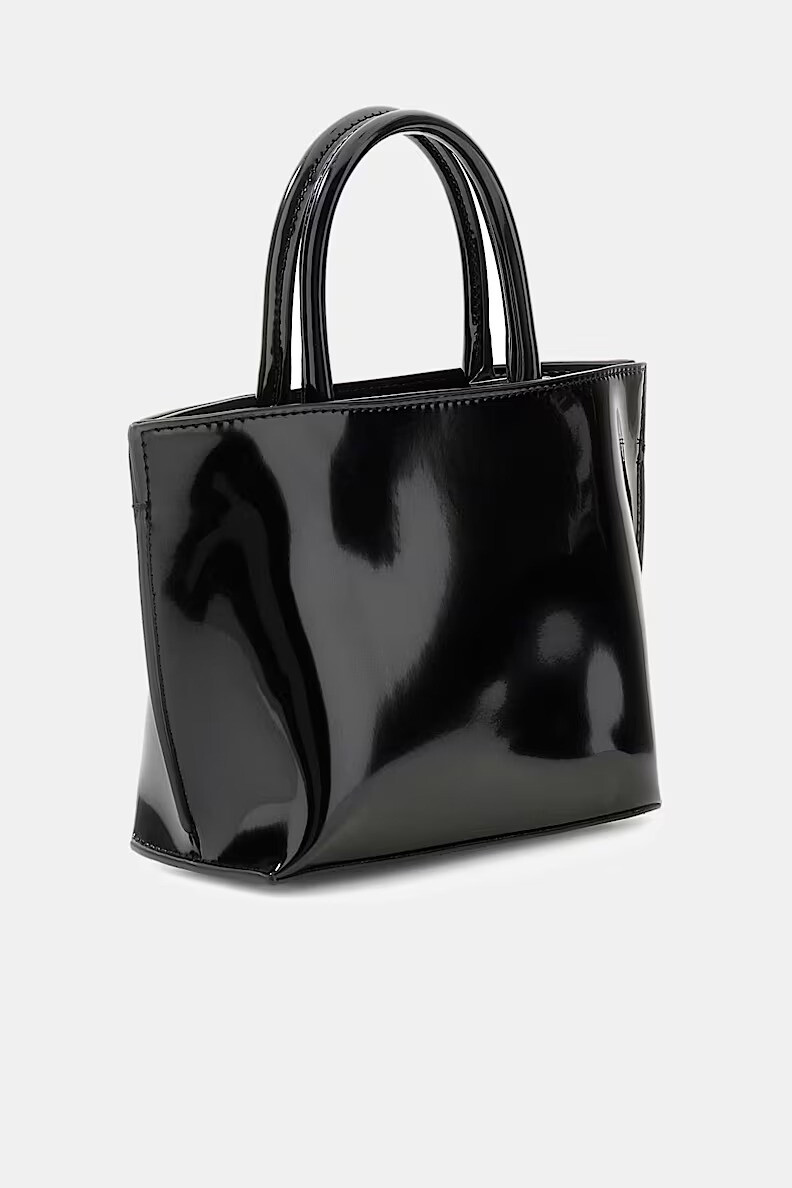 Siyahın zamansız şıklığını rugan görünümlü parlak dokusuyla modernize eden Arnela tote çanta, stilinize çarpıcı bir ışıltı katıyor. Kompakt ve net hatlara sahip tasarımı, ön yüzdeki gümüş renkli metal üçgen logo detayıyla zenginleştirilerek markanın ikonik duruşunu sergiliyor. Fermuarlı ana kapama sistemi sayesinde eşyalarınızı güvenle muhafaza eden model, iç kısımdaki fermuarlı cep detayıyla pratik bir düzenleme alanı sunuyor. Yaklaşık 9 cm uzunluğundaki sapı ile elde zarif bir duruş sergilerken, yaklaşık 56 cm uzunluğundaki ayarlanabilir ve çıkarılabilir omuz askısı sayesinde çapraz veya omuzda kullanım özgürlüğü tanıyor.