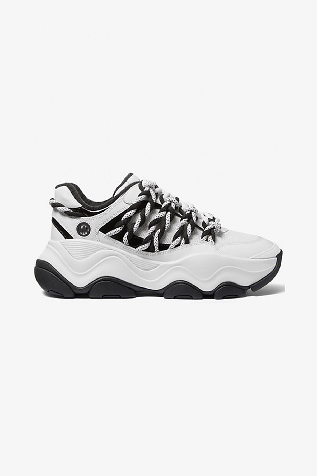 Cesur ve modern bir stil arayanlar için tasarlanan bu chunky sneakers, adımlarınıza anında hacim katıyor. En dikkat çekici özelliği olan kalın, siyah-beyaz desenli kordon bağcıkları, tasarıma benzersiz bir karakter kazandırır. Pürüzsüz panellerden oluşan beyaz üst yüzeyi, konforu ve stili bir arada sunar. Dalgalı ve kalın beyaz orta tabanı, siyah dış tabanla kontrast oluşturarak hem yastıklama sağlar hem de göz alıcı bir silüet yaratır. Yan kısımdaki dairesel amblem detayı ile tamamlanan bu ayakkabı, günlük kombinlerinize iddialı bir dokunuş yapacak.