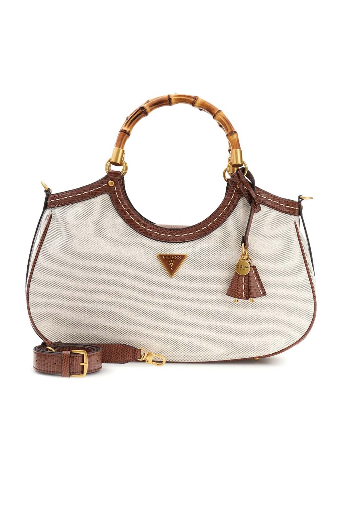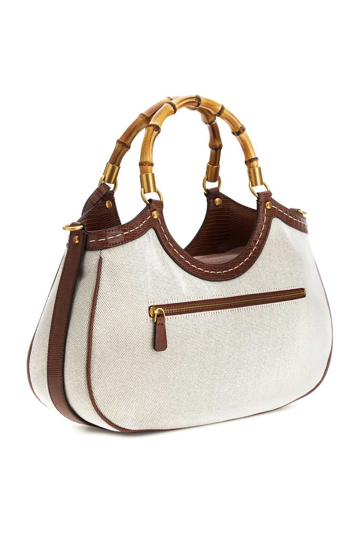 Kumaş görünümlü gövdesi ve dokulu suni deri garnisiyle dikkat çeken bu omuz çantası, zarif bir tasarıma sahiptir. Kontrast renkli dikişlerle hareketlendirilen modelin en belirgin özelliği, doğal görünümlü dairesel bambu saplarıdır. Ön yüzünde yer alan üçgen formlu metal aksesuar ve saptan sarkan püskül detayı tasarıma şıklık katar. Çıkarılabilir ve ayarlanabilir uzun askısı sayesinde çok yönlü kullanım sunarken, fermuarlı arka cebiyle pratiklik sağlar.