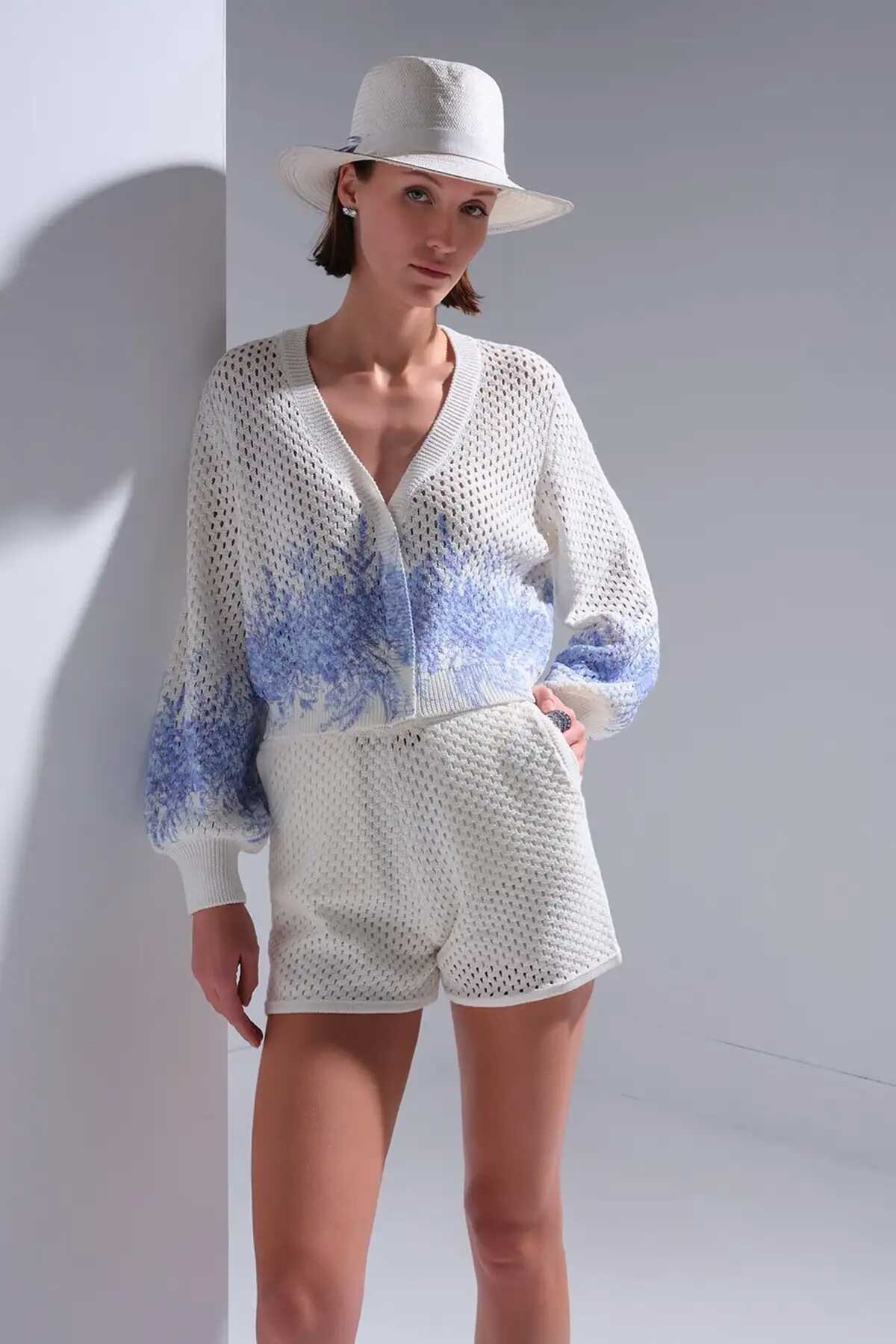 Kadın Baskı Detaylı Ajurlu Hırka - Ekru