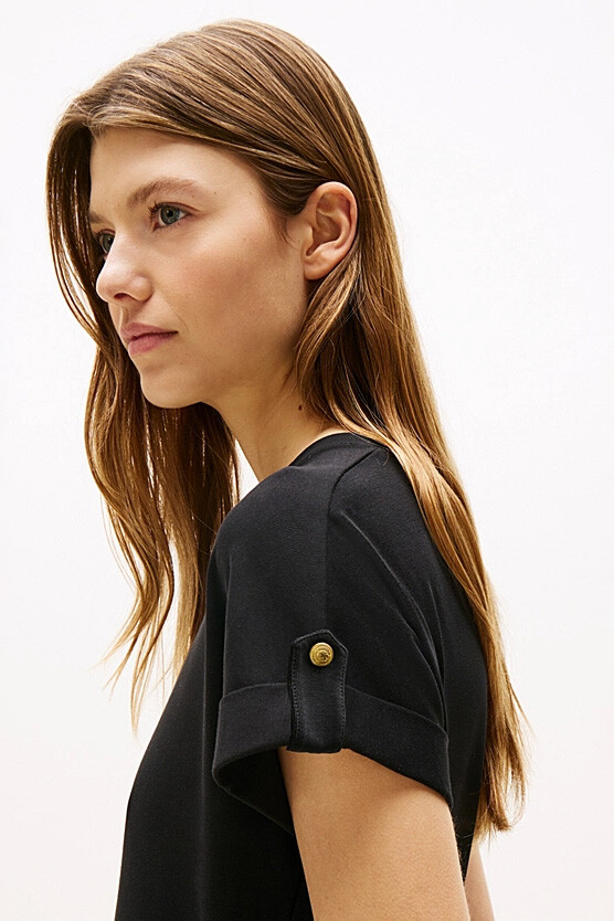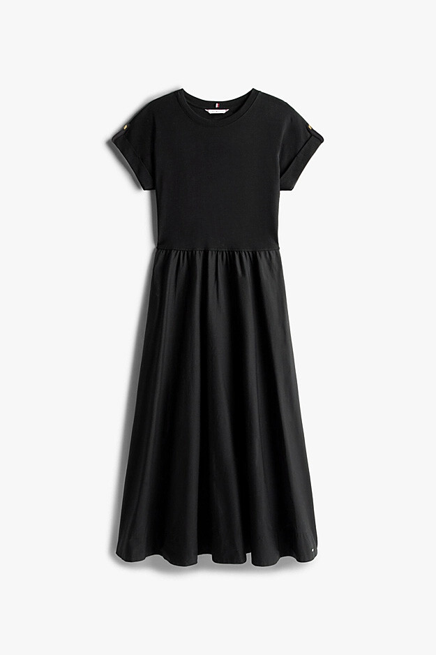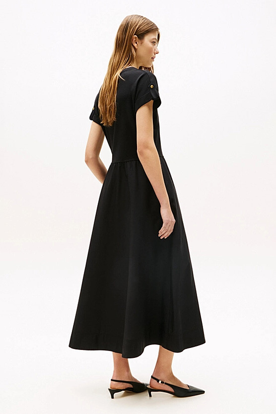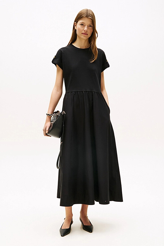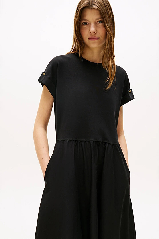 T-shirt ve etek kombinasyonunun zahmetsiz şıklığını tek parçada sunan bu elbise, modern ve rahat bir stilin anahtarıdır. Üst kısmındaki rahat penye kumaş ile alt kısmındaki dökümlü poplin eteği bir araya getiren bu tasarım, konforu ve zarafeti buluşturur. Beli büzgülü yapısı vücut hatlarını zarifçe belirginleştirirken, %100 pamuklu kumaşı gün boyu nefes alabilirlik sunar. Kıvrık kol uçlarındaki metal düğme detayları ise tasarıma sofistike bir dokunuş katar.