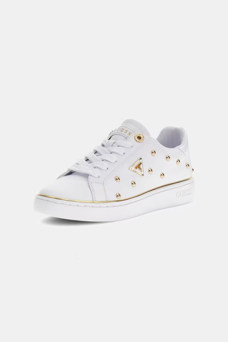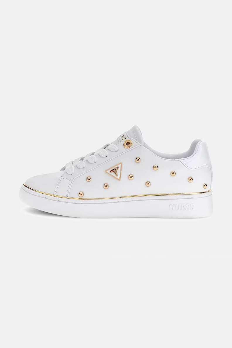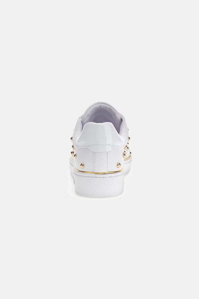 Beyaz rengin saf ve temiz enerjisini, altın rengi metalik zımba detaylarının lüks ışıltısıyla harmanlayan Bonitah sneaker, günlük stilinize sofistike bir hareketlilik katıyor. Pürüzsüz deri görünümlü yüzeyi üzerine serpiştirilmiş yuvarlak ve piramit formlu altın zımbalar, tasarıma dinamik bir doku kazandırıyor. Yan kısımda yer alan altın rengi üçgen logo ve üst kısımdaki altın bağcık kapsülleri mücevher etkisi yaratırken; topuk kısmındaki parlak rugan görünümlü detay şıklığı arka plana da taşıyor. Beyaz tabanı çevreleyen ince altın şerit ise adımlarınıza zarif bir parıltı ekleyerek tasarımı tamamlıyor.