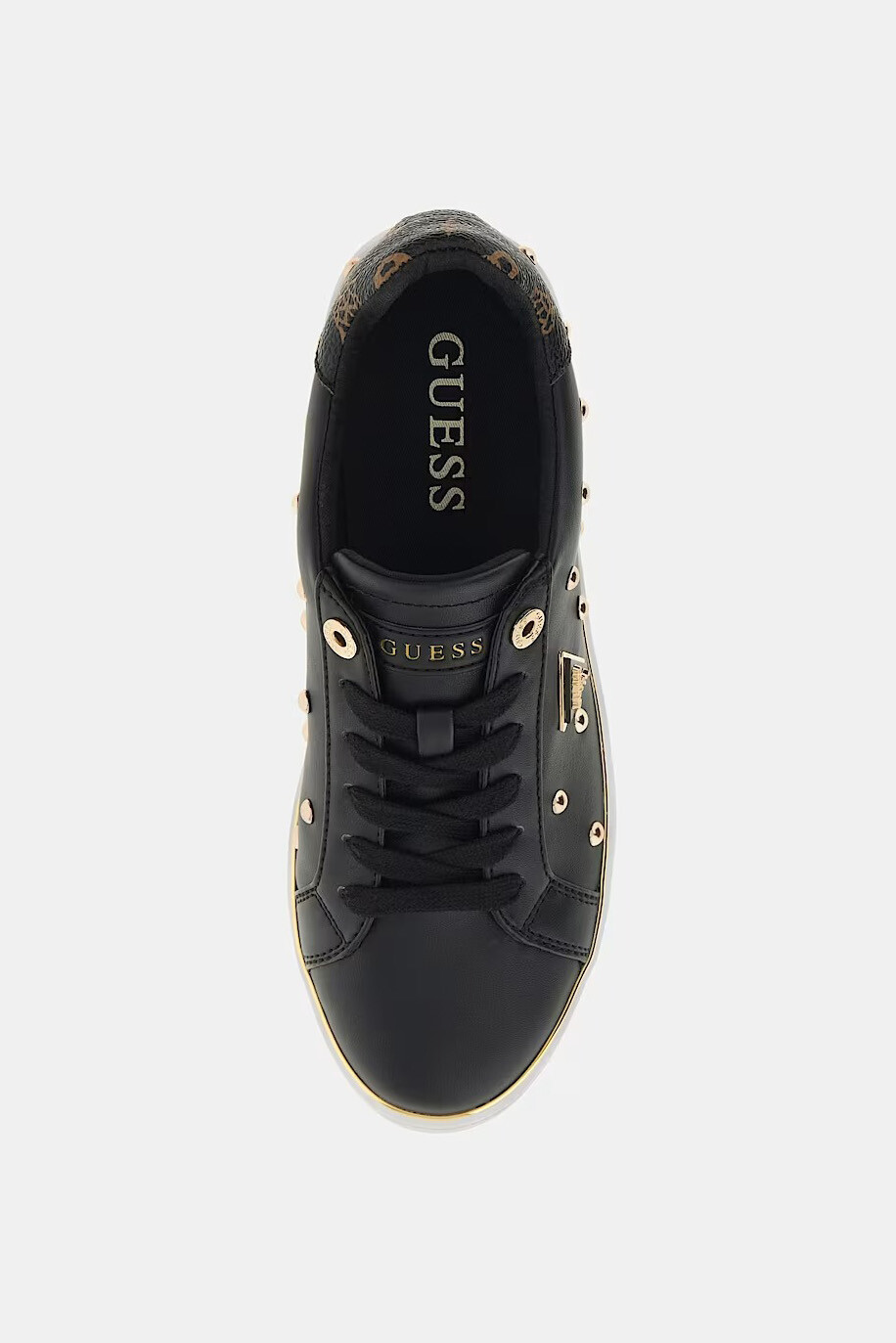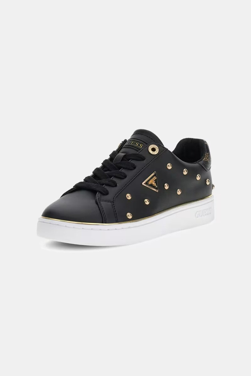 Siyah rengin güçlü ve gizemli havasını, altın rengi metalik zımba detaylarının lüks ışıltısıyla buluşturan Bonitah sneaker, sokak modasına asi ve şık bir yorum getiriyor. %100 poliüretan malzemeden üretilen bu dikkat çekici model; pürüzsüz siyah yüzeyi üzerine işlenmiş farklı boyutlardaki altın zımbalar ve yan kısımdaki metalik üçgen logo ile tasarıma mücevher ışıltısı katıyor. Ayakkabının topuk kısmında yer alan kahverengi tonlarındaki ikonik monogram desenli panel, simsiyah gövdeye zarif bir kontrast kazandırırken; 3 cm yüksekliğindeki beyaz tabanı çevreleyen ince altın şerit, adımlarınıza parıltılı bir bitiş sağlıyor.