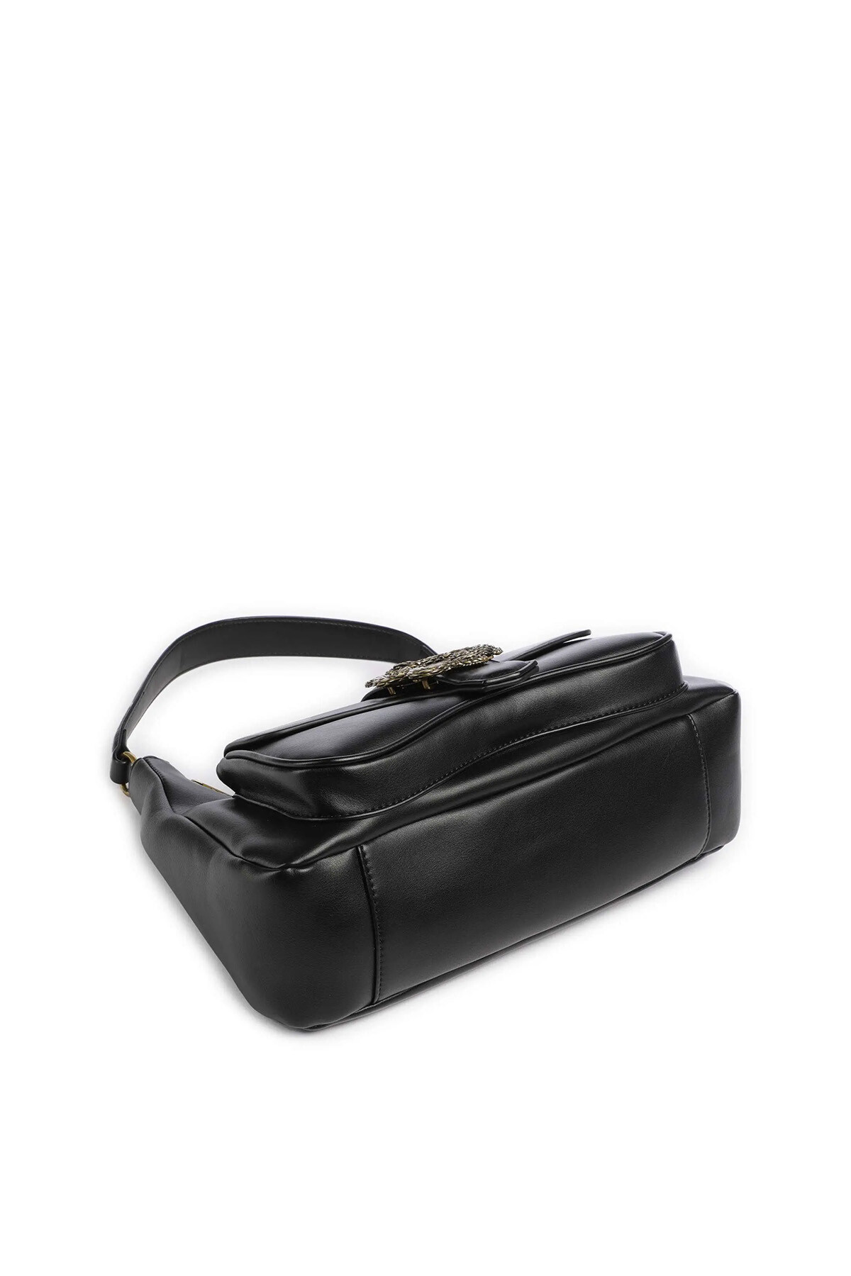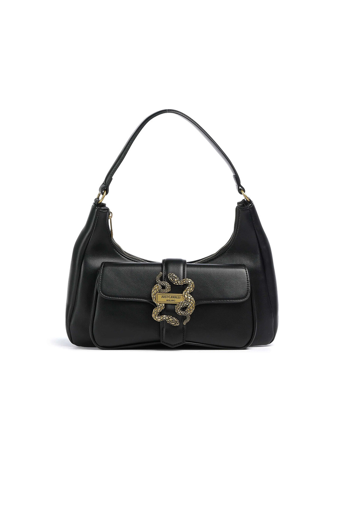 Just Cavalli'nin bu şık omuz çantası, pürüzsüz siyah poliüretan malzemeden üretilmiştir ve markanın cesur estetiğini yansıtır. Çantanın ön kısmındaki kapaklı cep üzerinde yer alan ikonik, antik altın rengi yılan motifli metal toka, tasarıma anında tanınır ve iddialı bir karakter katar. Üstten fermuarlı ana bölmesi eşyalarınızı güvende tutarken, omuz askısı rahat bir taşıma sunar. Günlük stilinize asi ve lüks bir dokunuş katmak için mükemmel bir seçimdir.