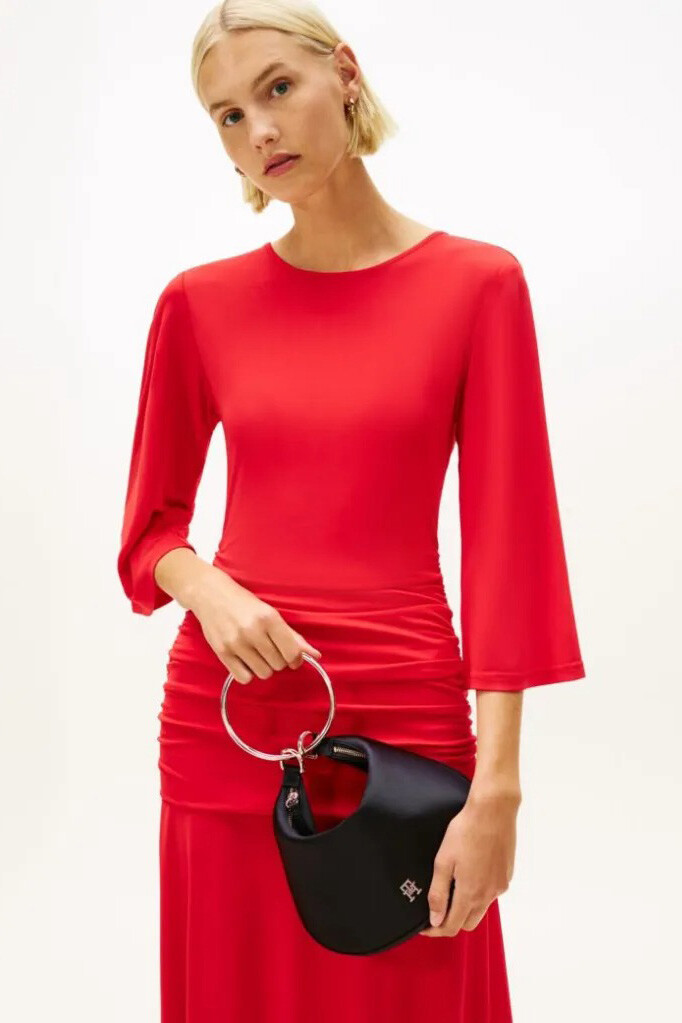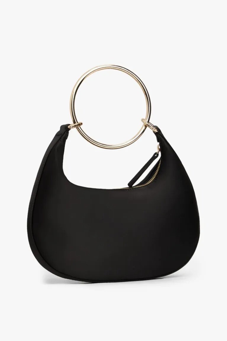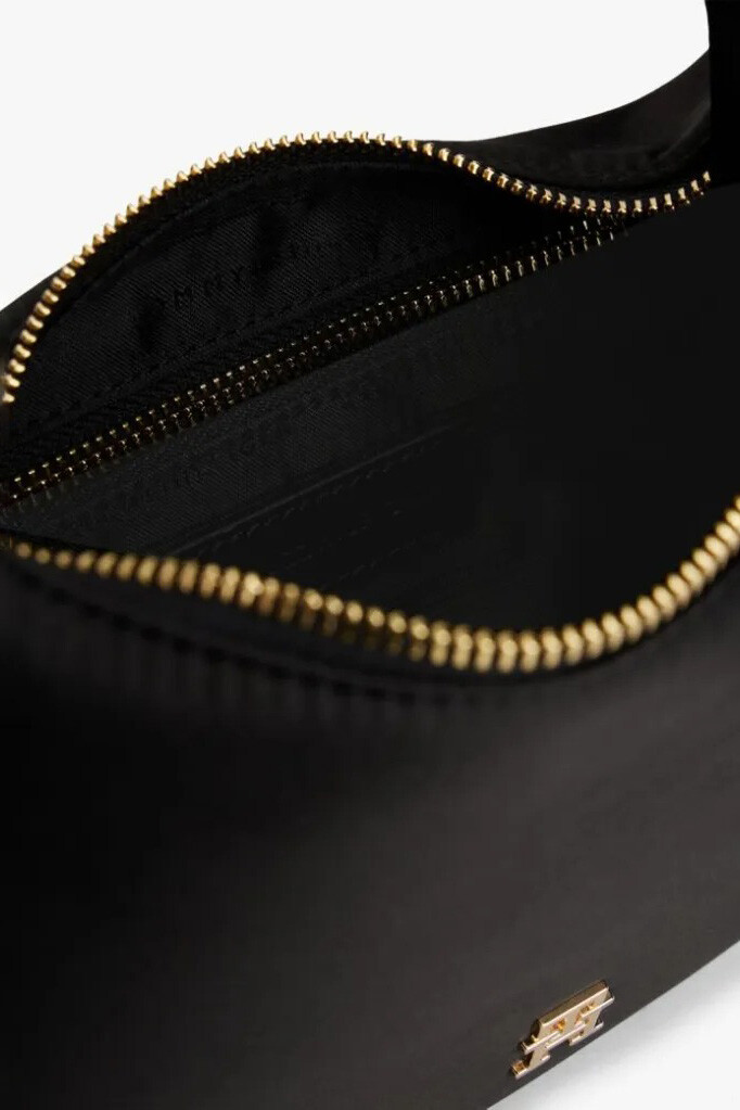 Siyahın zamansız zarafetini satenin ipeksi dokusuyla buluşturan bu Bright Bracelet Hobo, aksesuar dünyasında parlayan bir yıldız gibi. Tasarımın odak noktası olan büyük, altın renkli metal halka sapı, çantayı sadece bir taşıma aracı olmaktan çıkarıp bileğinizde taşıdığınız şık bir mücevhere dönüştürüyor. Akşam davetlerinden özel yemeklere kadar stilinizi yükseltecek bu parça, yumuşak kavisli hobo formuyla modern bir silüet sunar. Fermuarlı güvenli yapısı gece boyu ihtiyaç duyacağınız eşyaları korurken; çıkarılabilir omuz askısı sayesinde dilediğinizde ellerinizi serbest bırakarak hareket özgürlüğü kazanabilirsiniz. Ön yüzdeki zarif metal "TH" logosu ise bu lüks tasarıma son dokunuşu yapıyor.