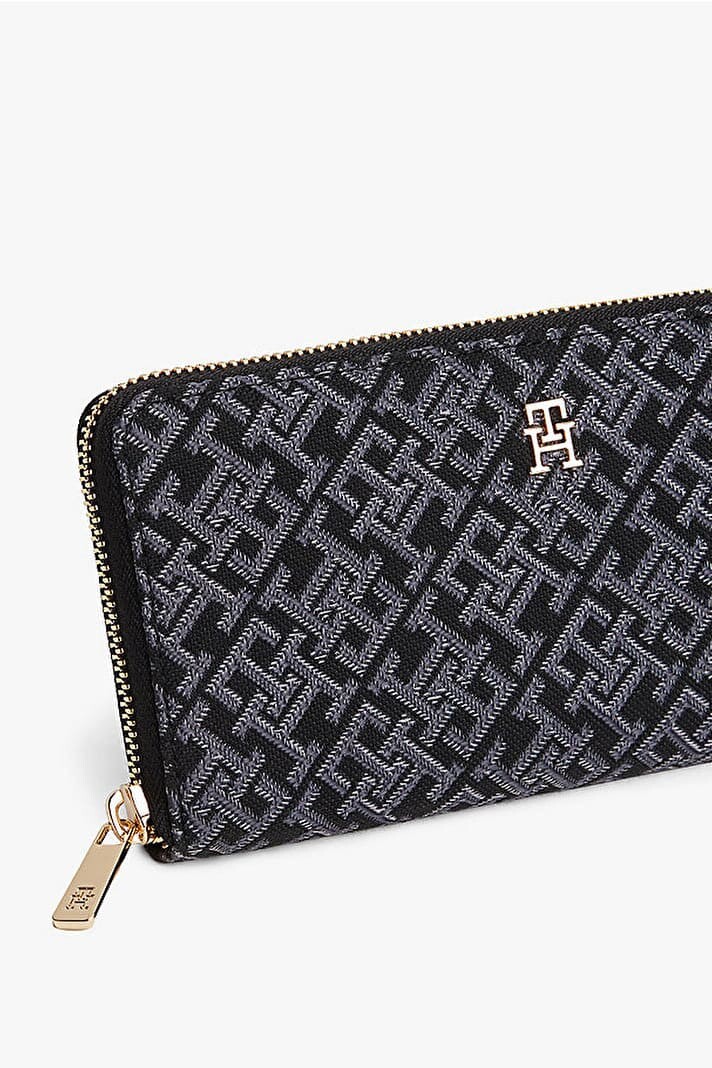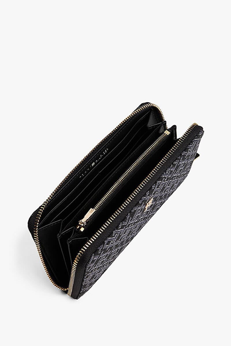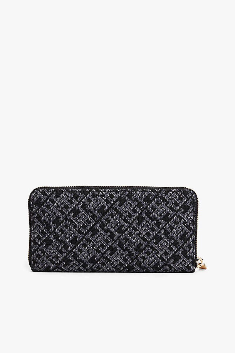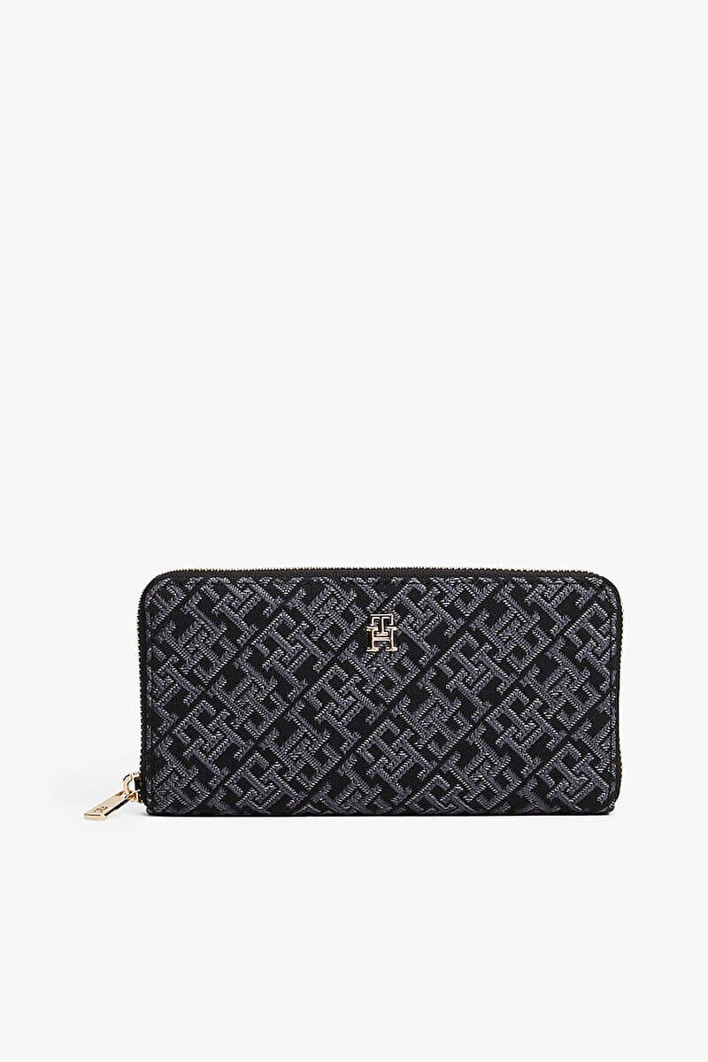 Siyahın asaletini özel jakar dokuma tekniğiyle buluşturan bu büyük boy cüzdan, geniş iç hacmi ve zarif tasarımıyla günlük stilinizin vazgeçilmezi olacak. Tam tur fermuarlı kapanış sistemi, eşyalarınızı güvenle taşımanızı sağlarken, iç kısımdaki çoklu bölmeler kartlarınız, kağıt paralarınız ve madeni paralarınız için mükemmel bir organizasyon sunar. Ön yüzündeki altın tonlu metal detay ve tüm yüzeyi kaplayan geometrik monogram desen, aksesuara lüks ve modern bir hava katar.
